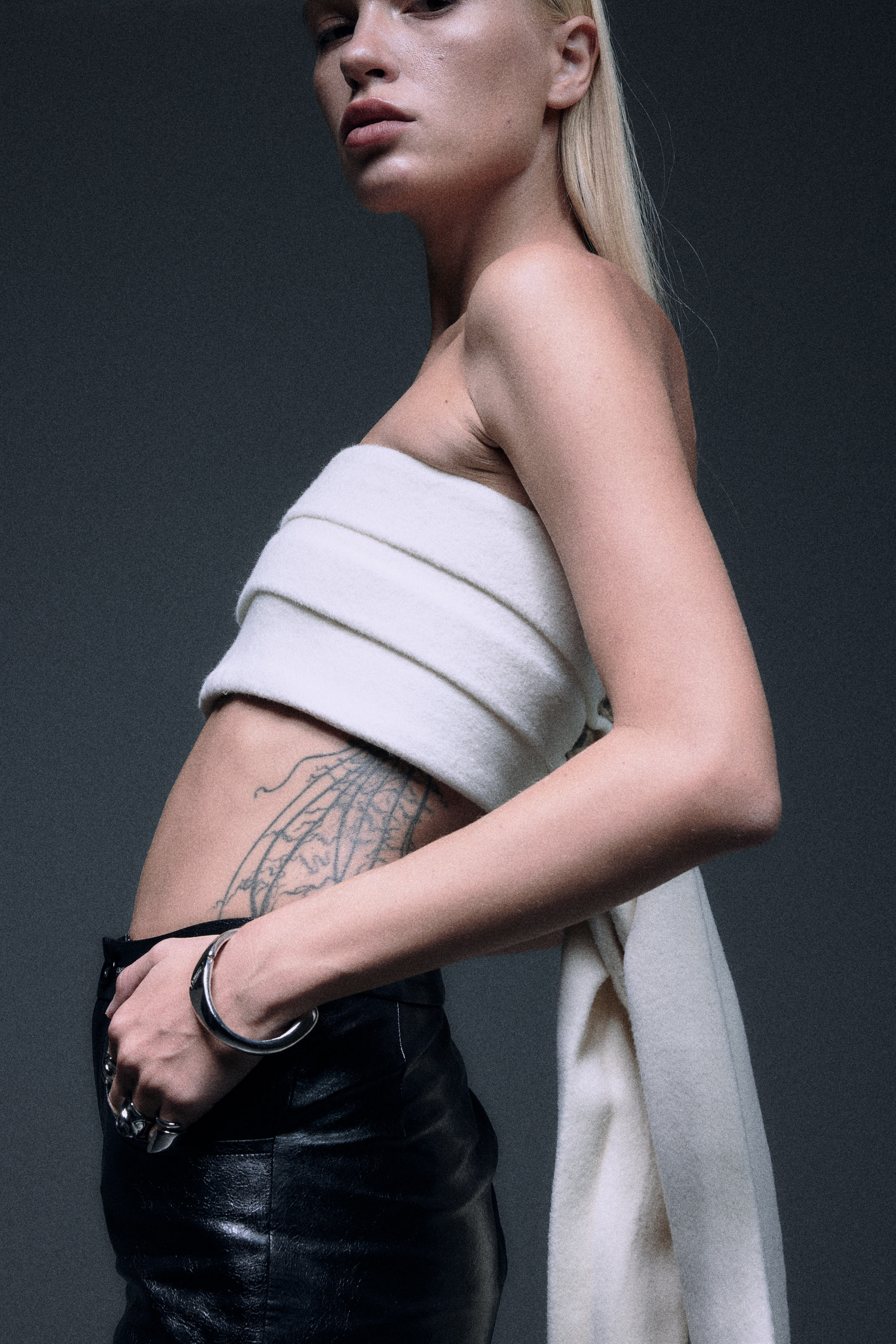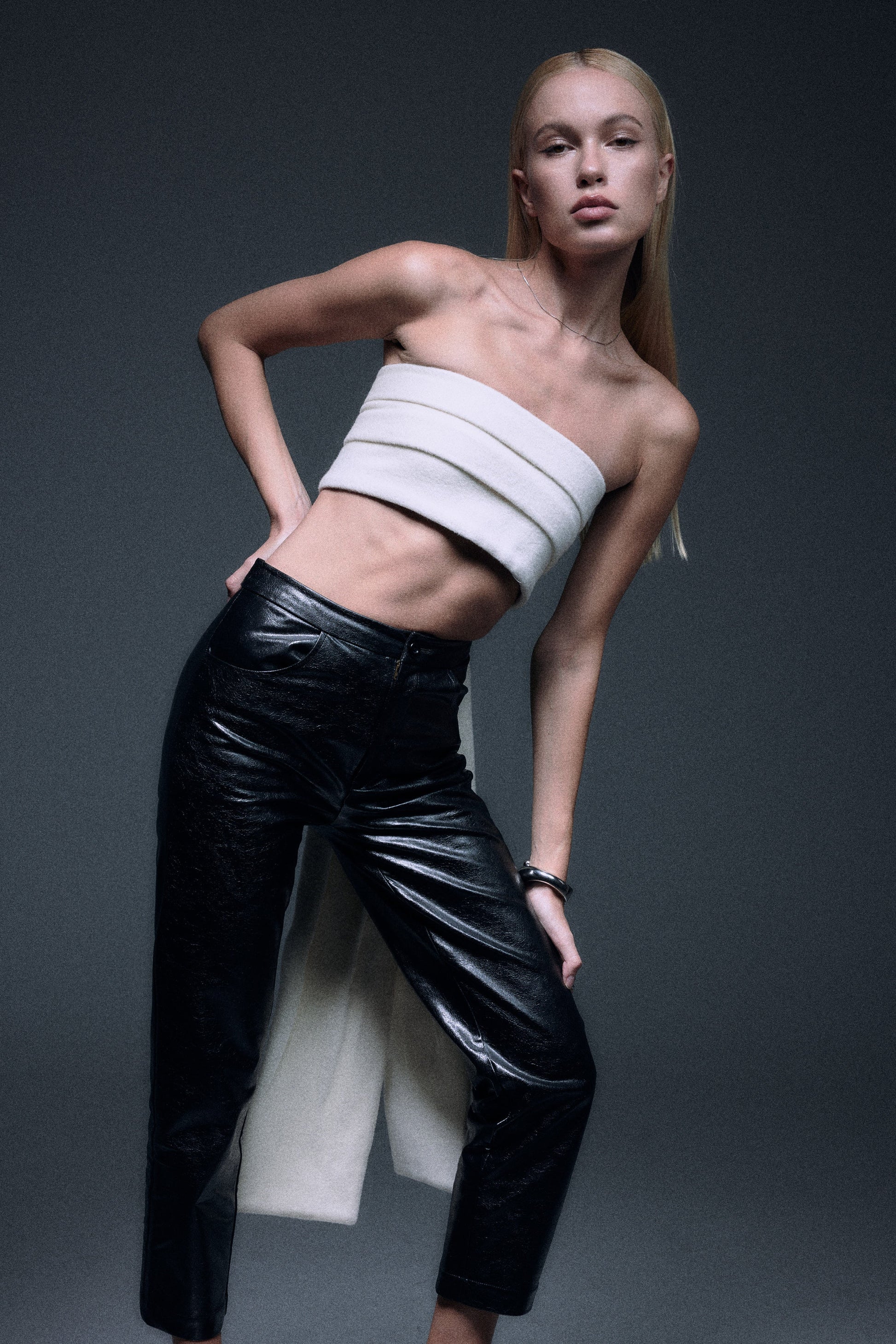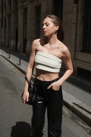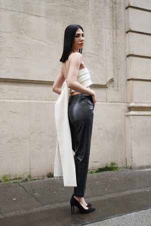 Strapless tube top with fine wool and fur in creamy white color, an elegant long tail with three bottons closure in the back to create a dramatic yet minimal sensuality.