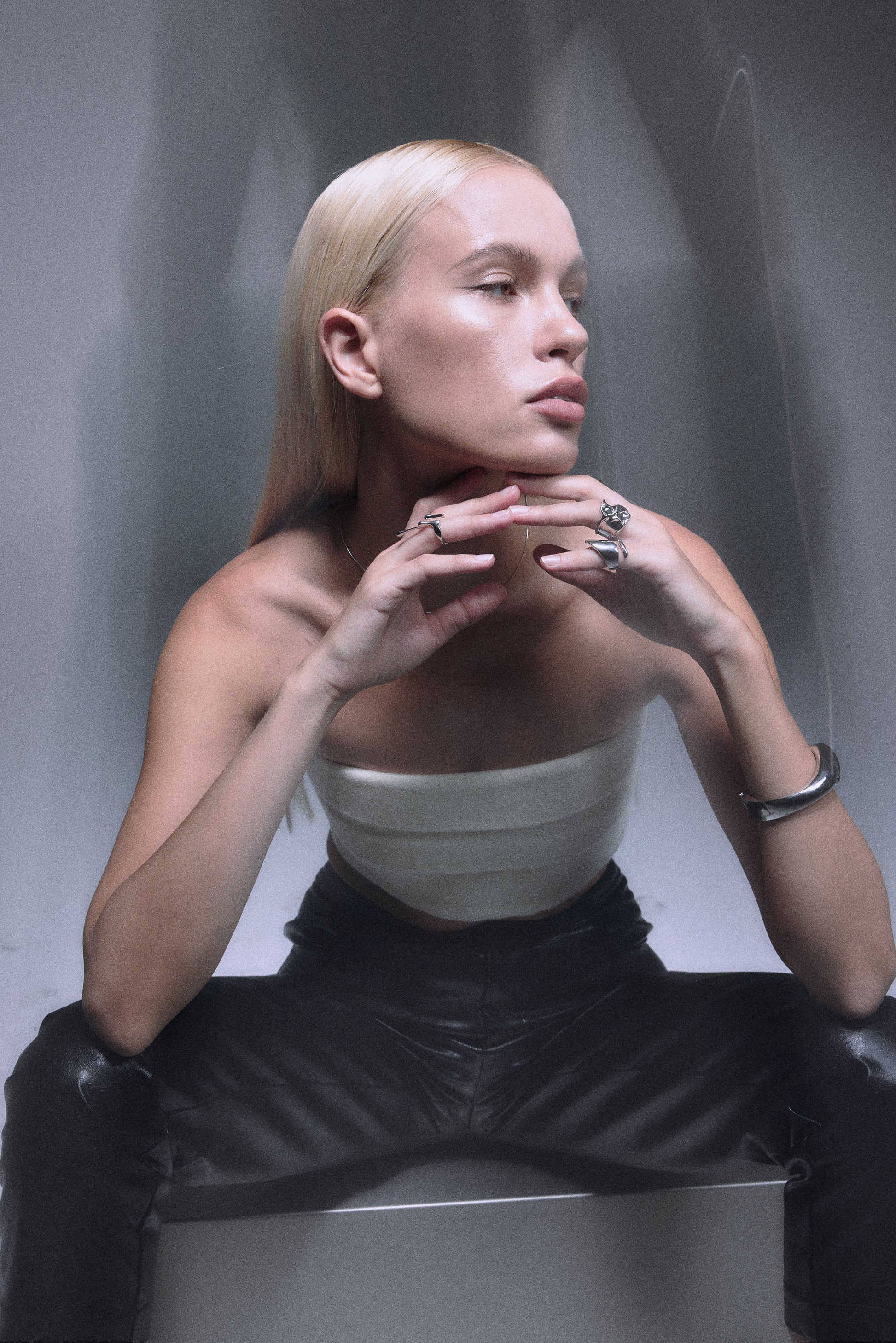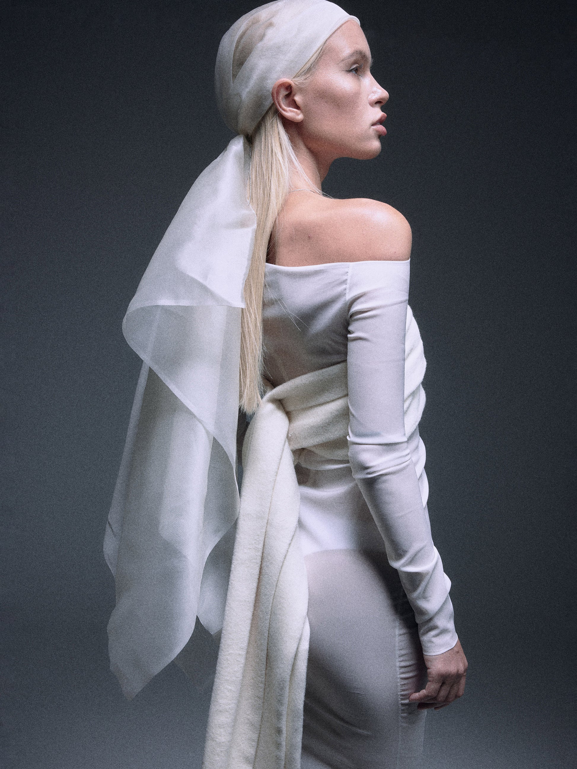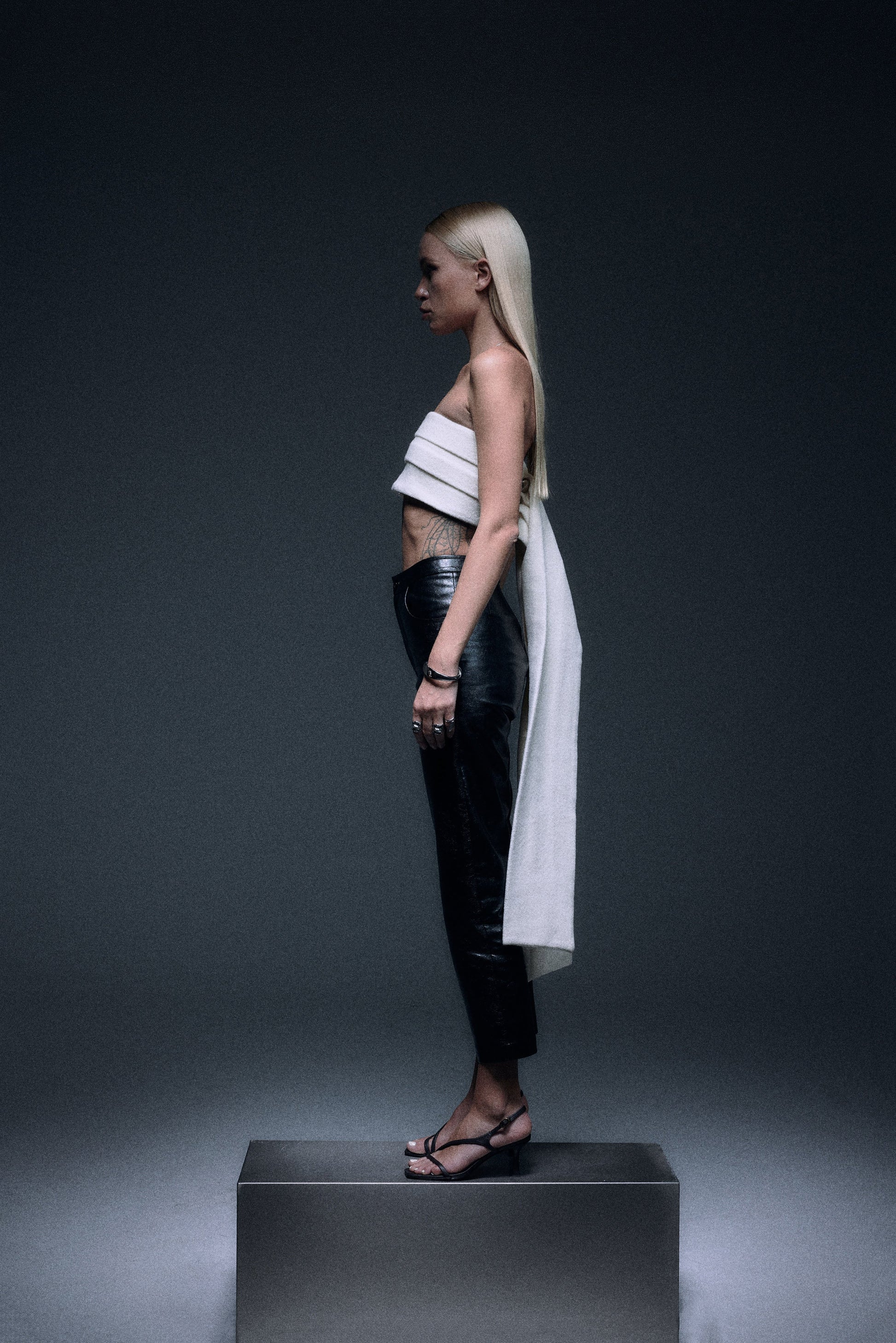Strapless tube top with fine wool and fur in creamy white color, an elegant long tail with three bottons closure in the back to create a dramatic yet minimal sensuality.