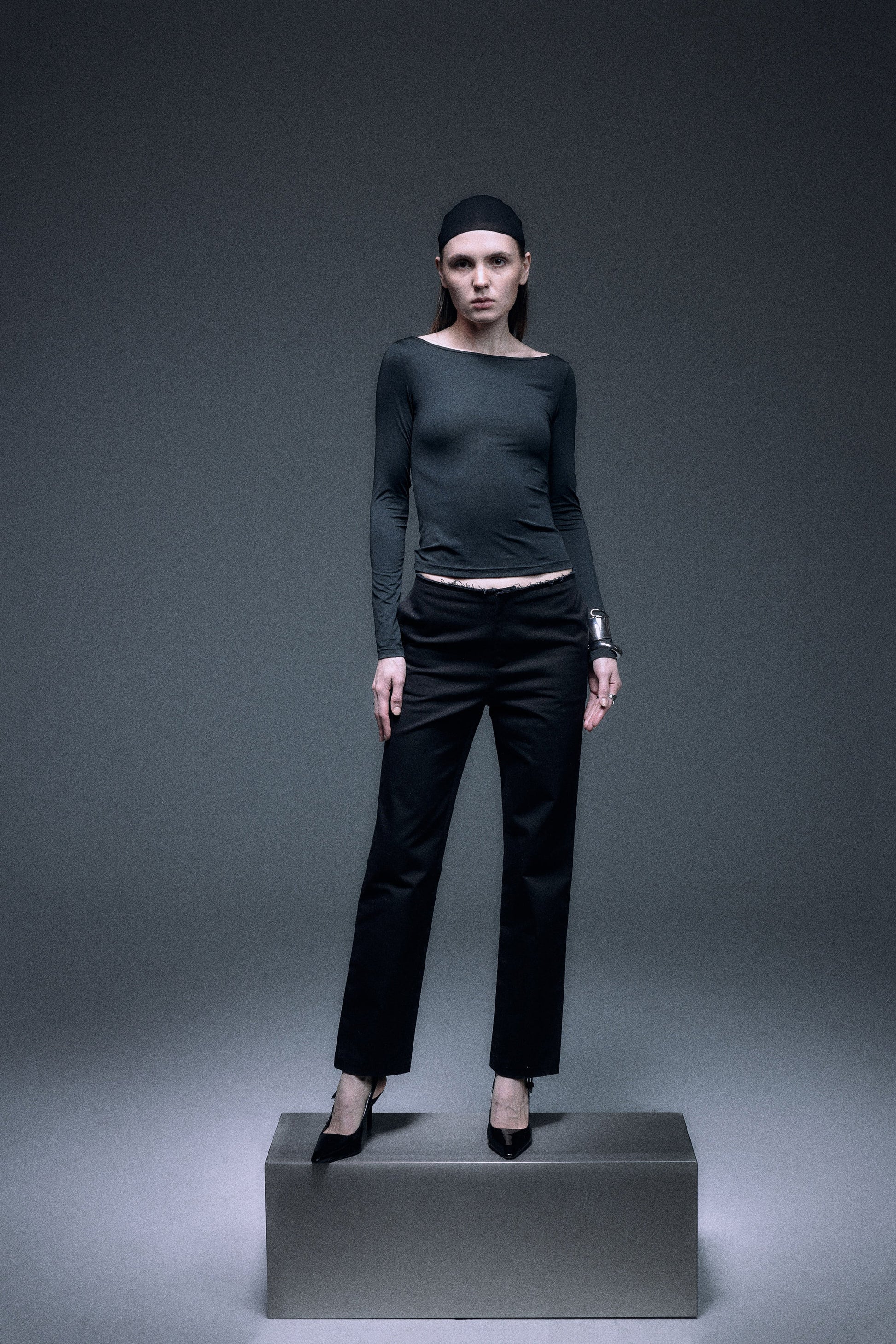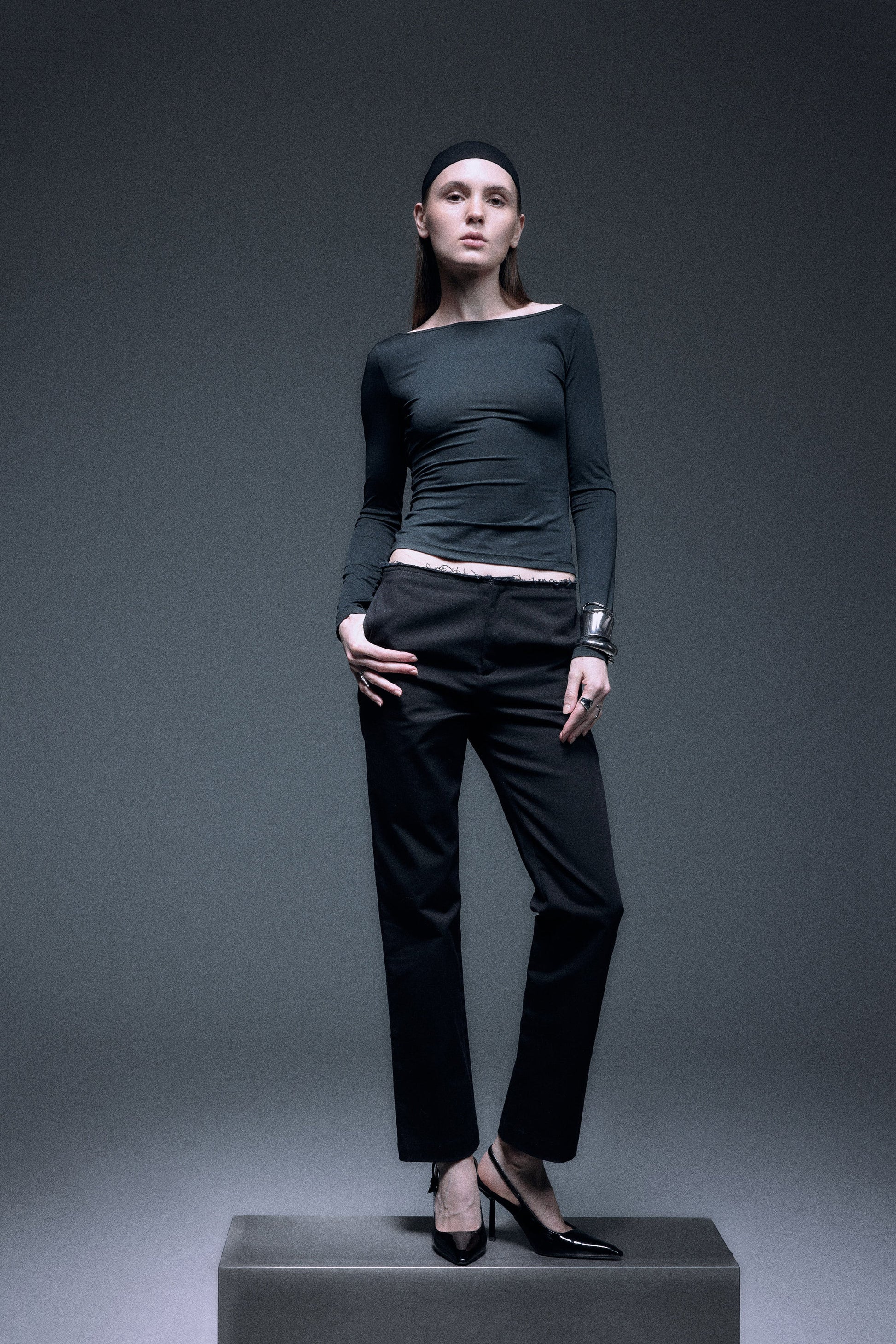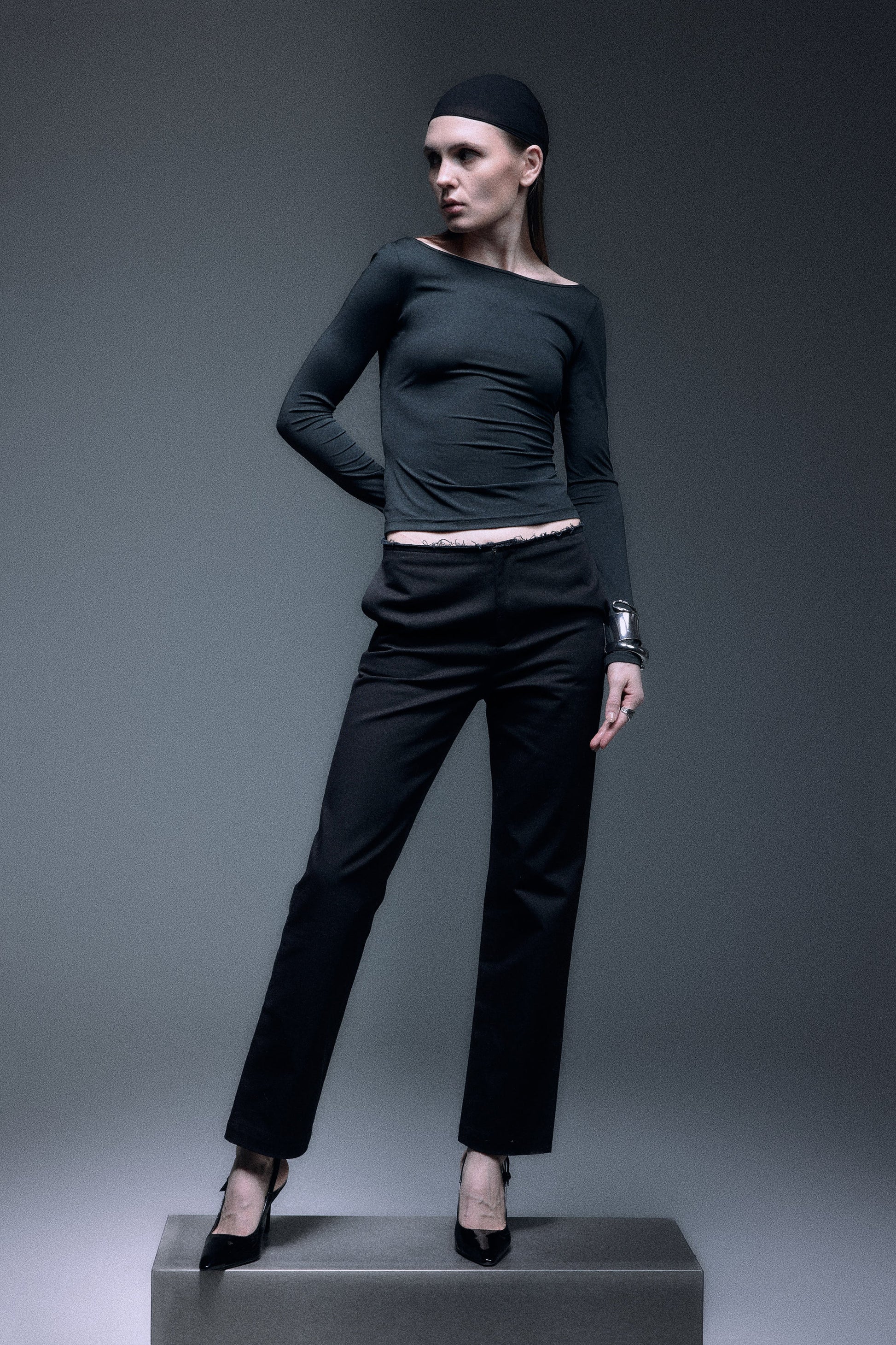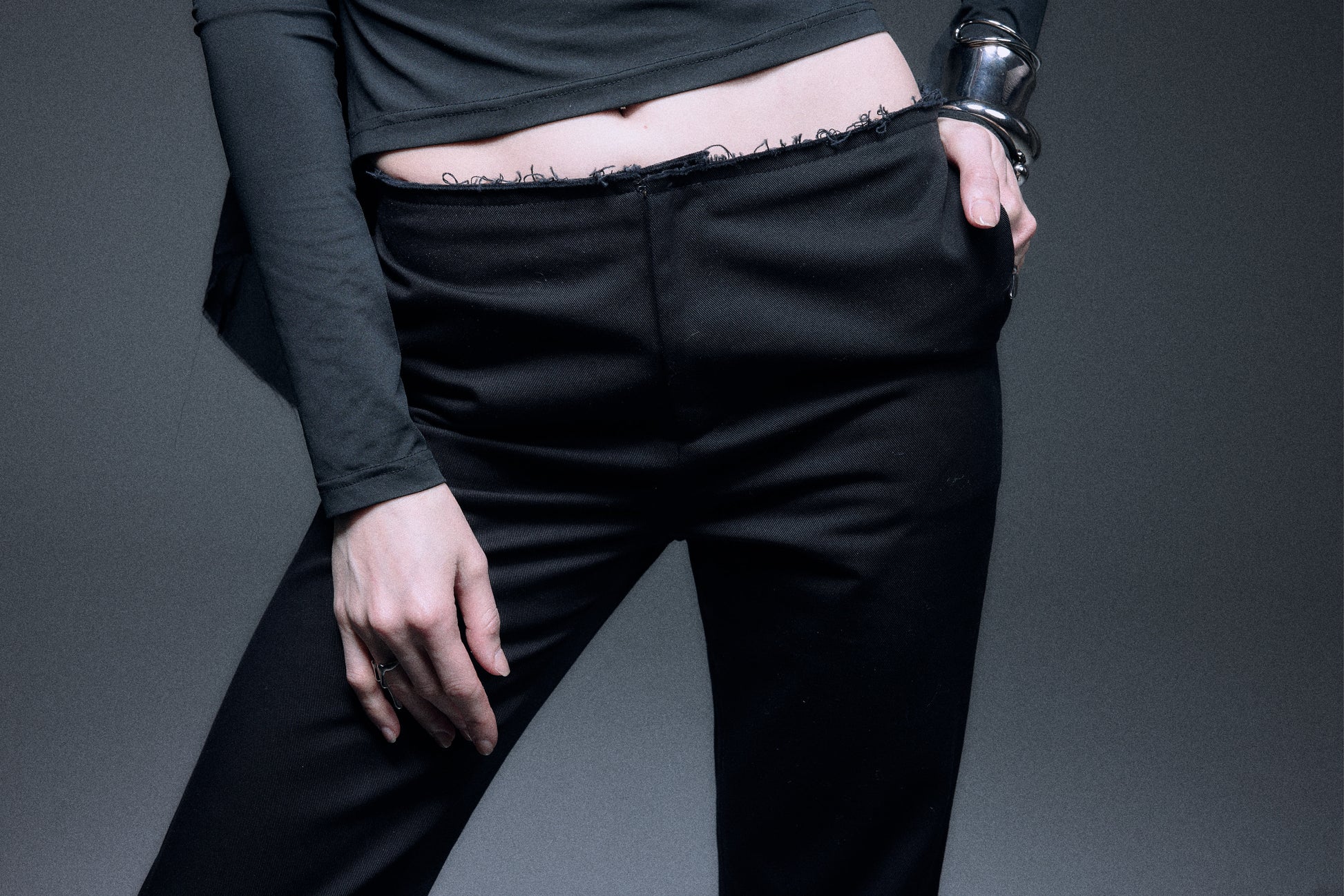 The BRUSH mid-waisted pants are made with fine cotton in black, designed with wide-leg silhouette, features handmade raw edges at the waist.