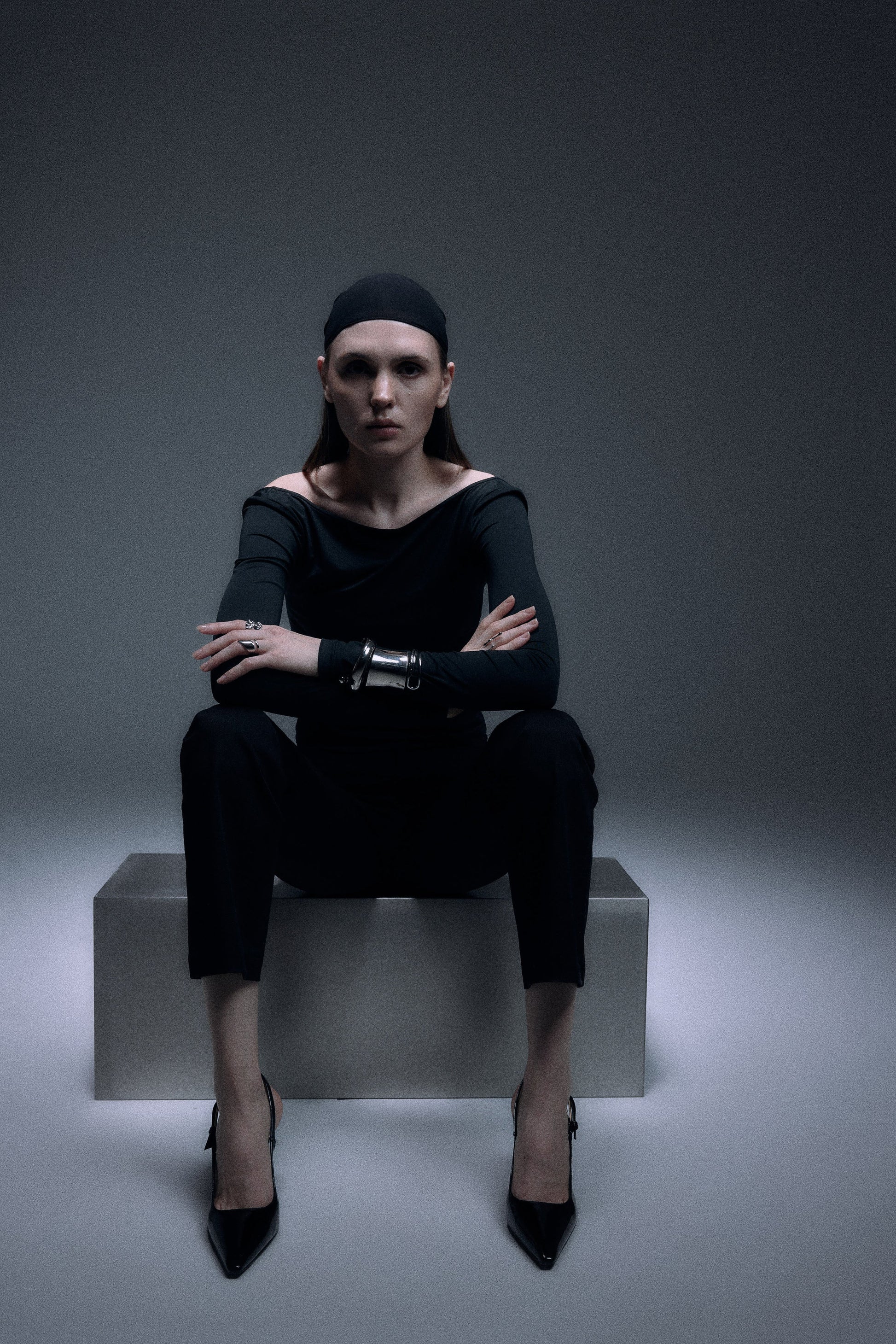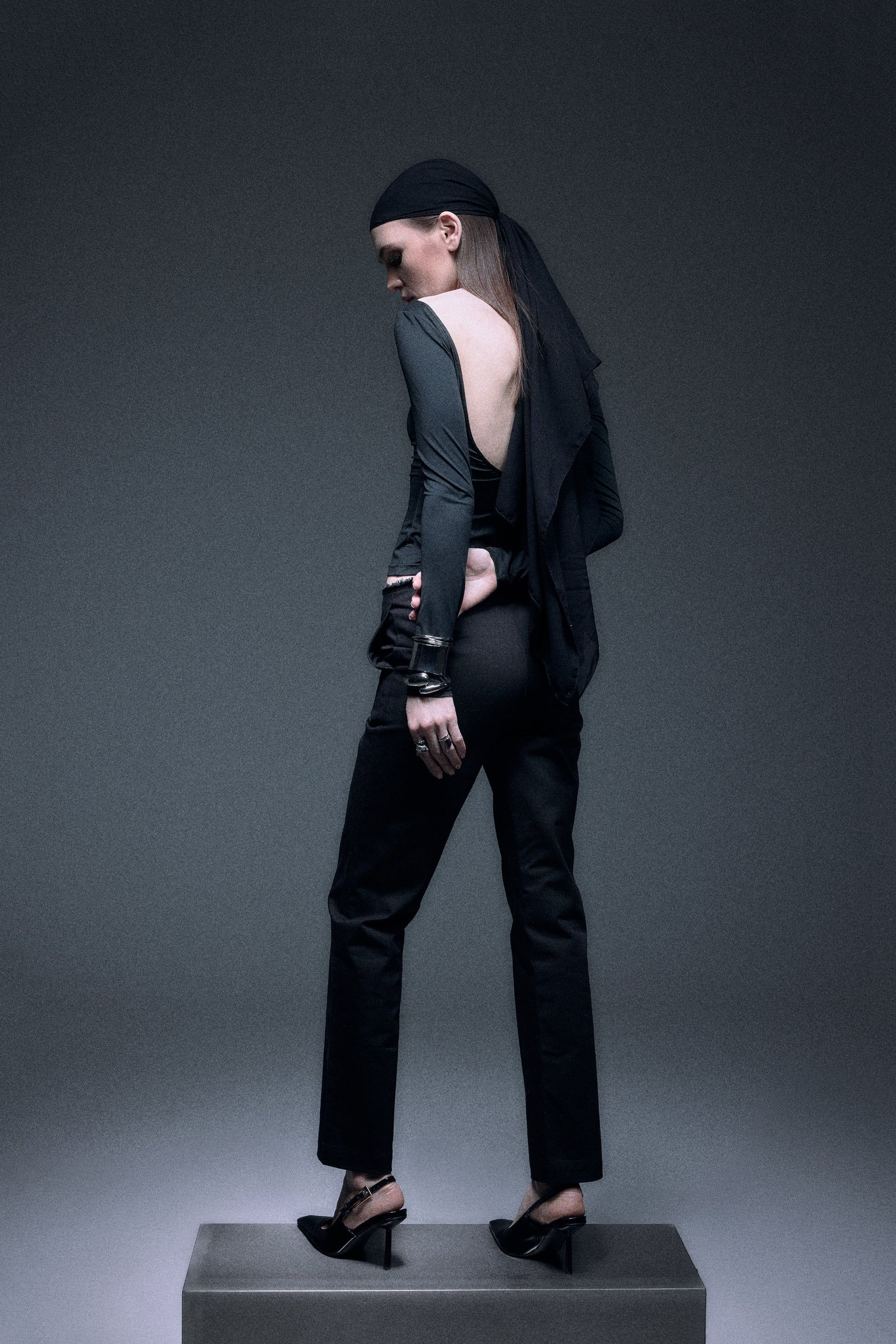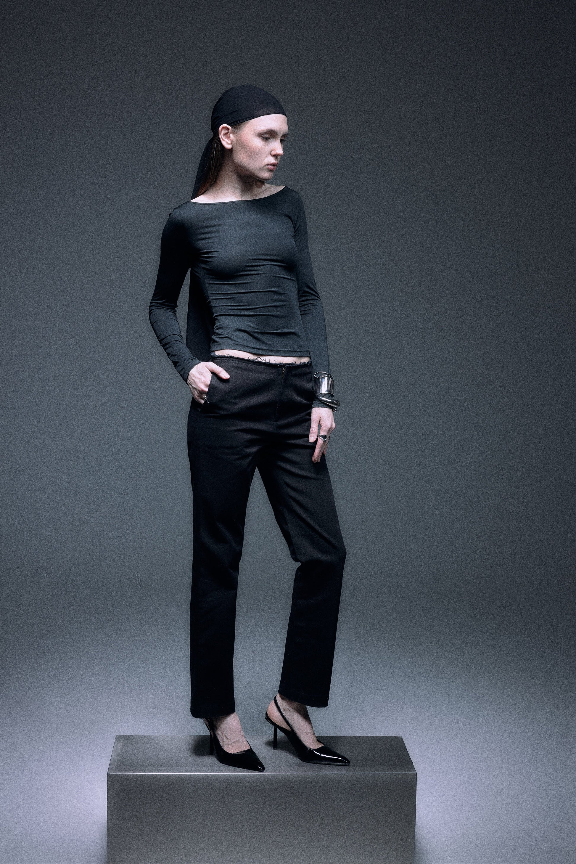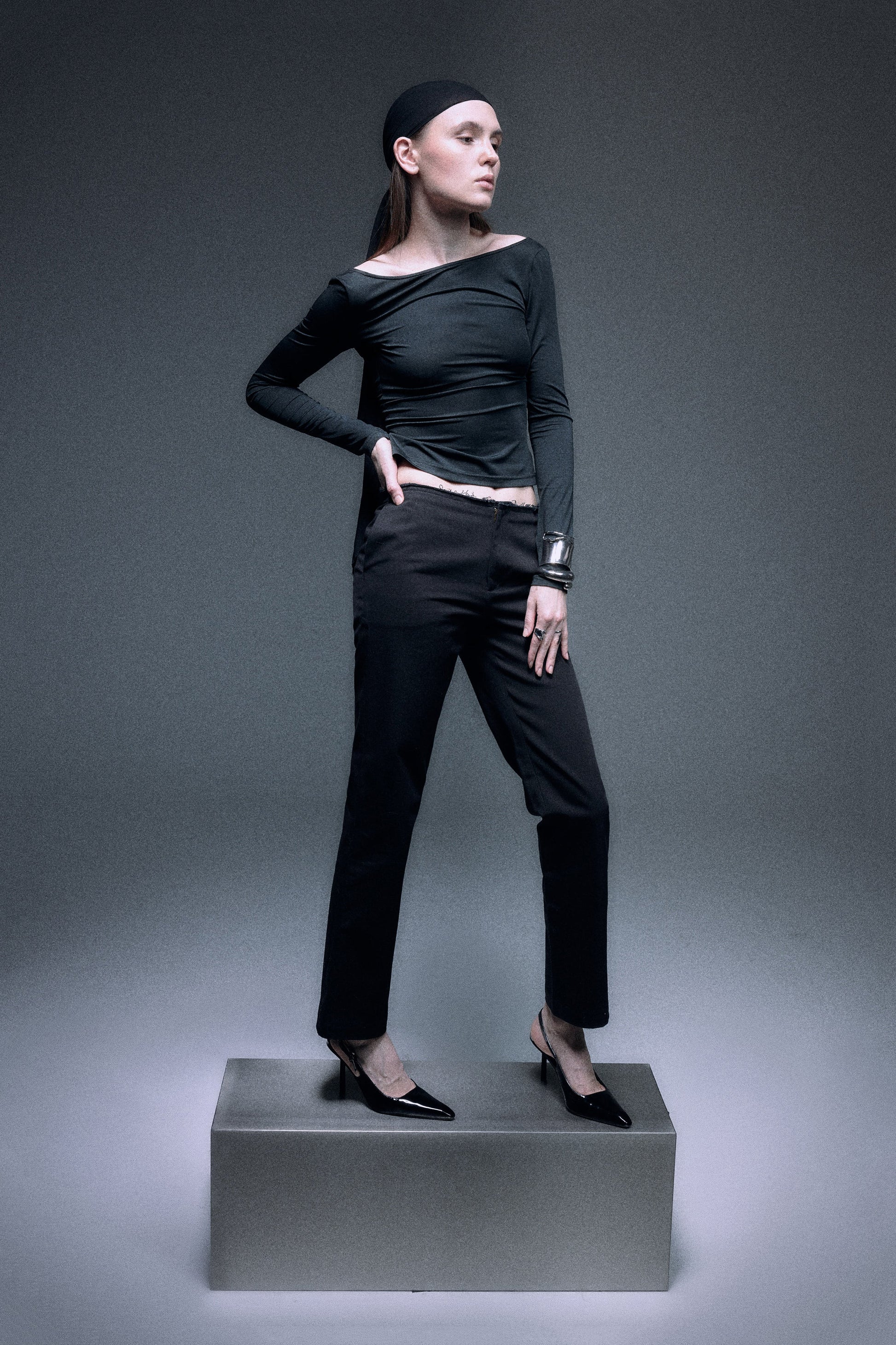 The BRUSH mid-waisted pants are made with fine cotton in black, designed with wide-leg silhouette, features handmade raw edges at the waist.