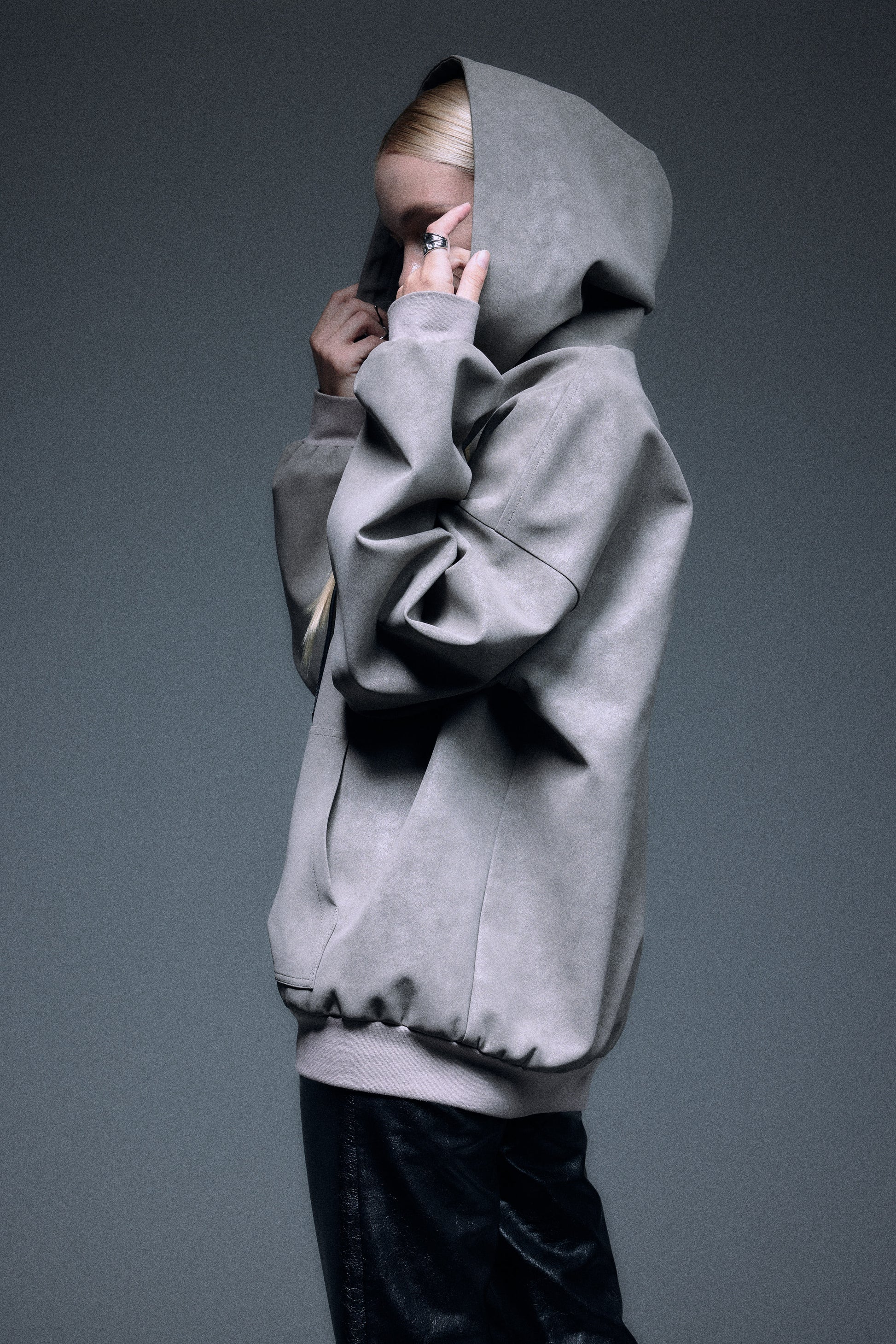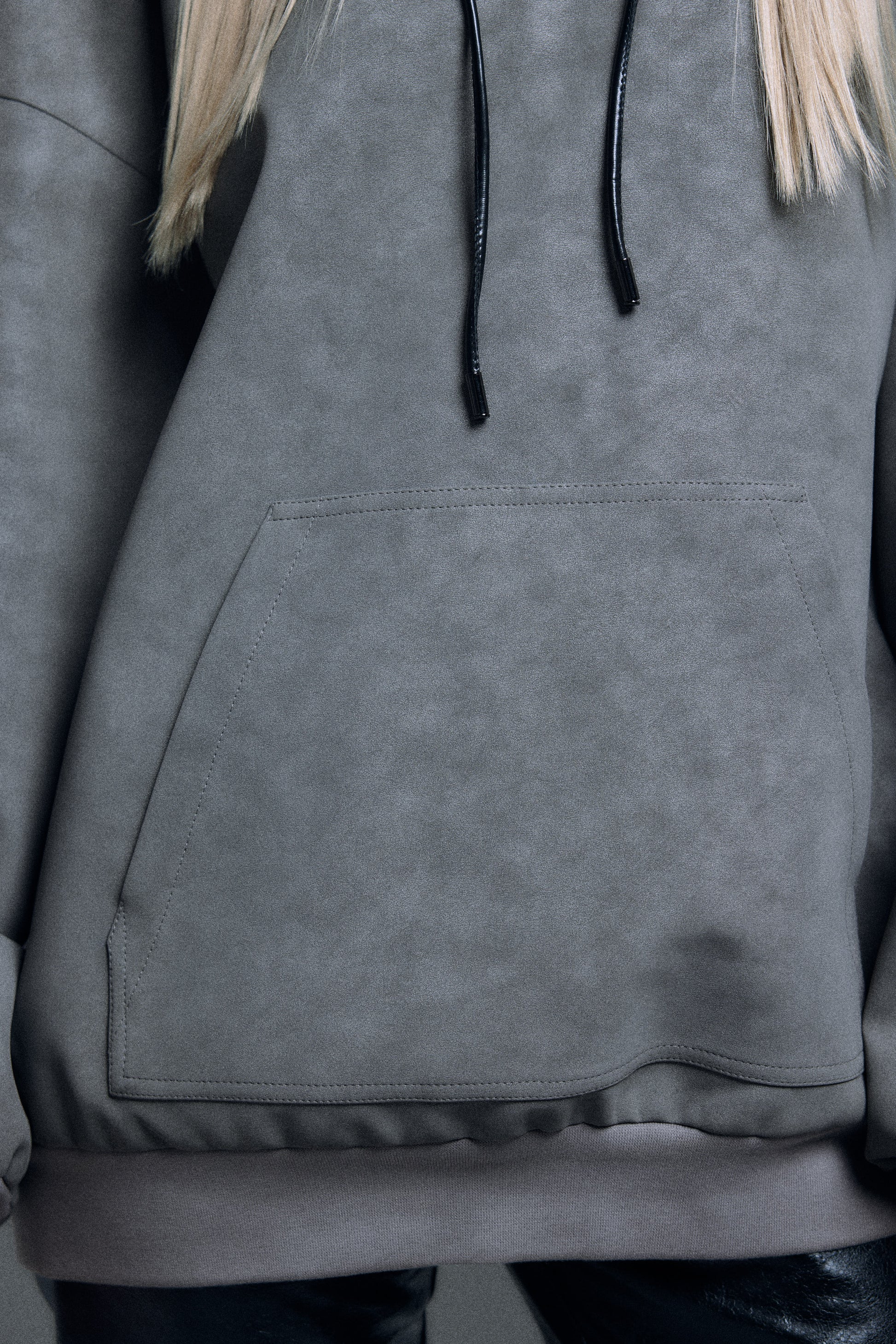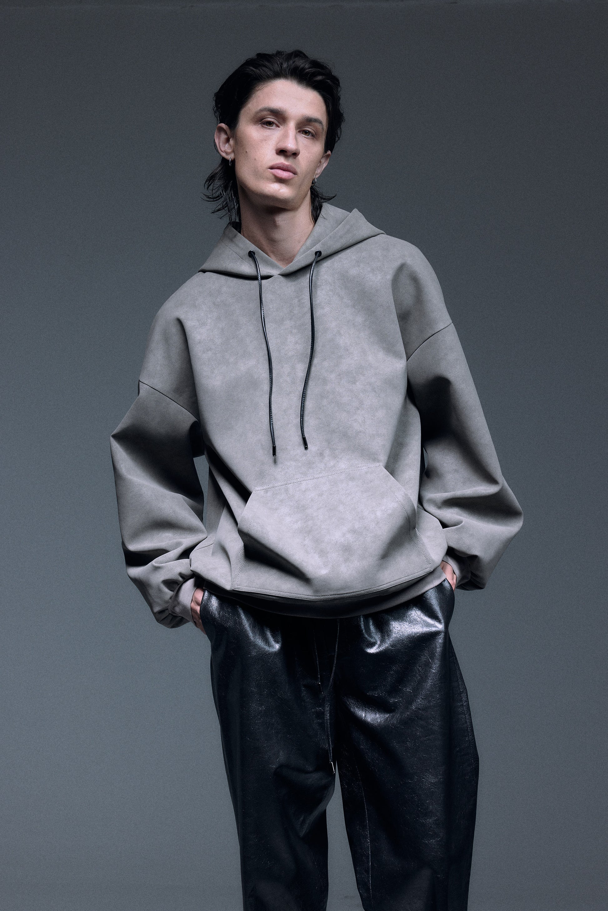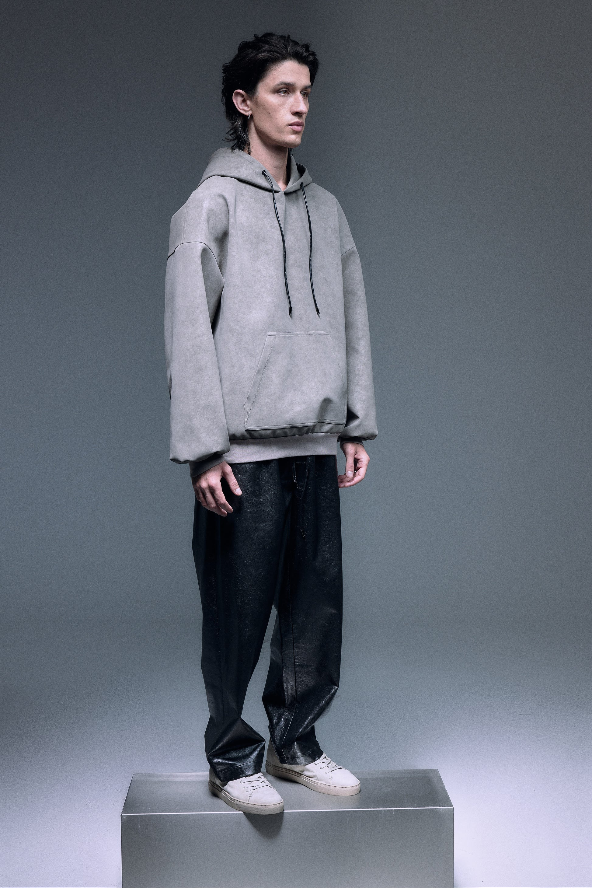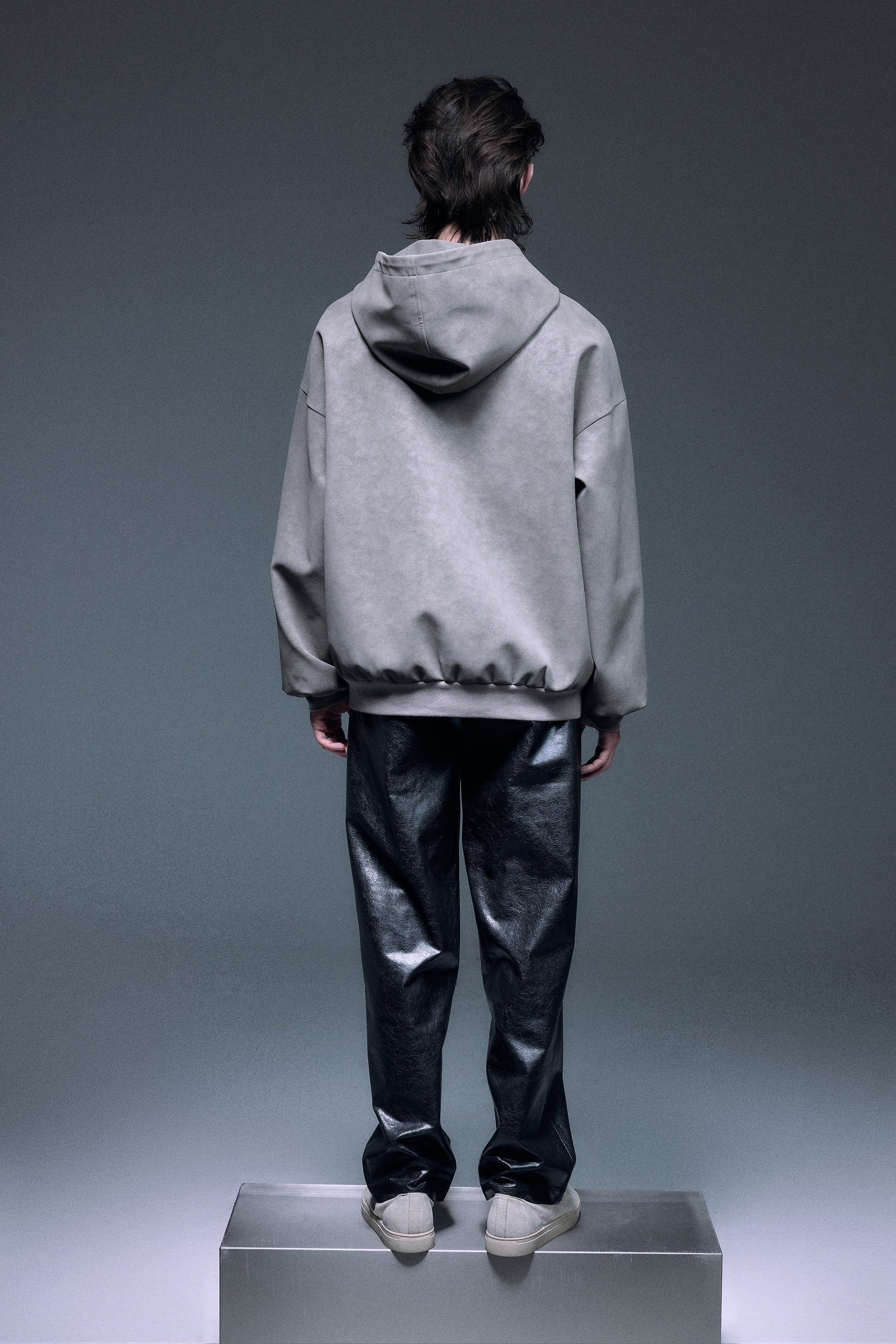 The unique vegan leather hoodie with matte texture in grey, volume in the body and sleeves creates a cropped silhouette, black leather hat strings and bottom center pocket provides more functionality to the hoodie.