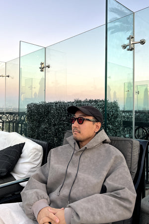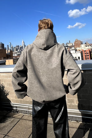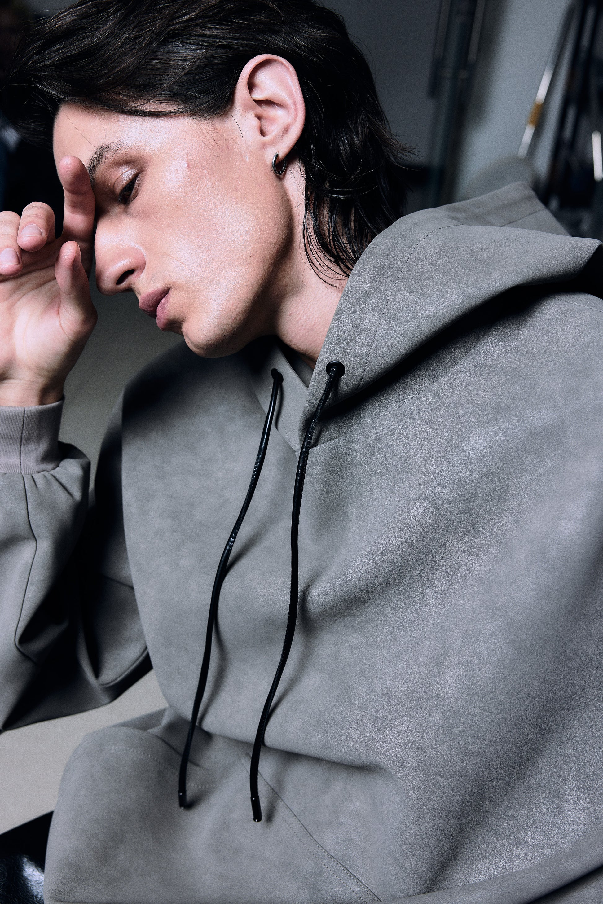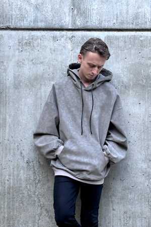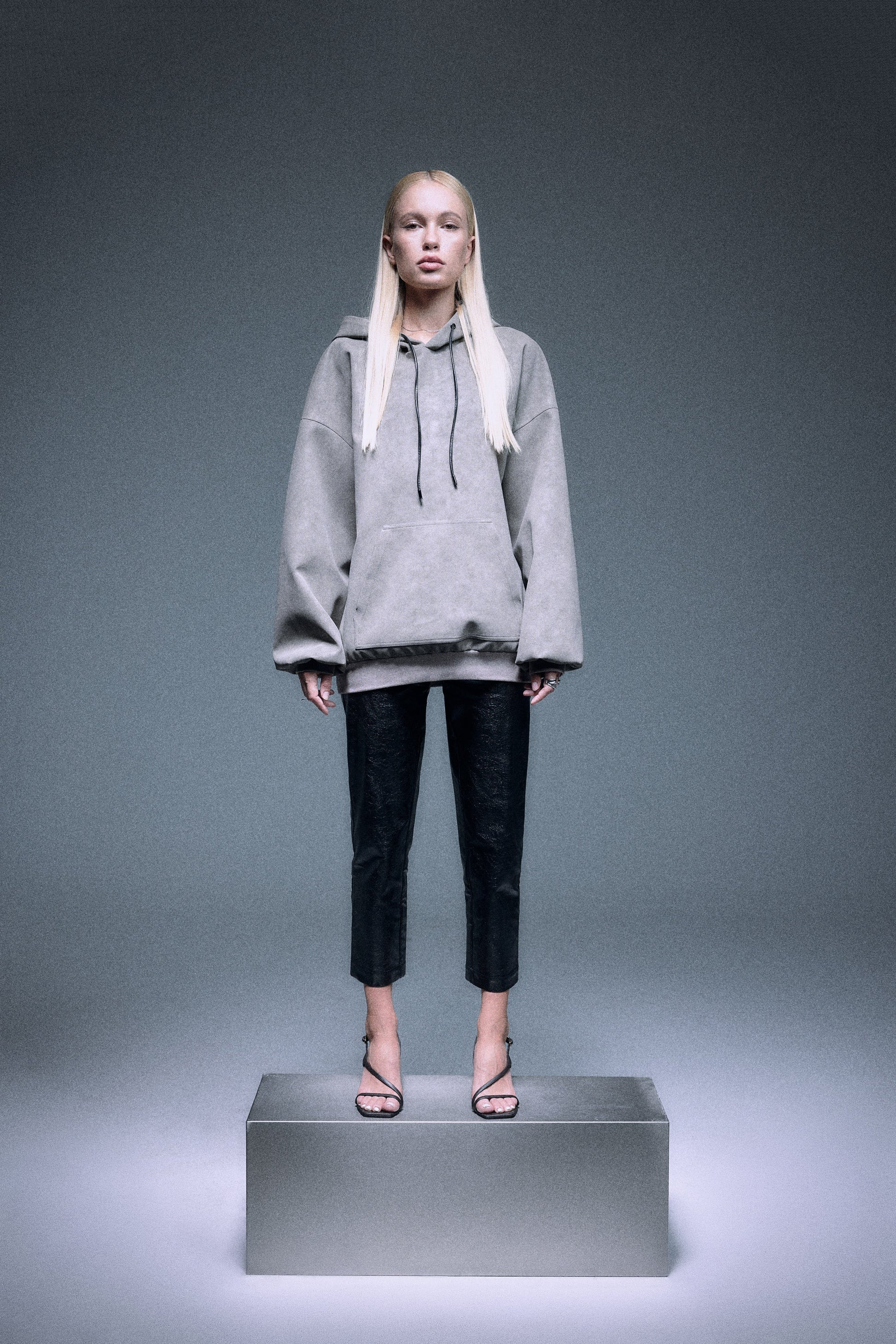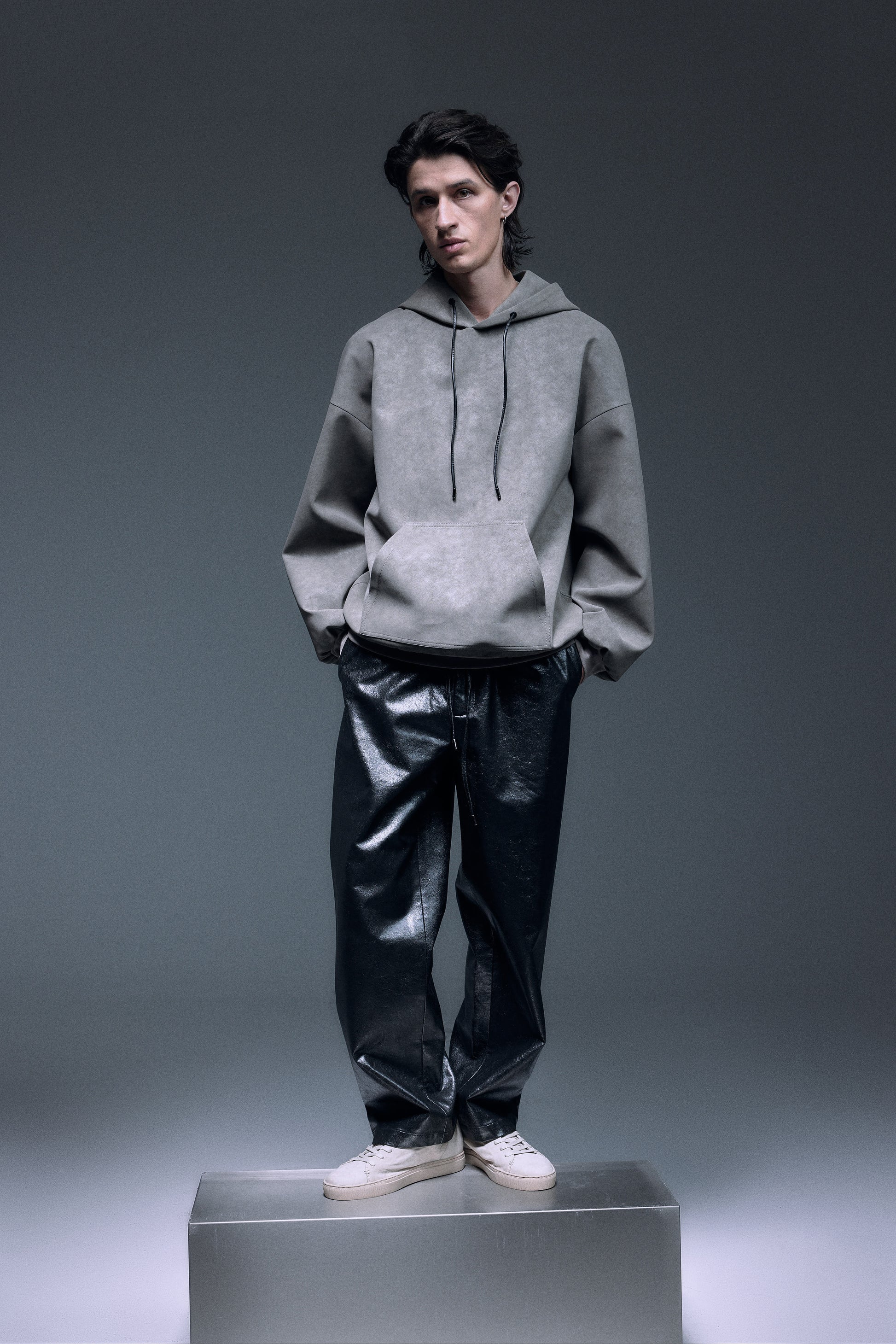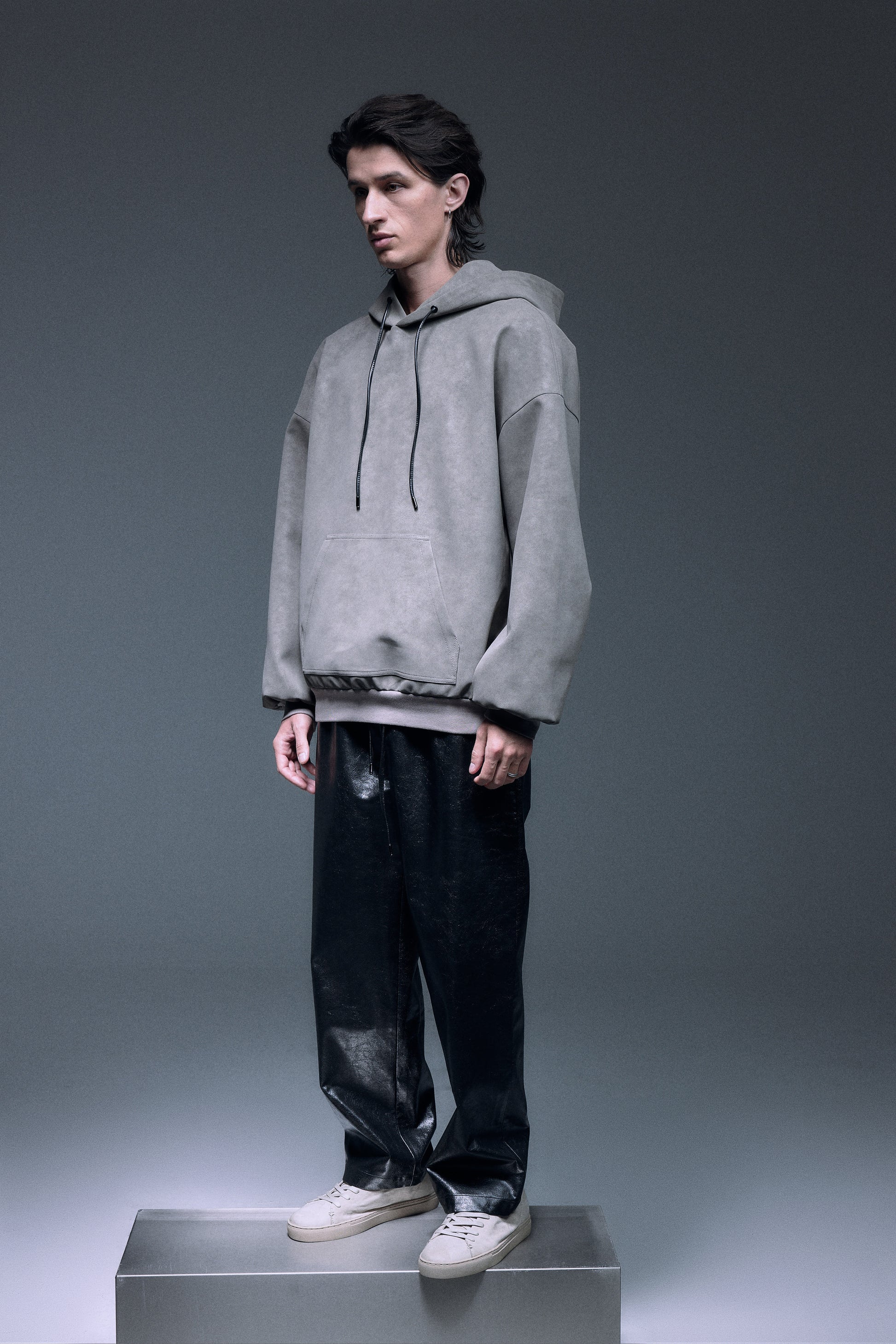 The unique vegan leather hoodie with matte texture in grey, volume in the body and sleeves creates a cropped silhouette, black leather hat strings and bottom center pocket provides more functionality to the hoodie.