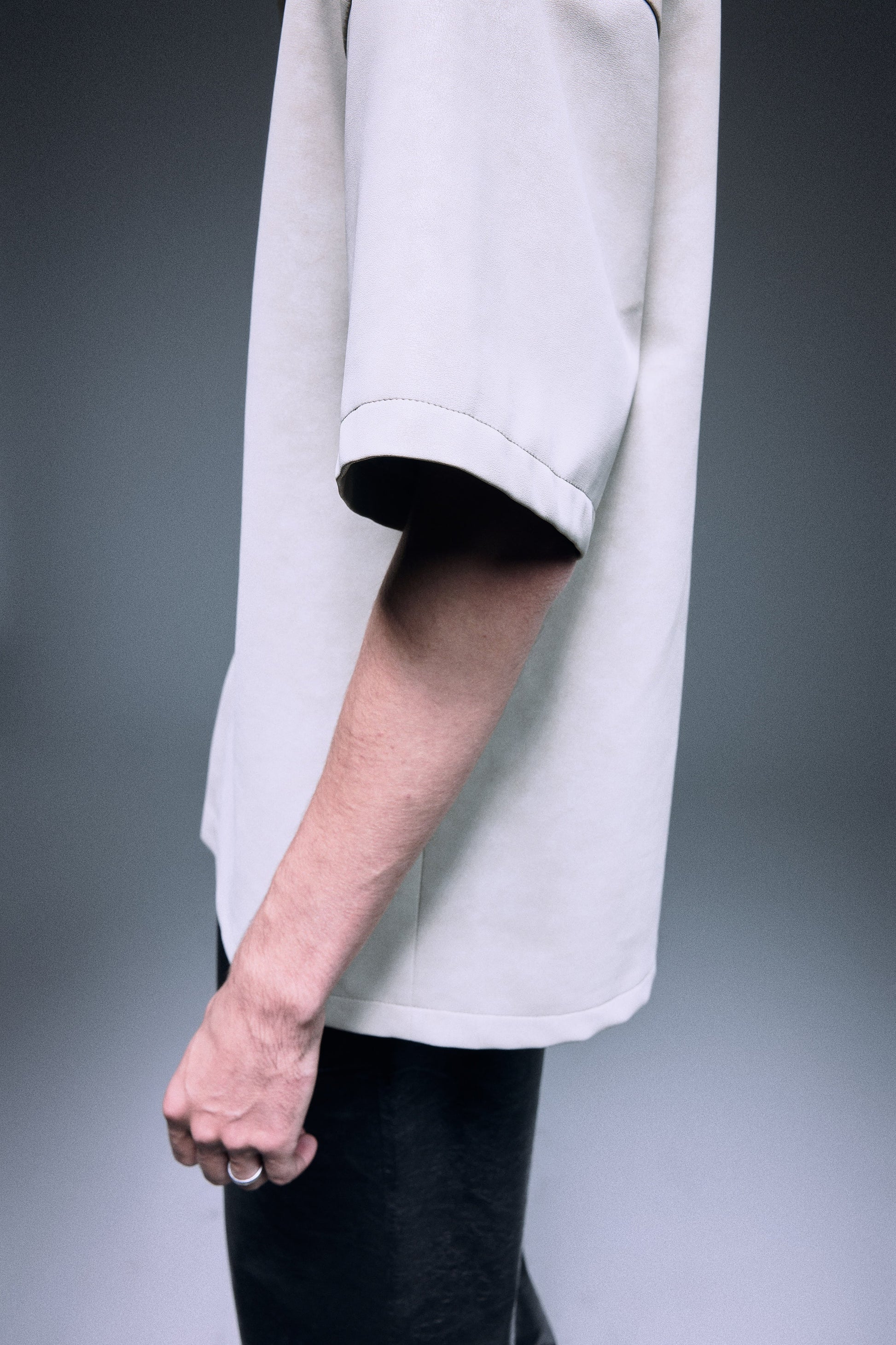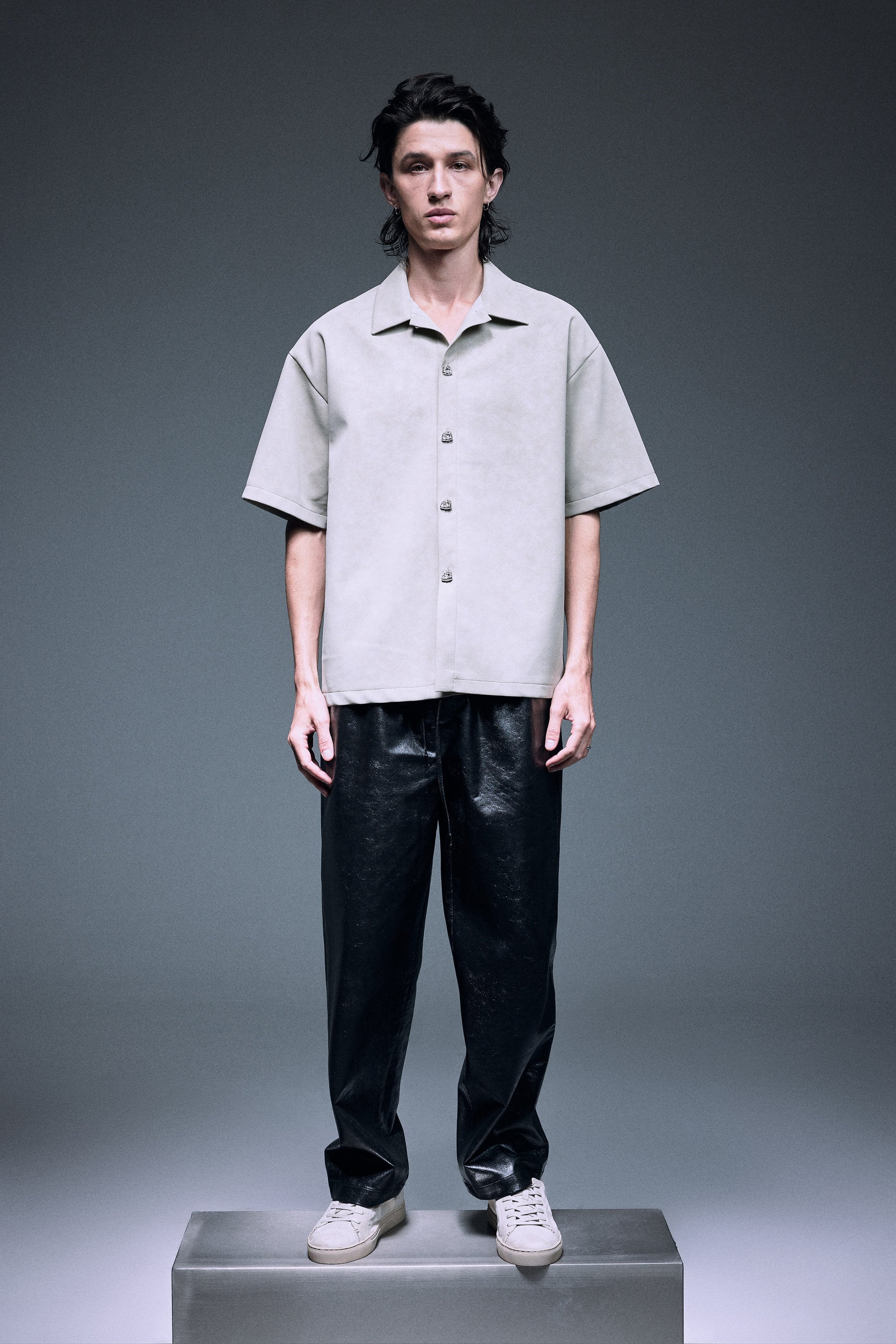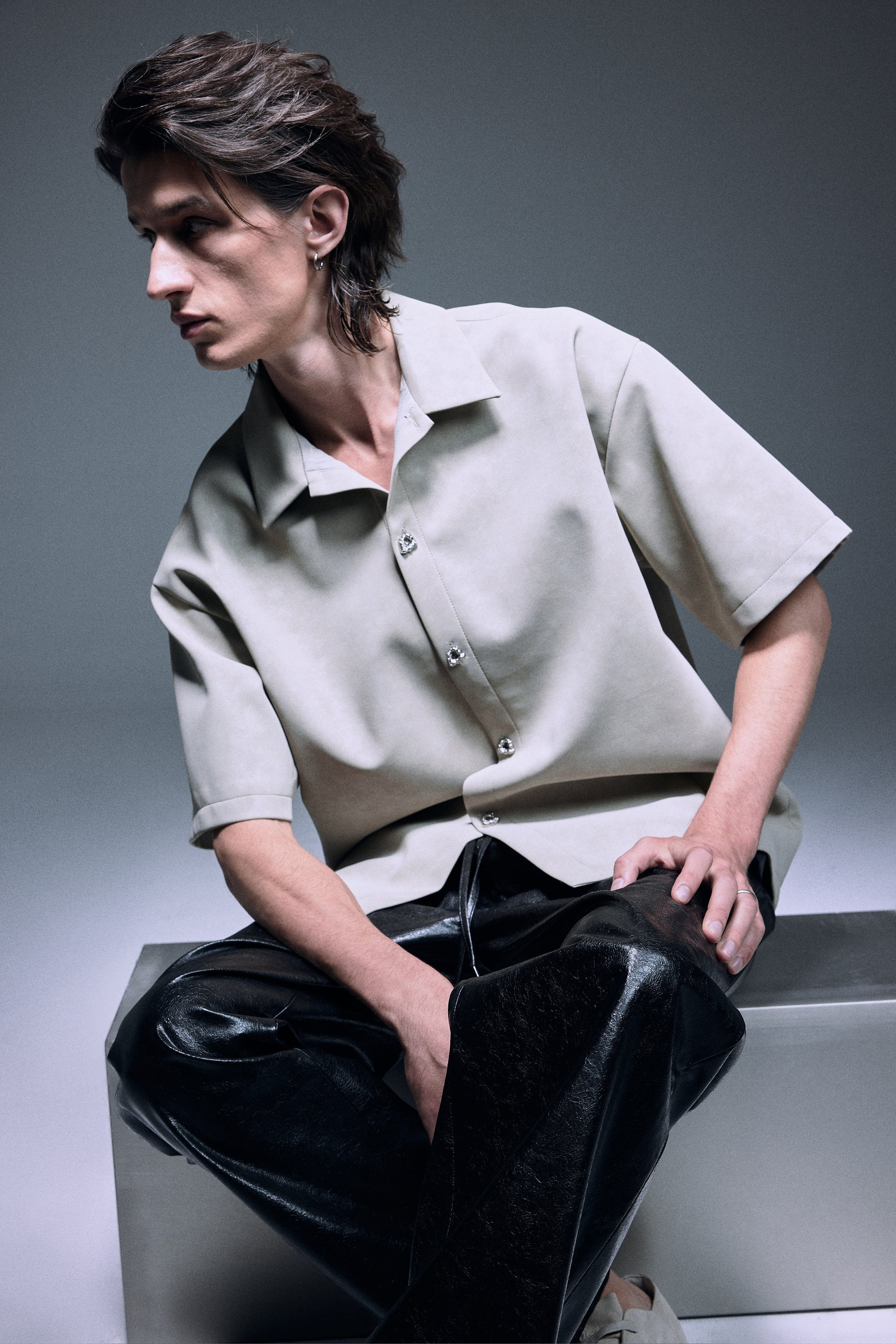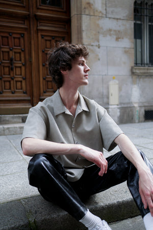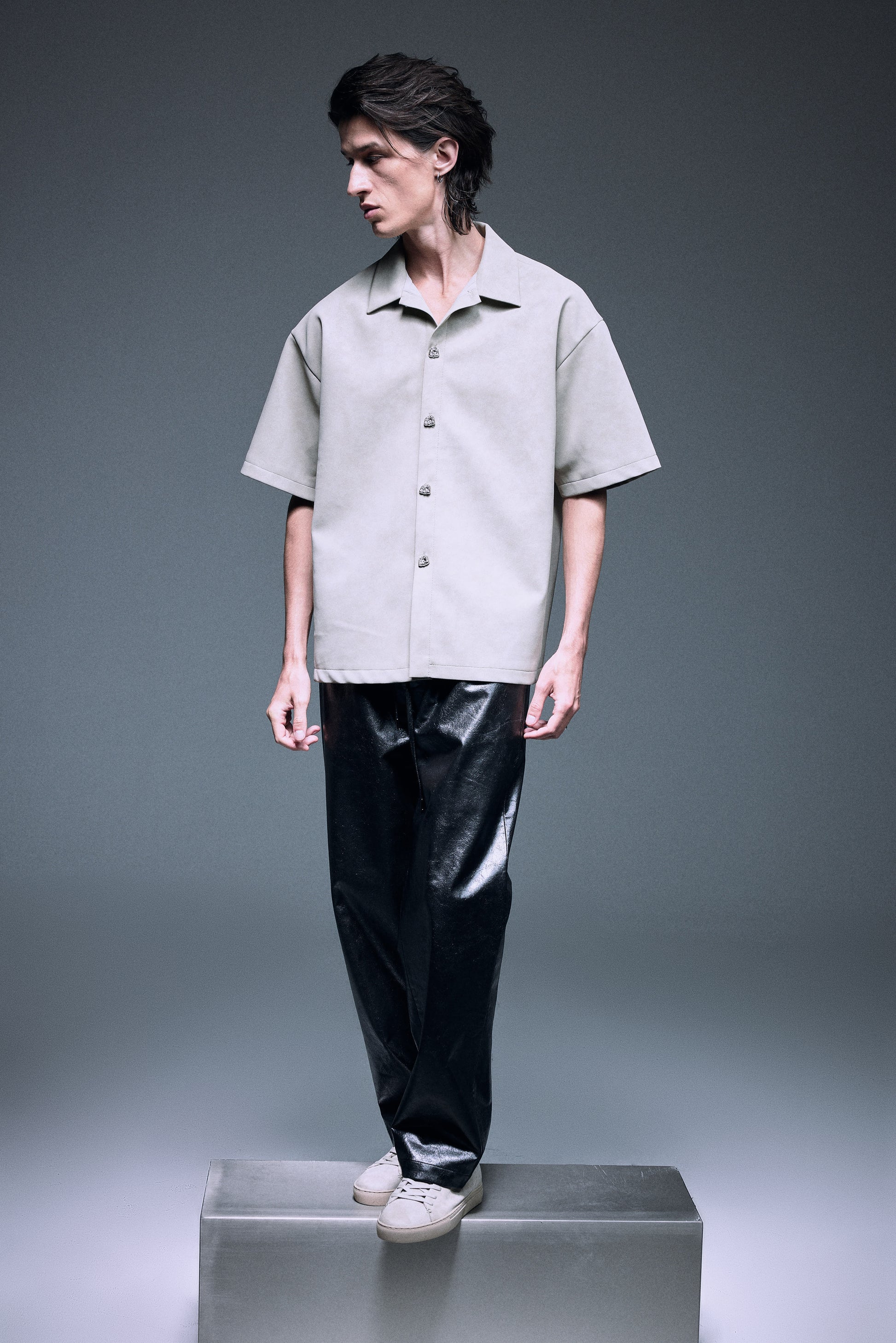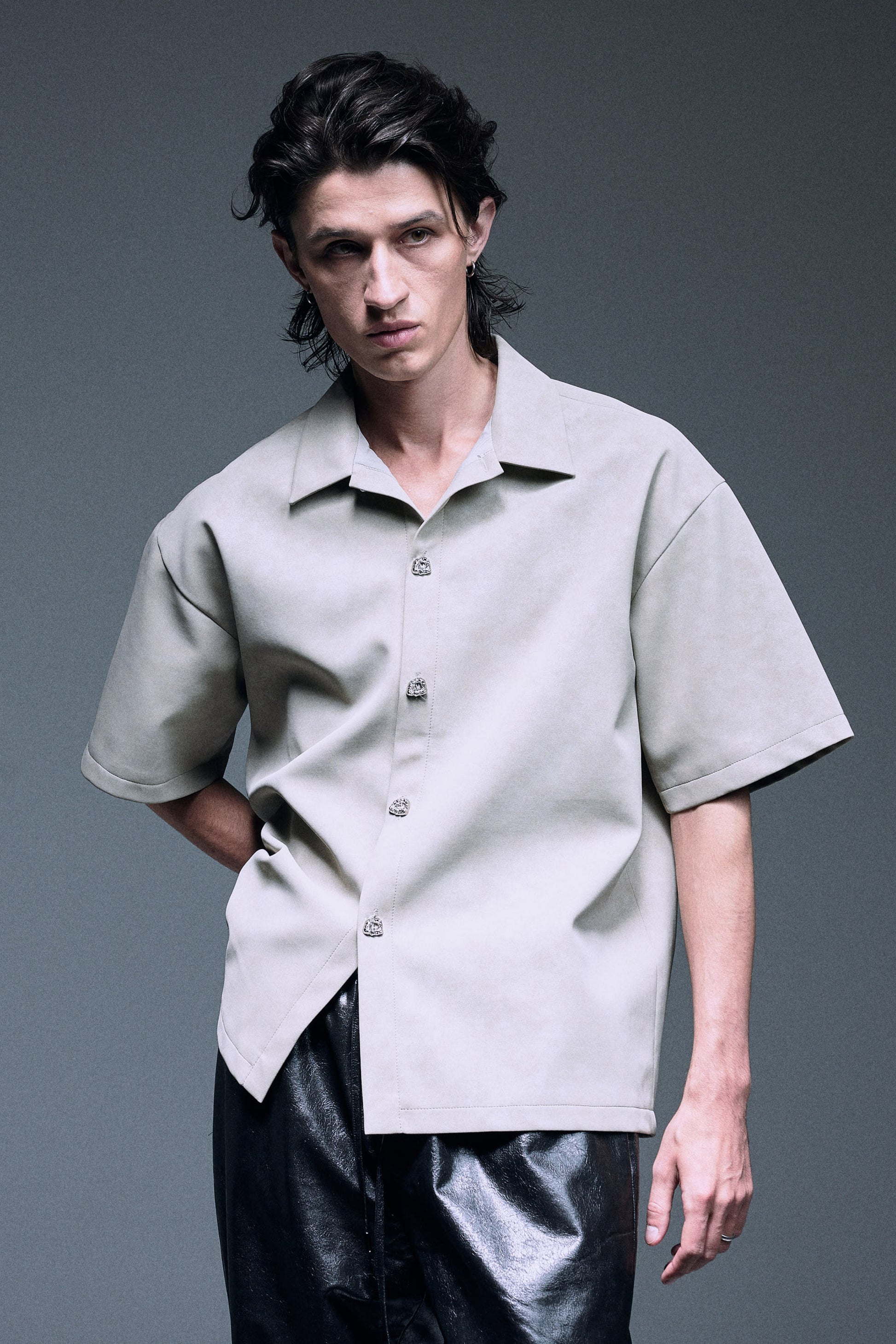 The unique vegan leather shirt in a special matte texture light creamy grey green, finished with silver knot twisted fine buttons, slightly oversized shoulder creates a bold yet elegant silhouette.