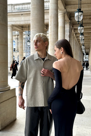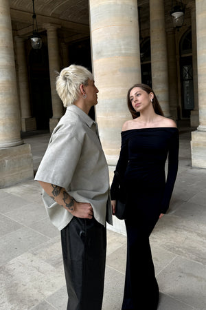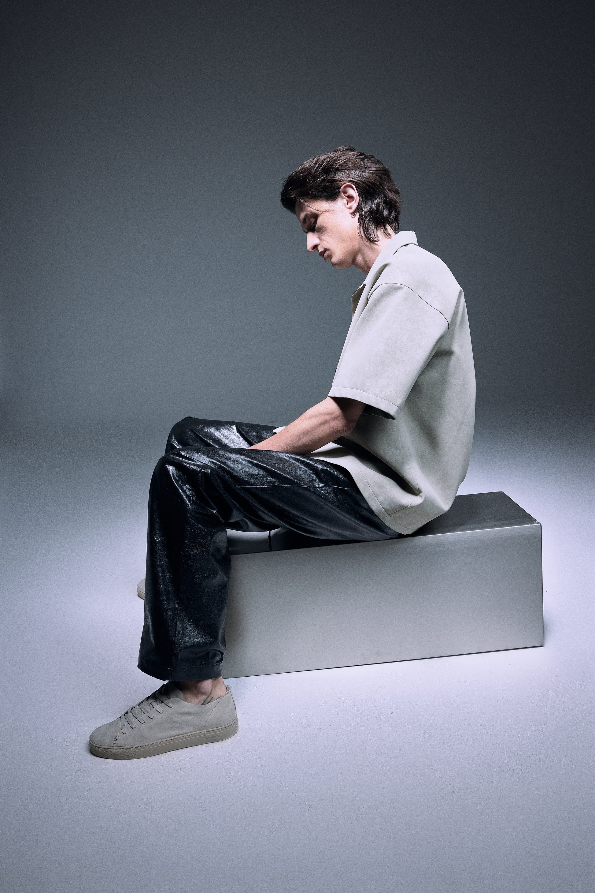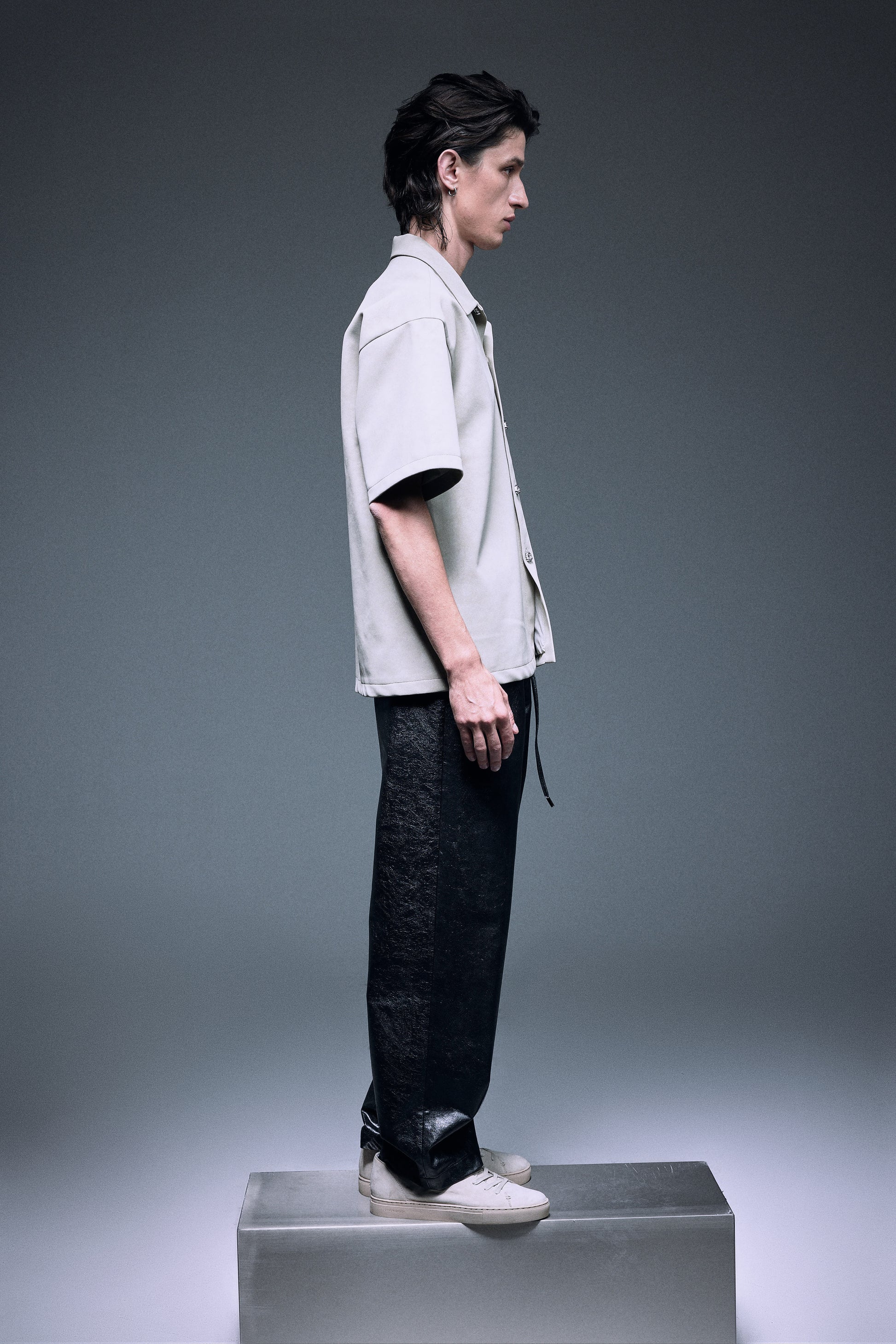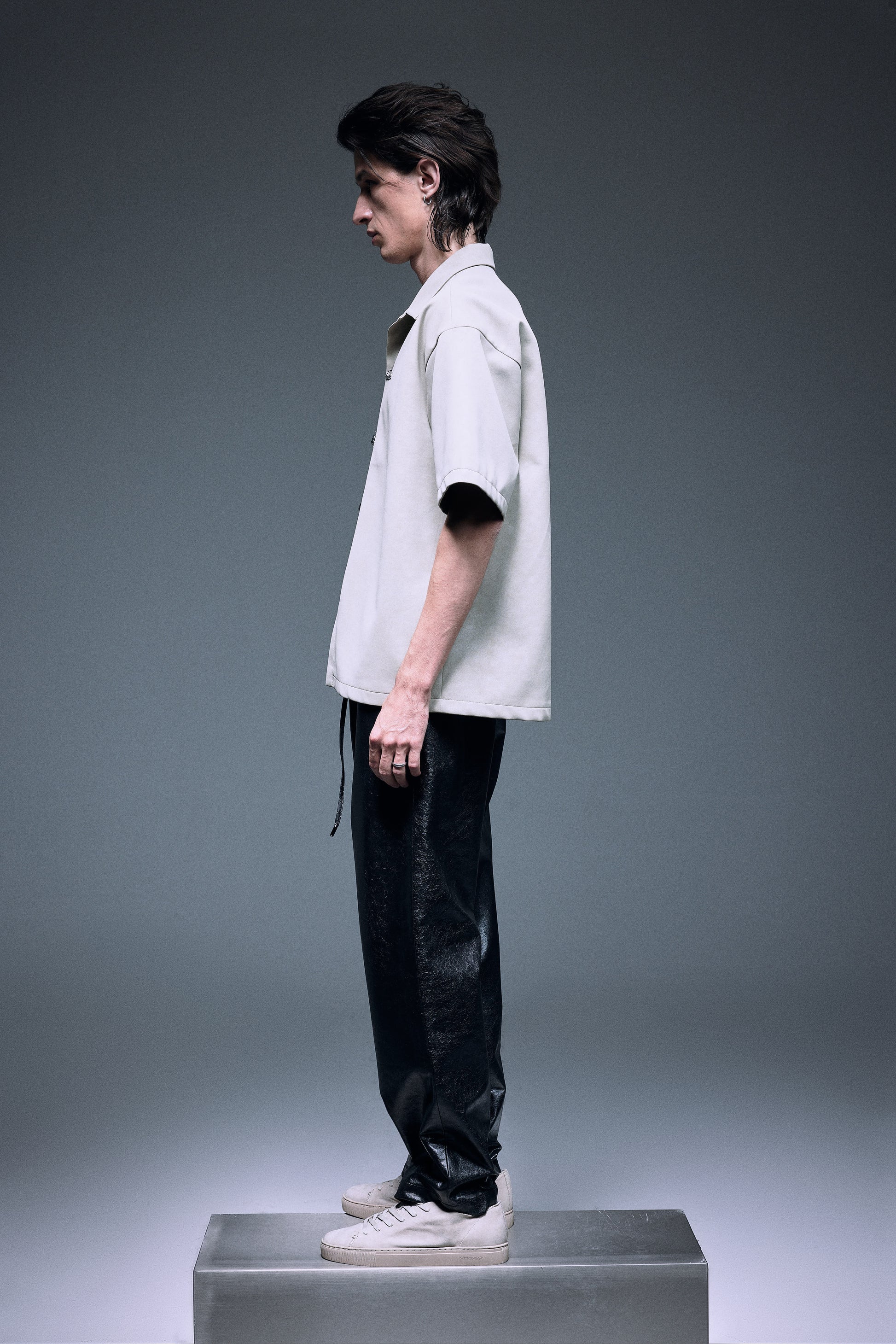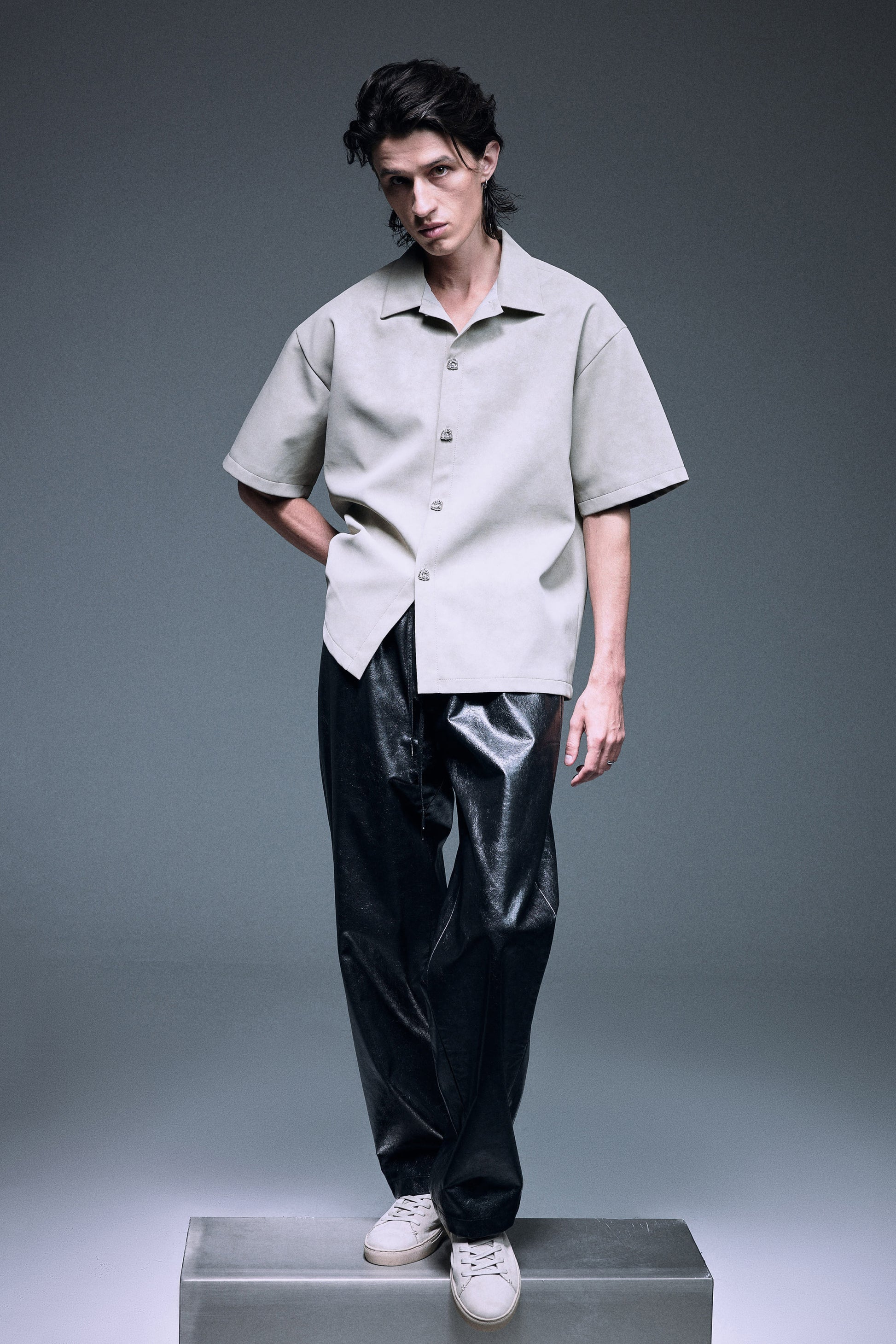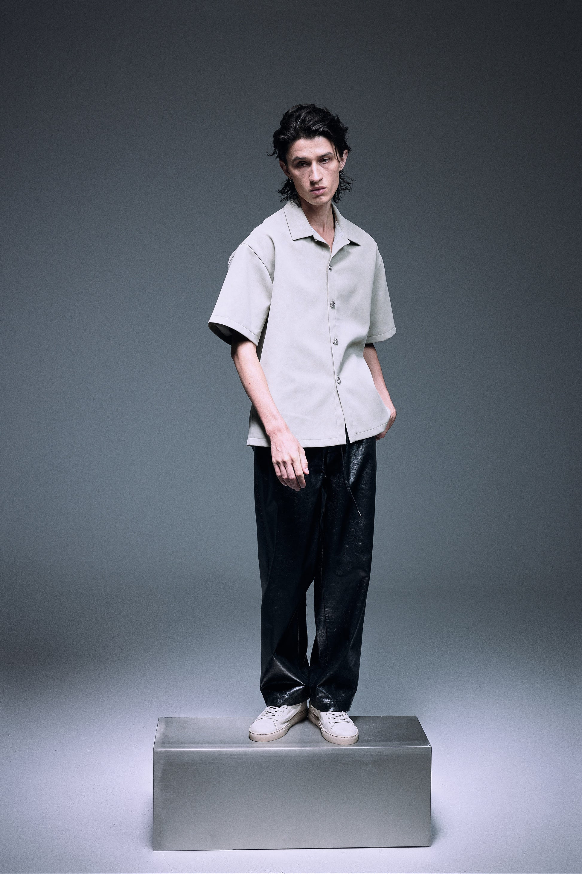 The unique vegan leather shirt in a special matte texture light creamy grey green, finished with silver knot twisted fine buttons, slightly oversized shoulder creates a bold yet elegant silhouette.
