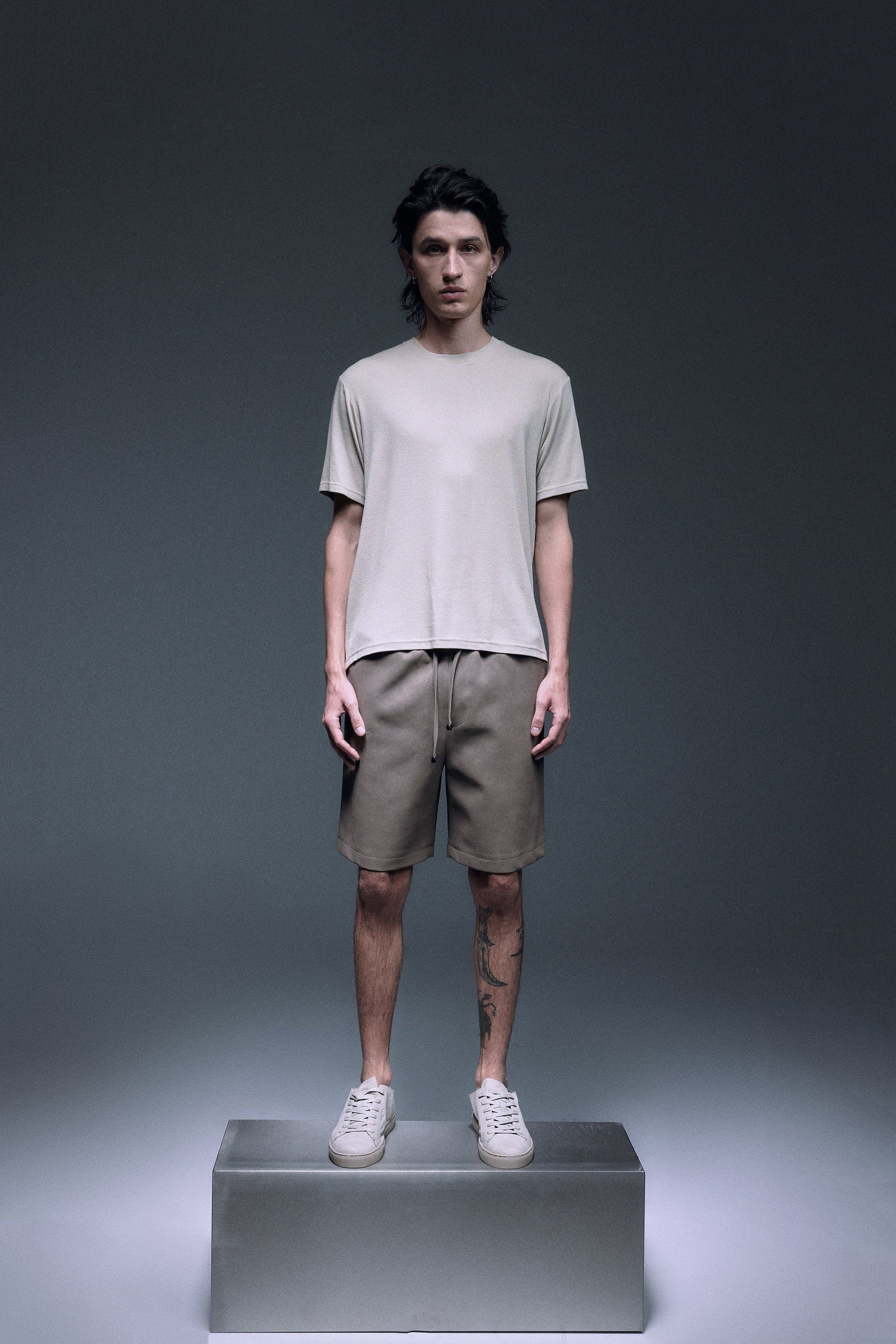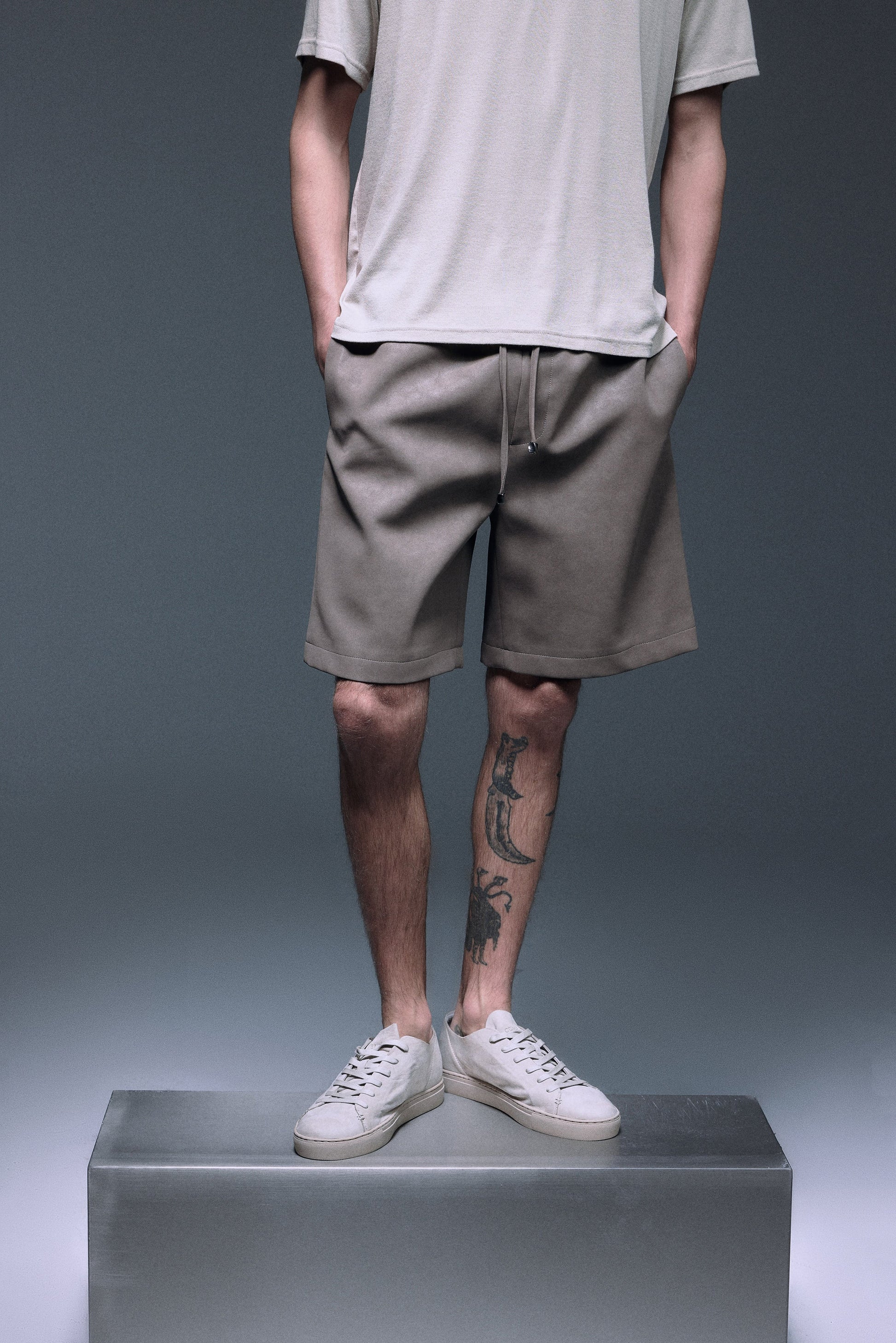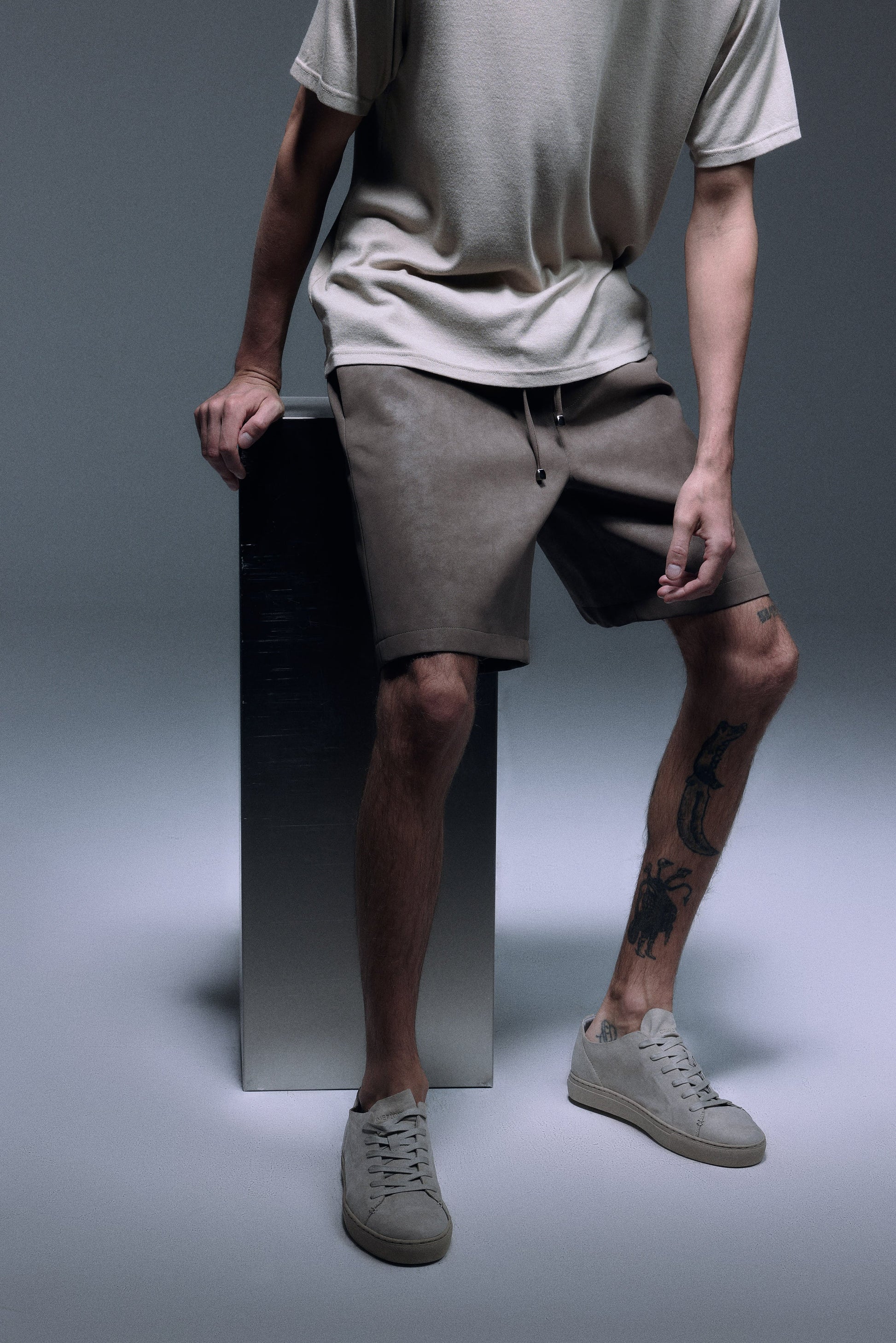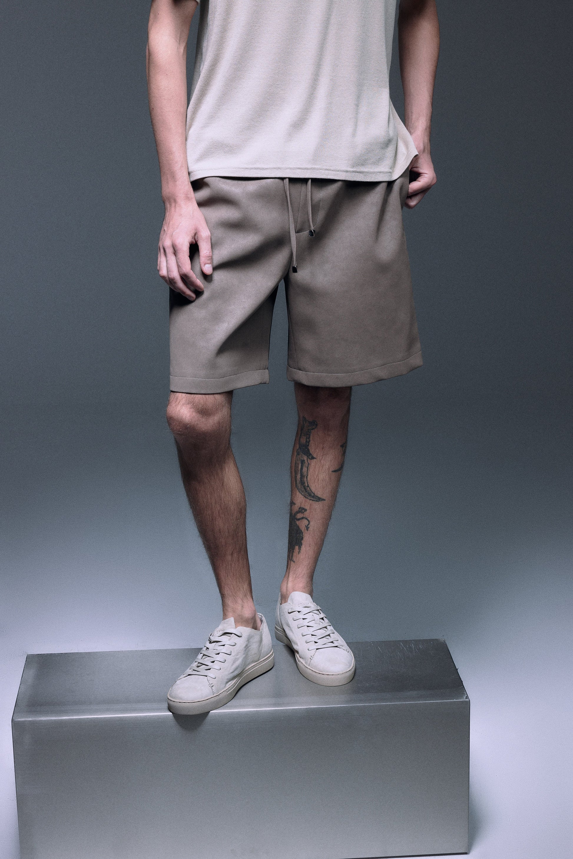 The unique vegan leather shorts in matte texture terracotta, designed with a slightly dropped inseam to provide ultimate comfort, finished with same vegan leather drawcords and front slash pockets to provide functionality.