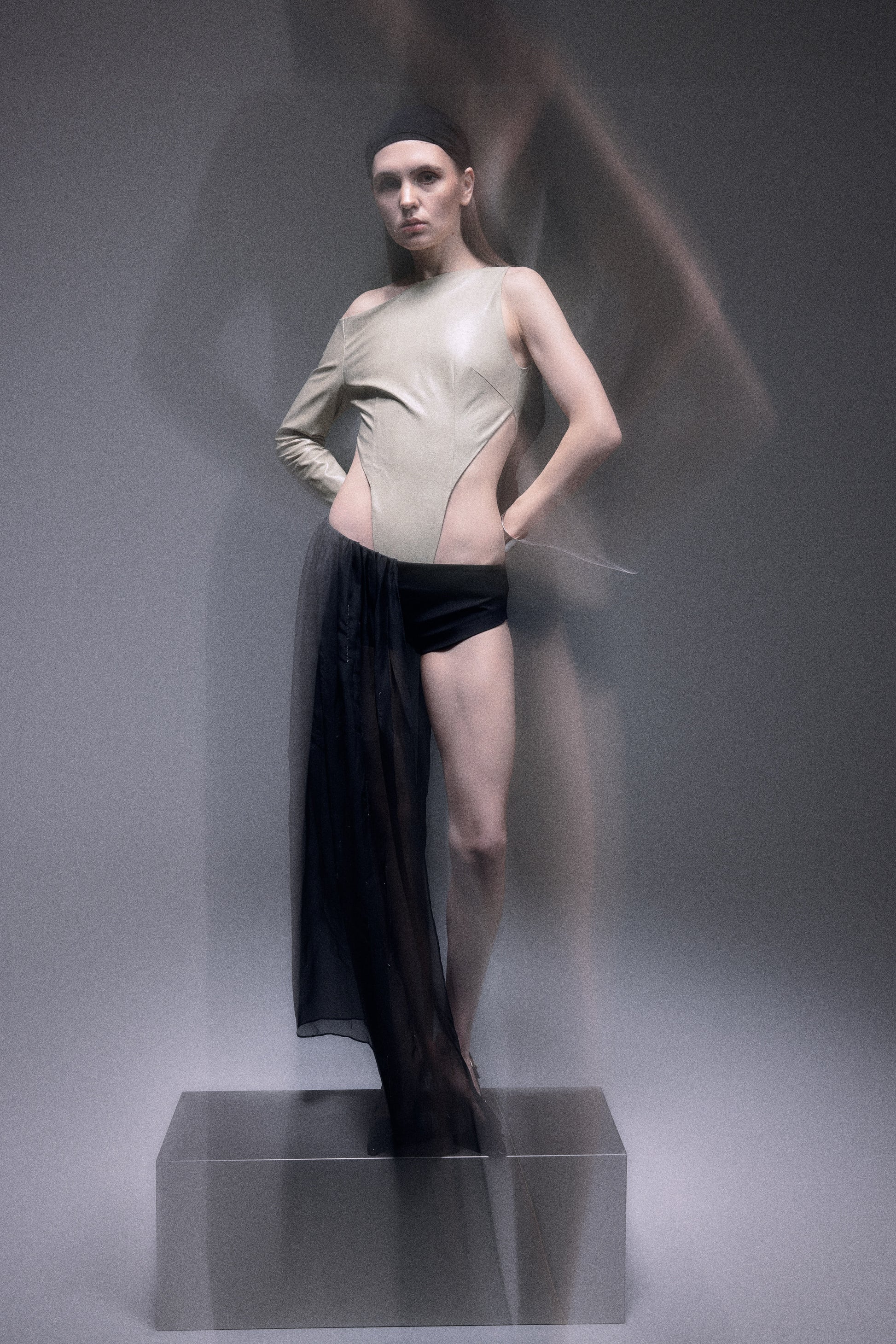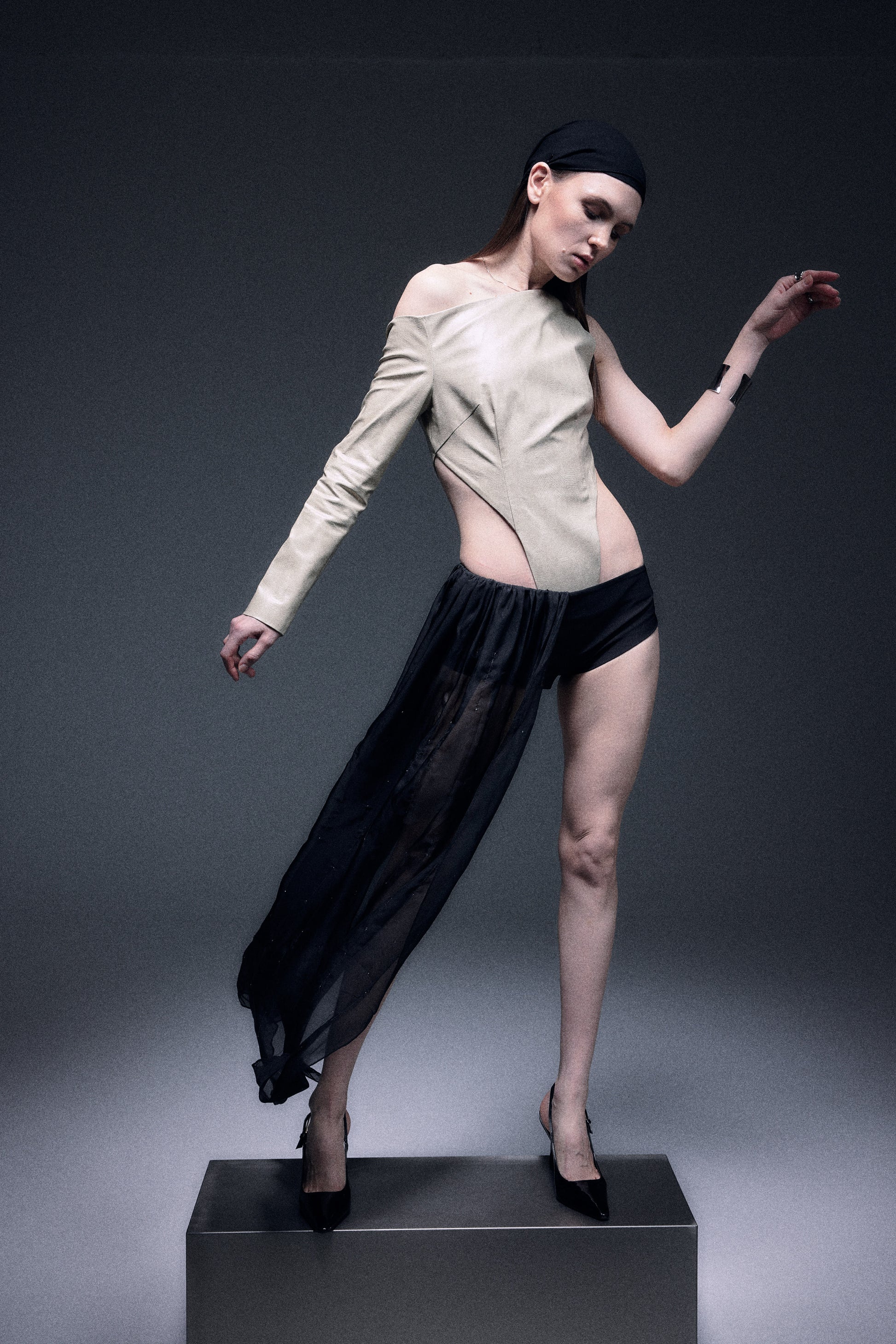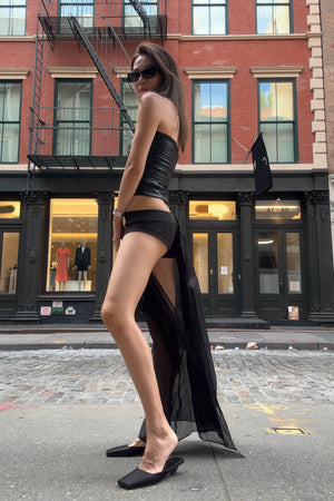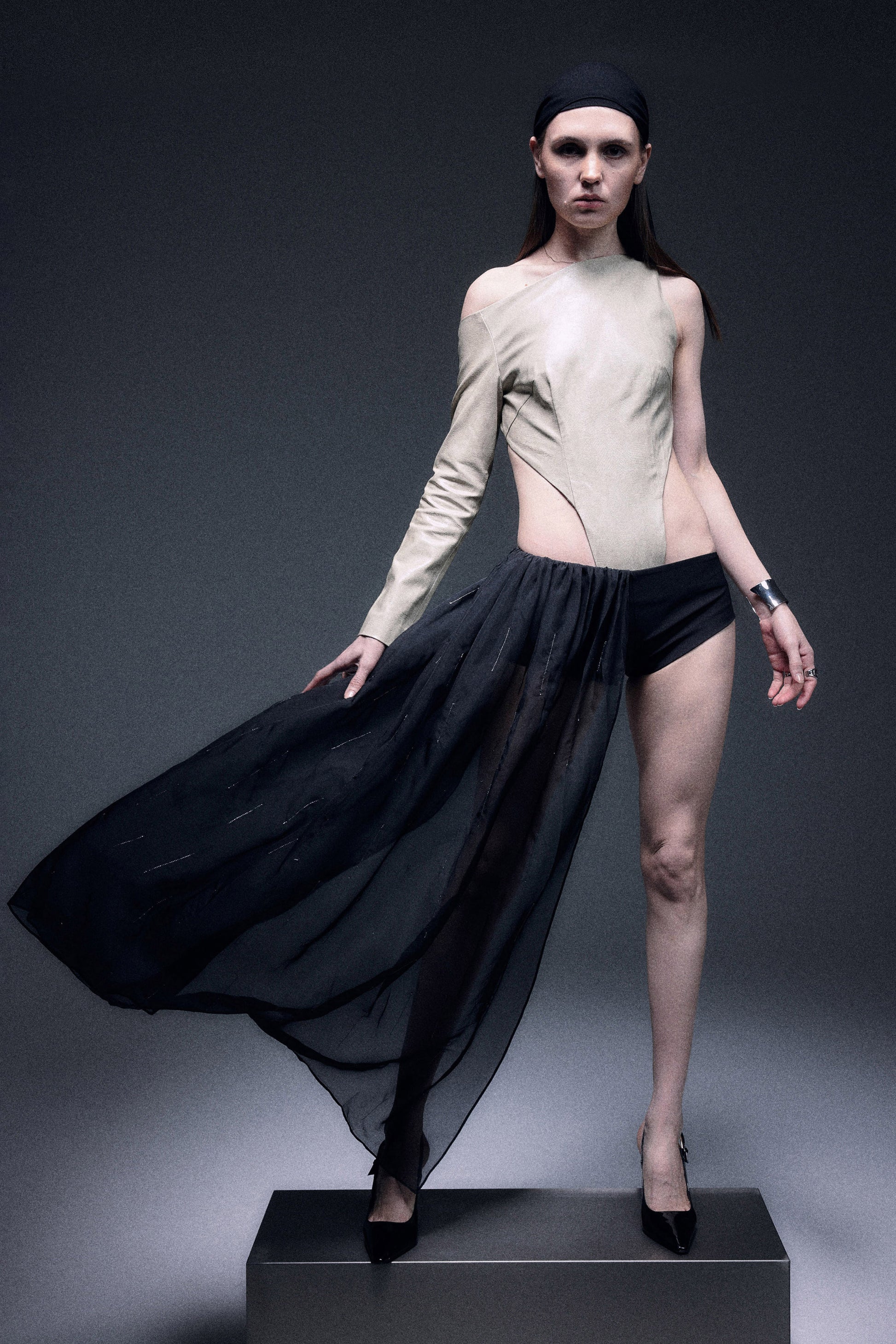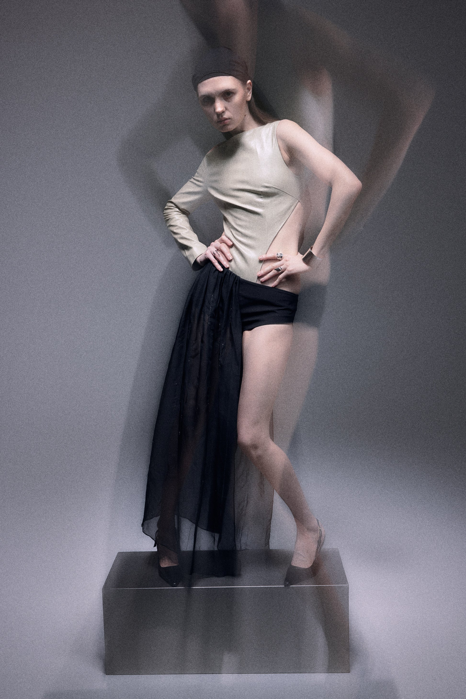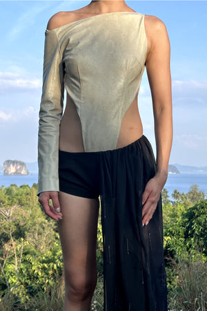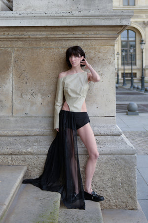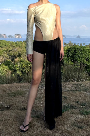This hand-embroided silver lines decorated one-side chiffon long skirt is attached to a silky touch stiffening material shorts, creating a feminine mystery with a tomboy touch.
