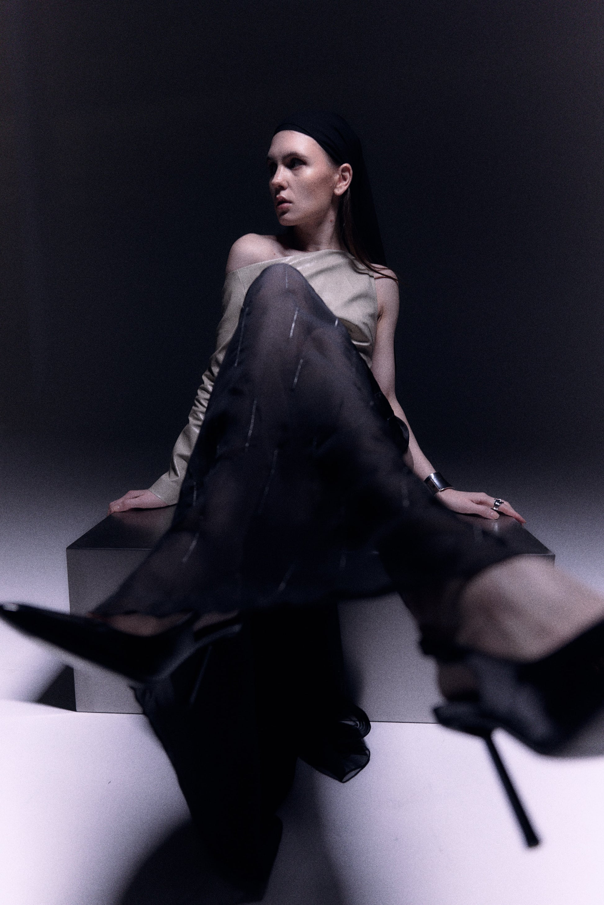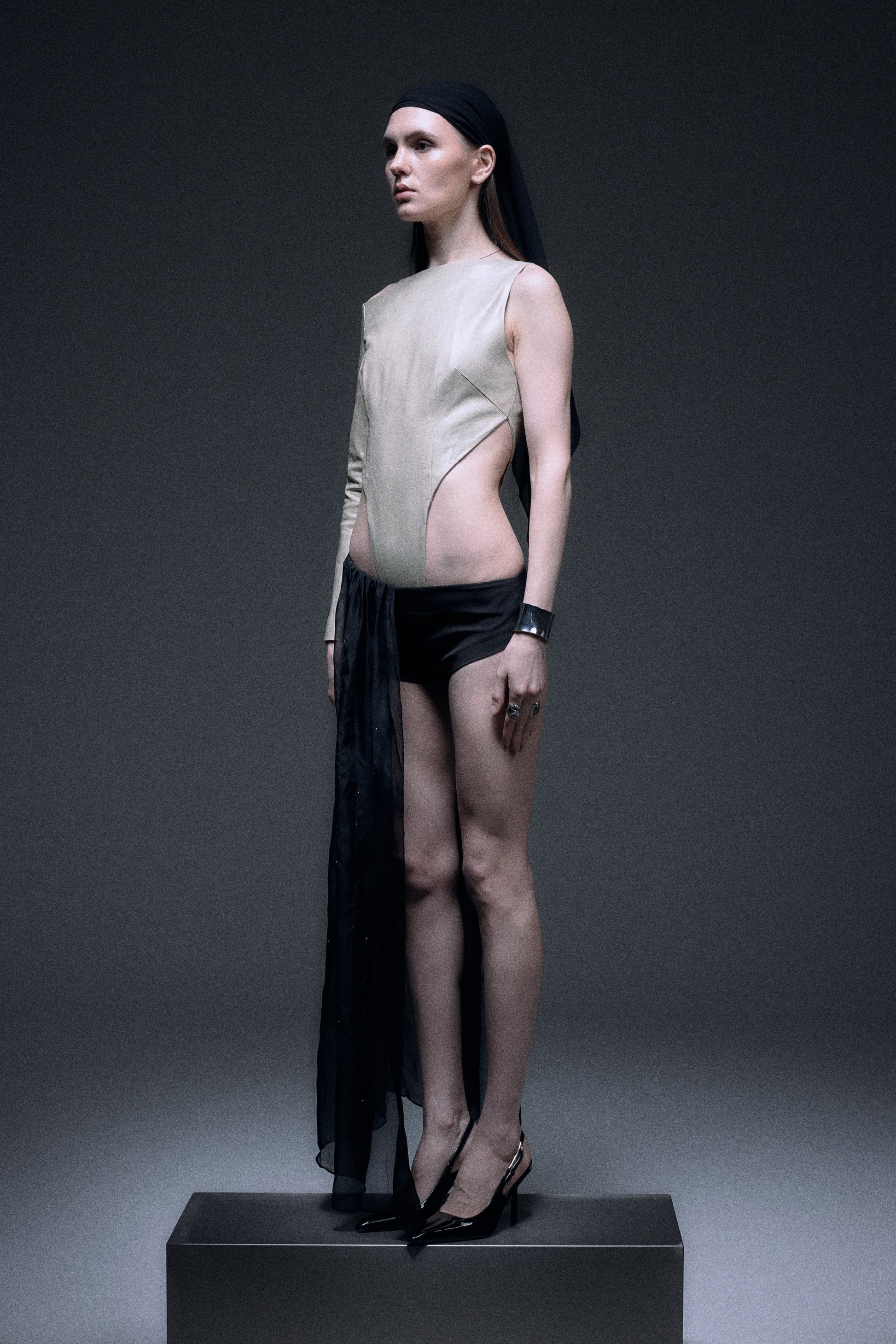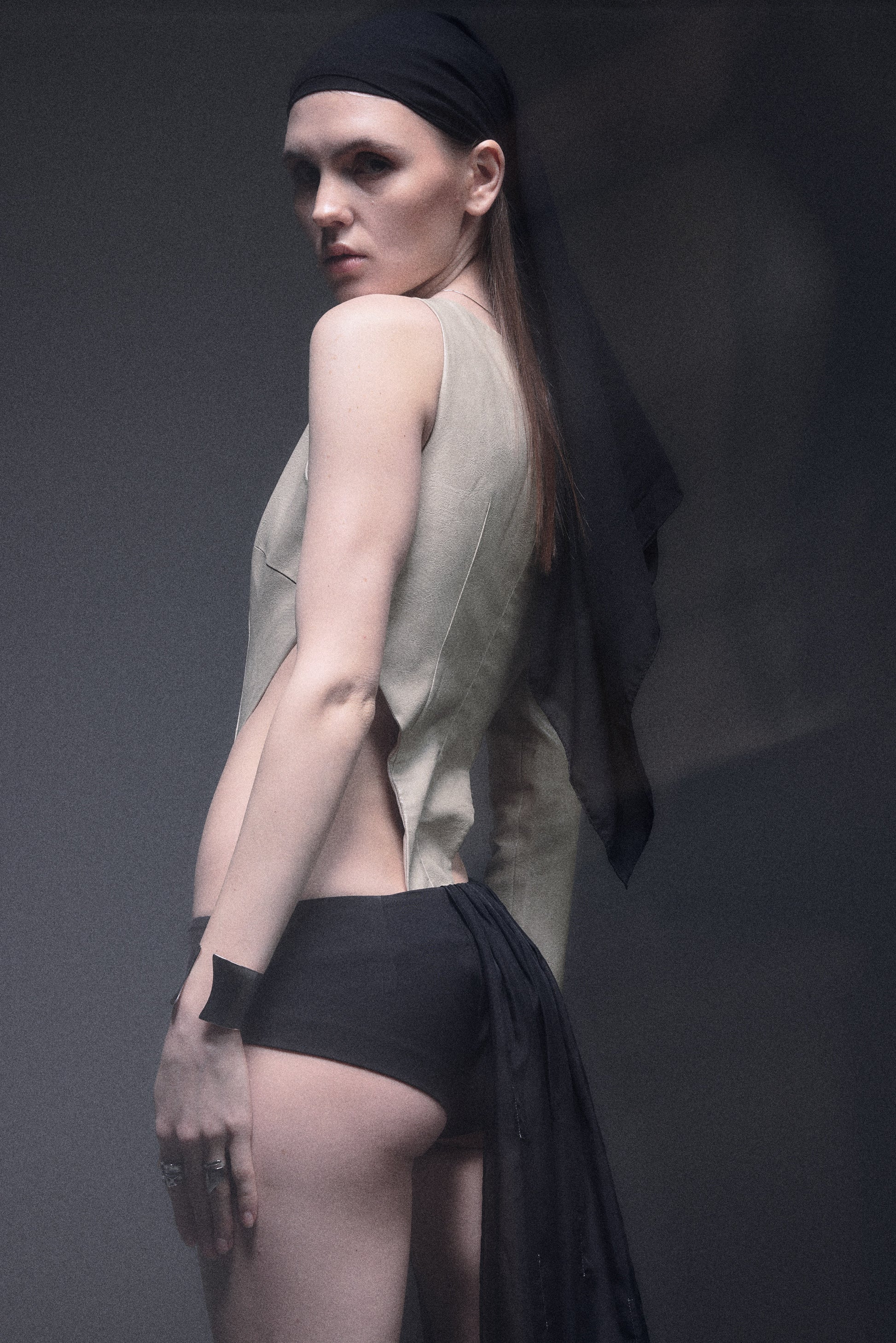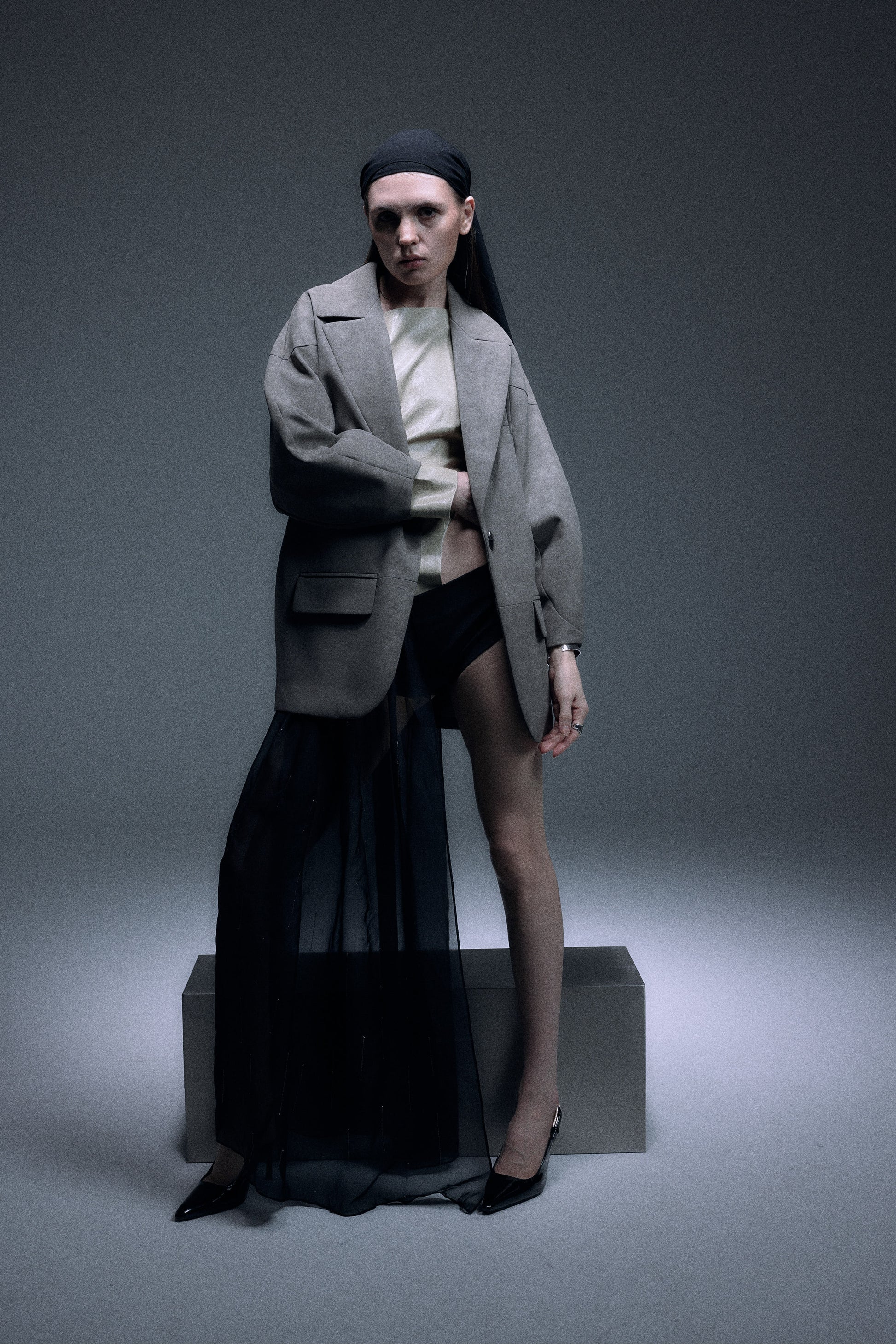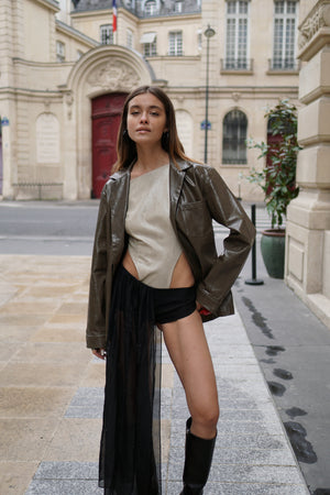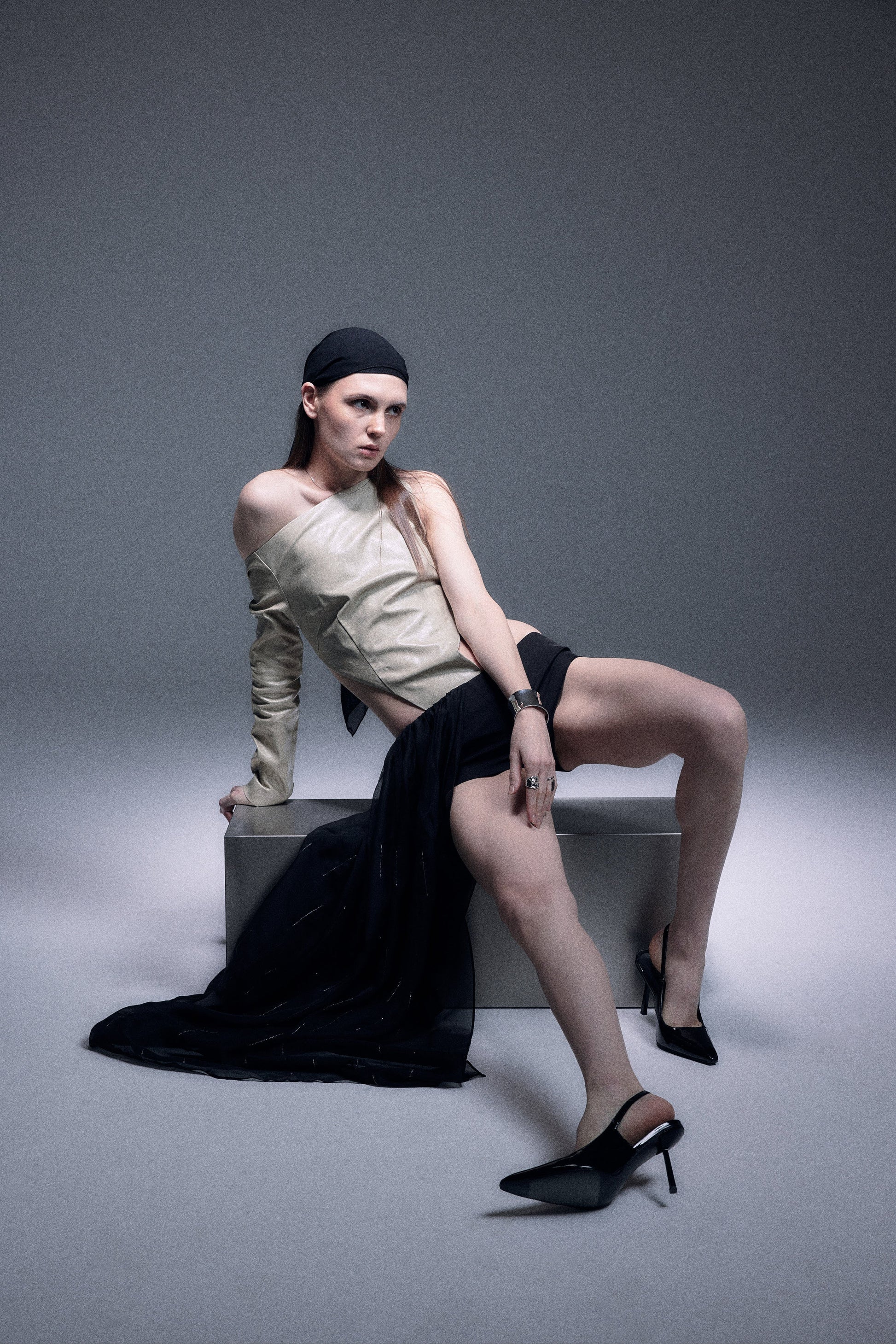 This hand-embroided silver lines decorated one-side chiffon long skirt is attached to a silky touch stiffening material shorts, creating a feminine mystery with a tomboy touch.