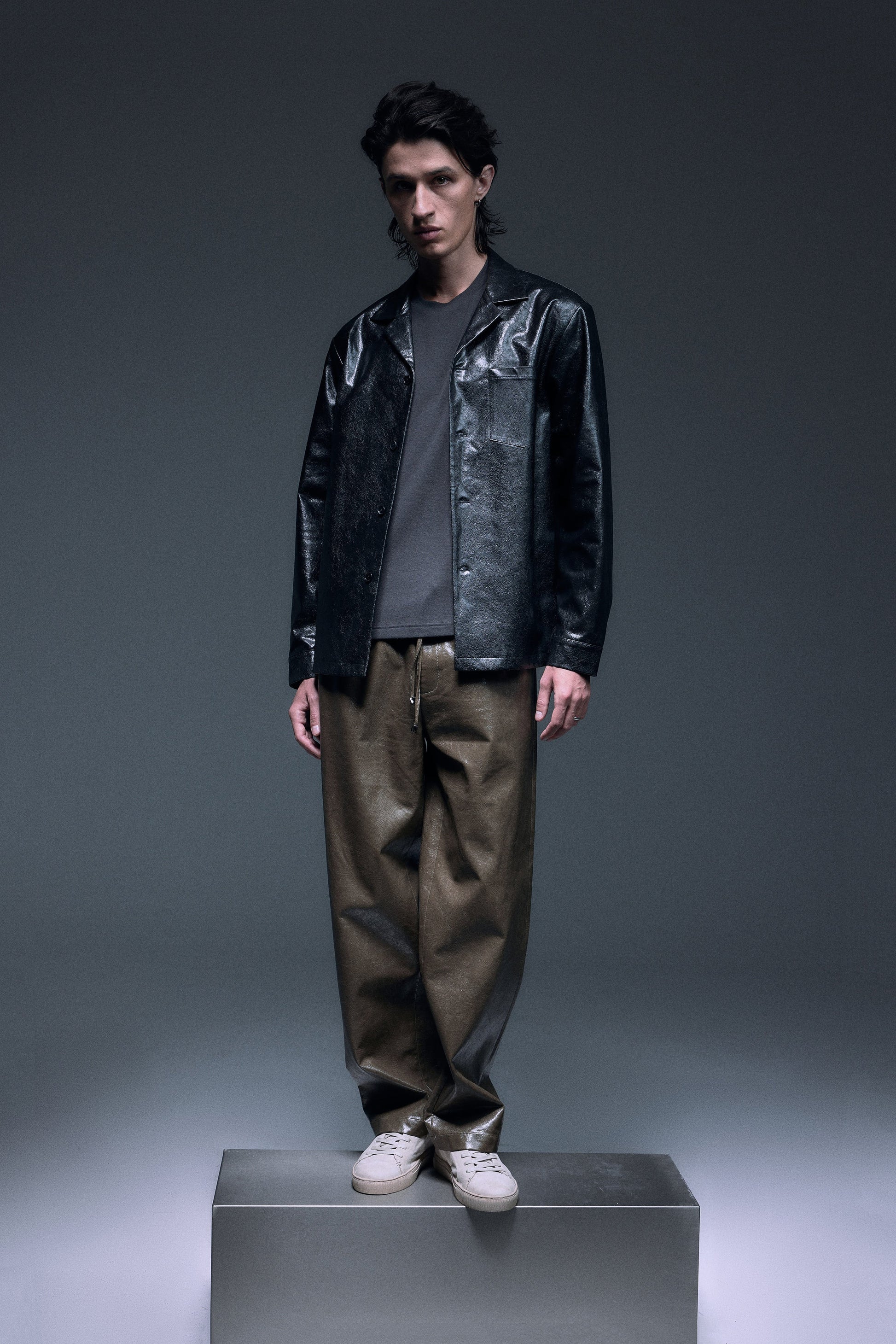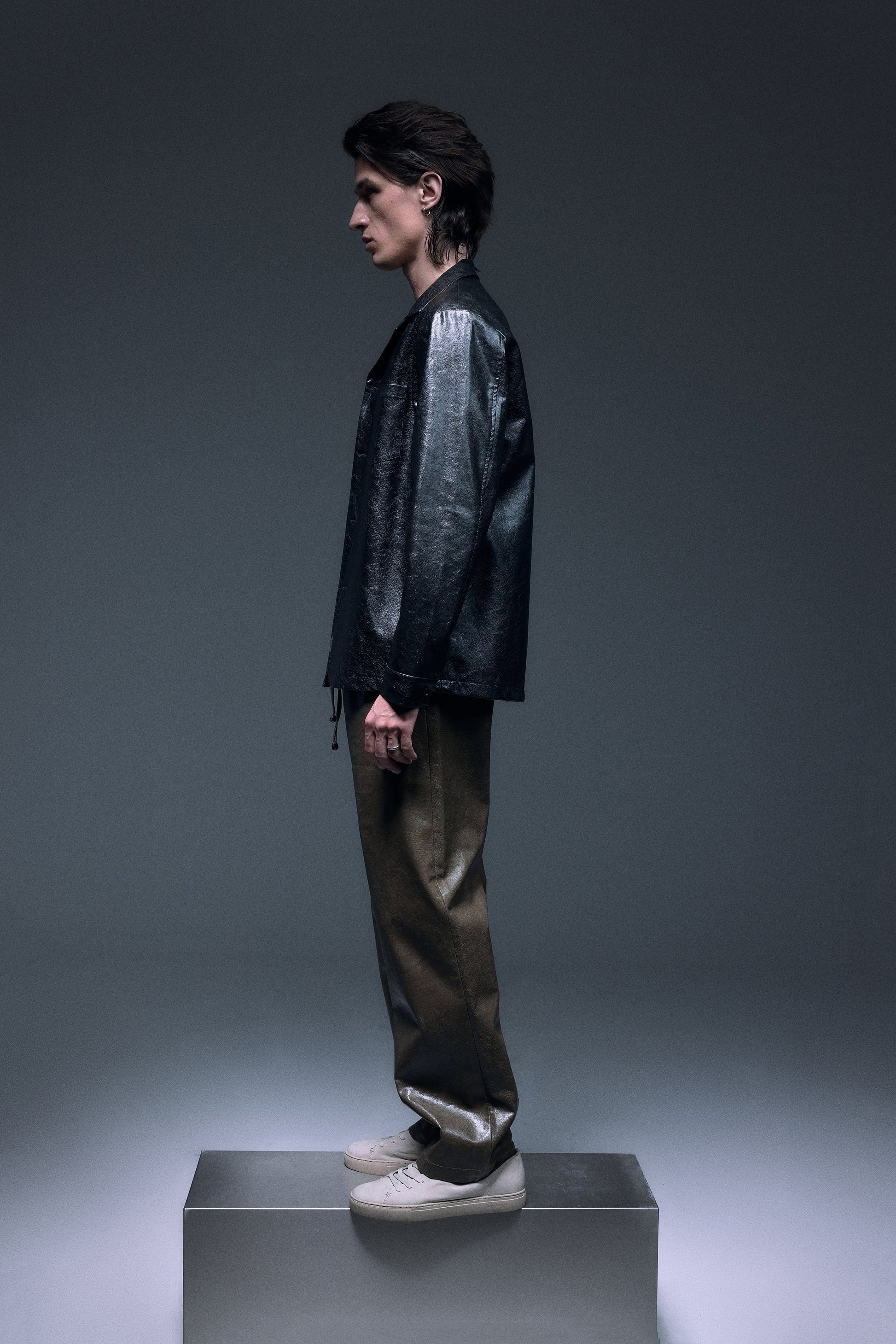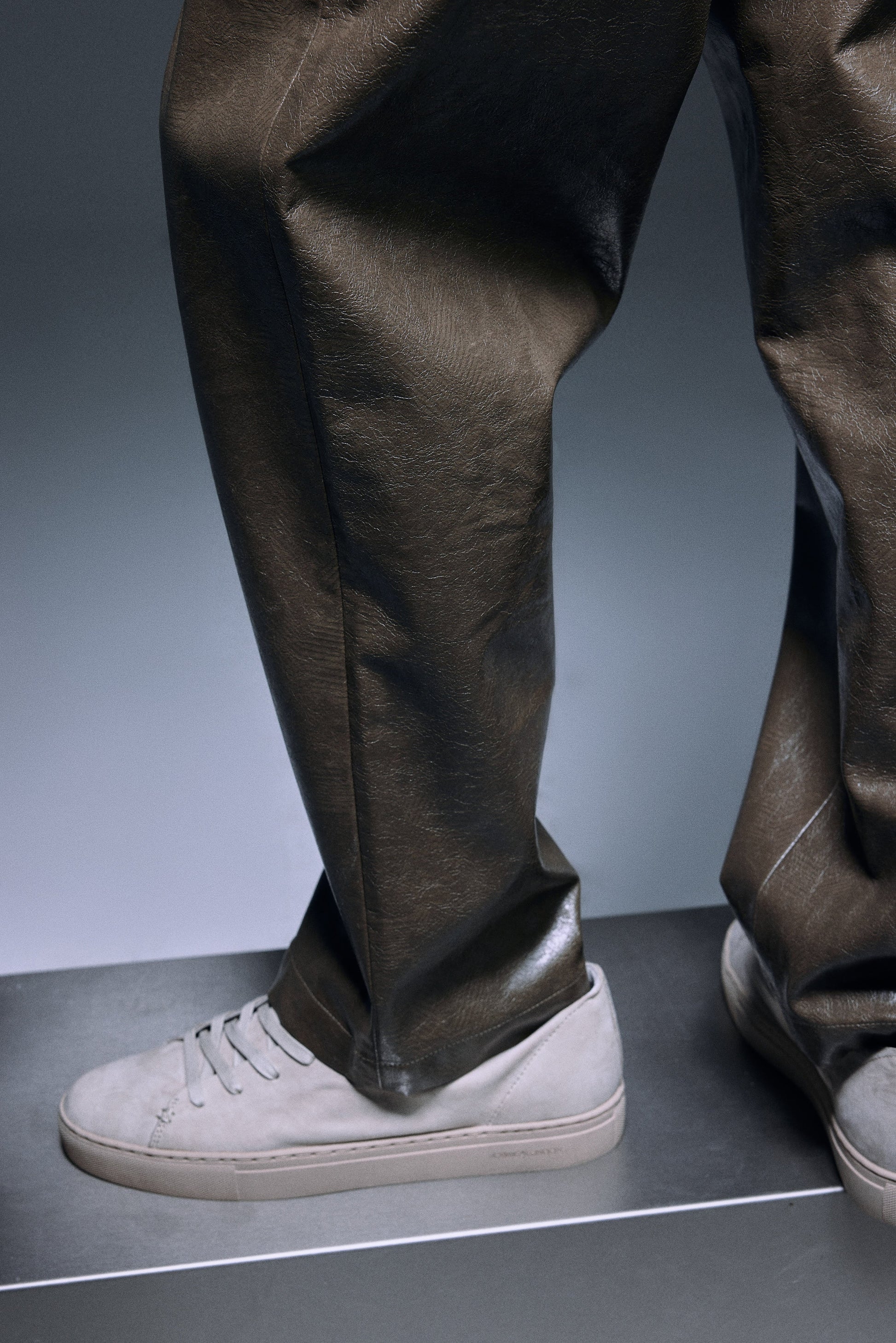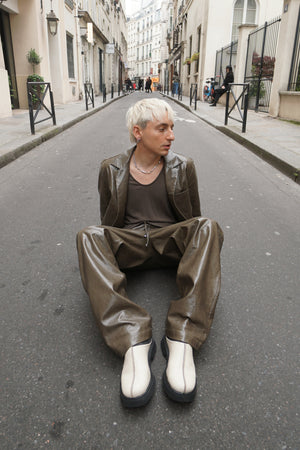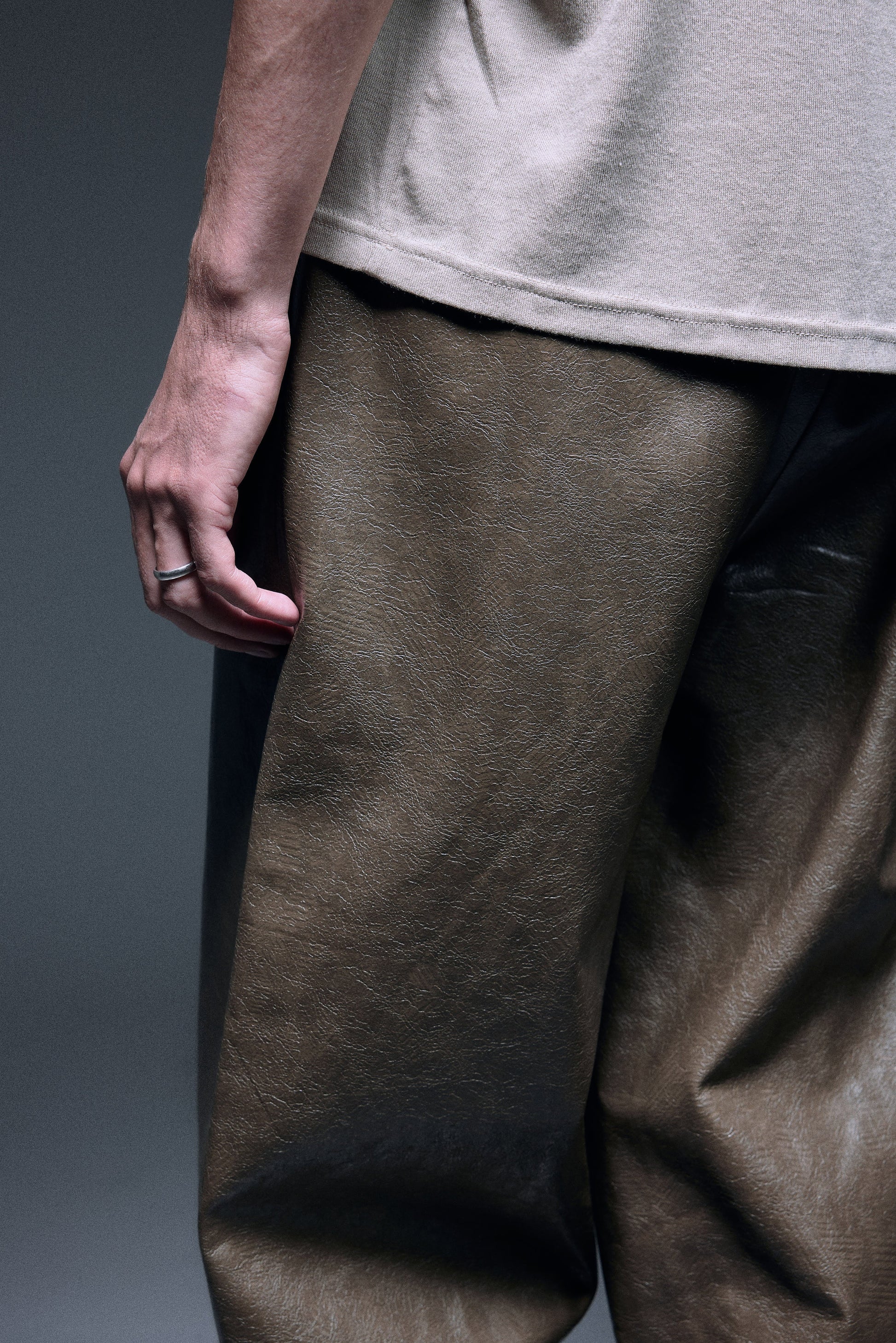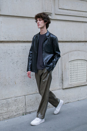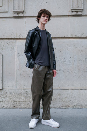 Long straight pants made with shiny textured vegan leather in olive green, designed with a slightly dropped inseam to provide ultimate comfort, finished with same vegan leather drawcords and front slash pockets to provide functionality.