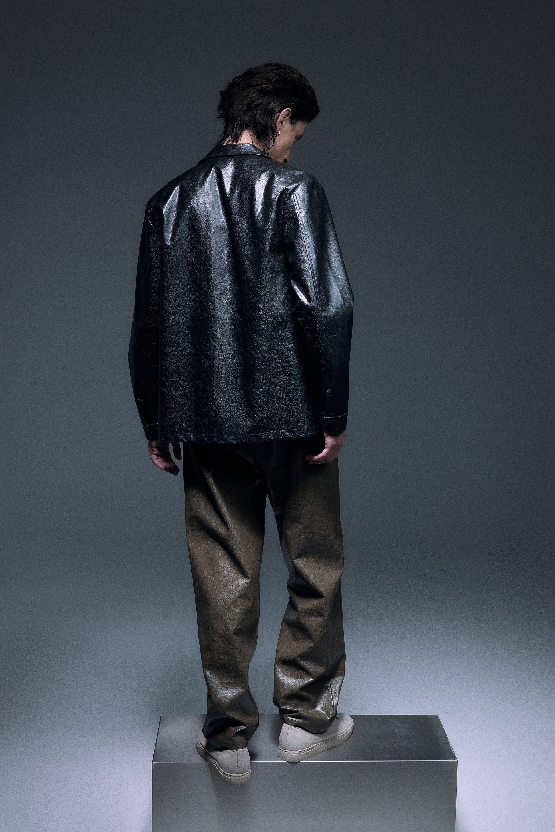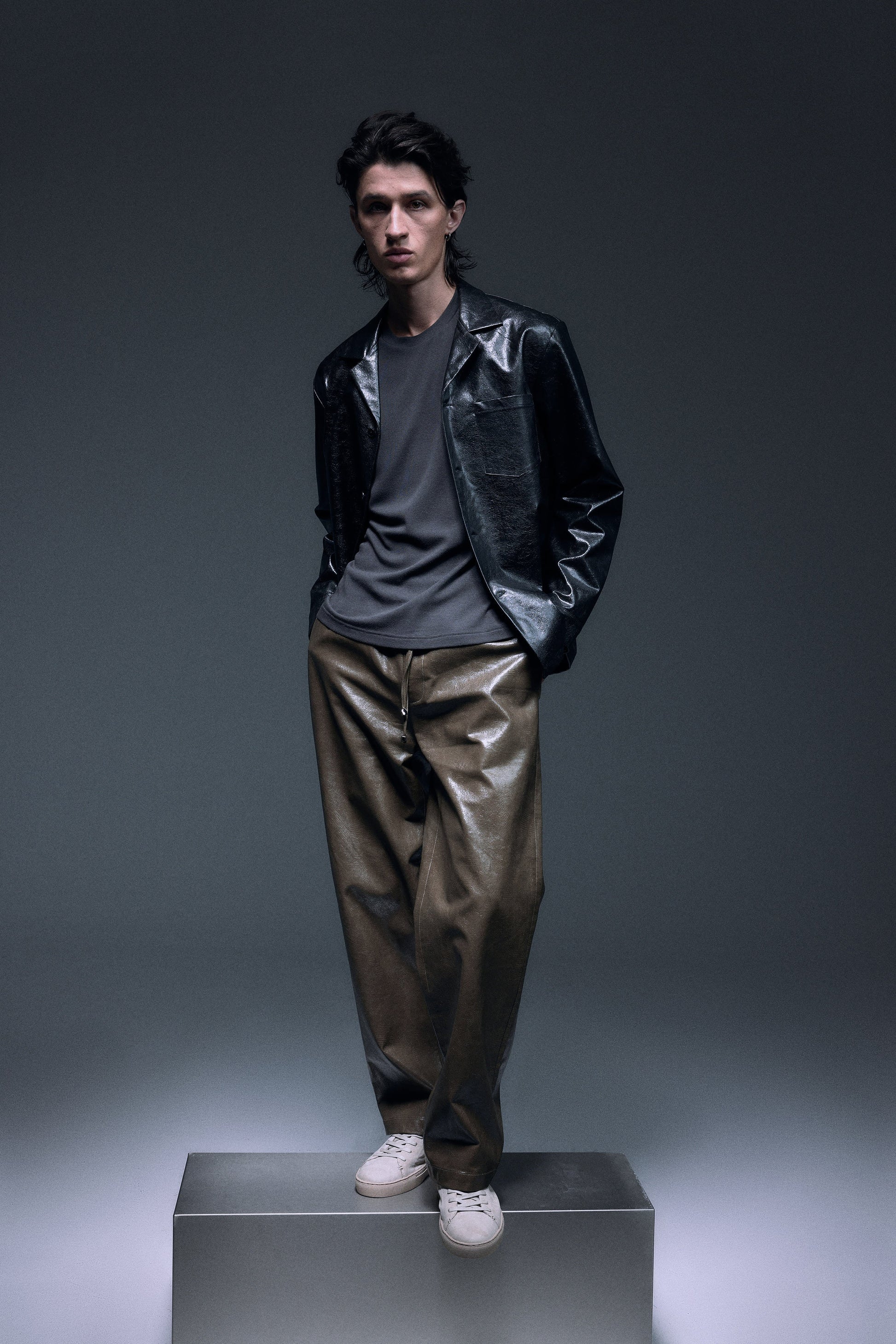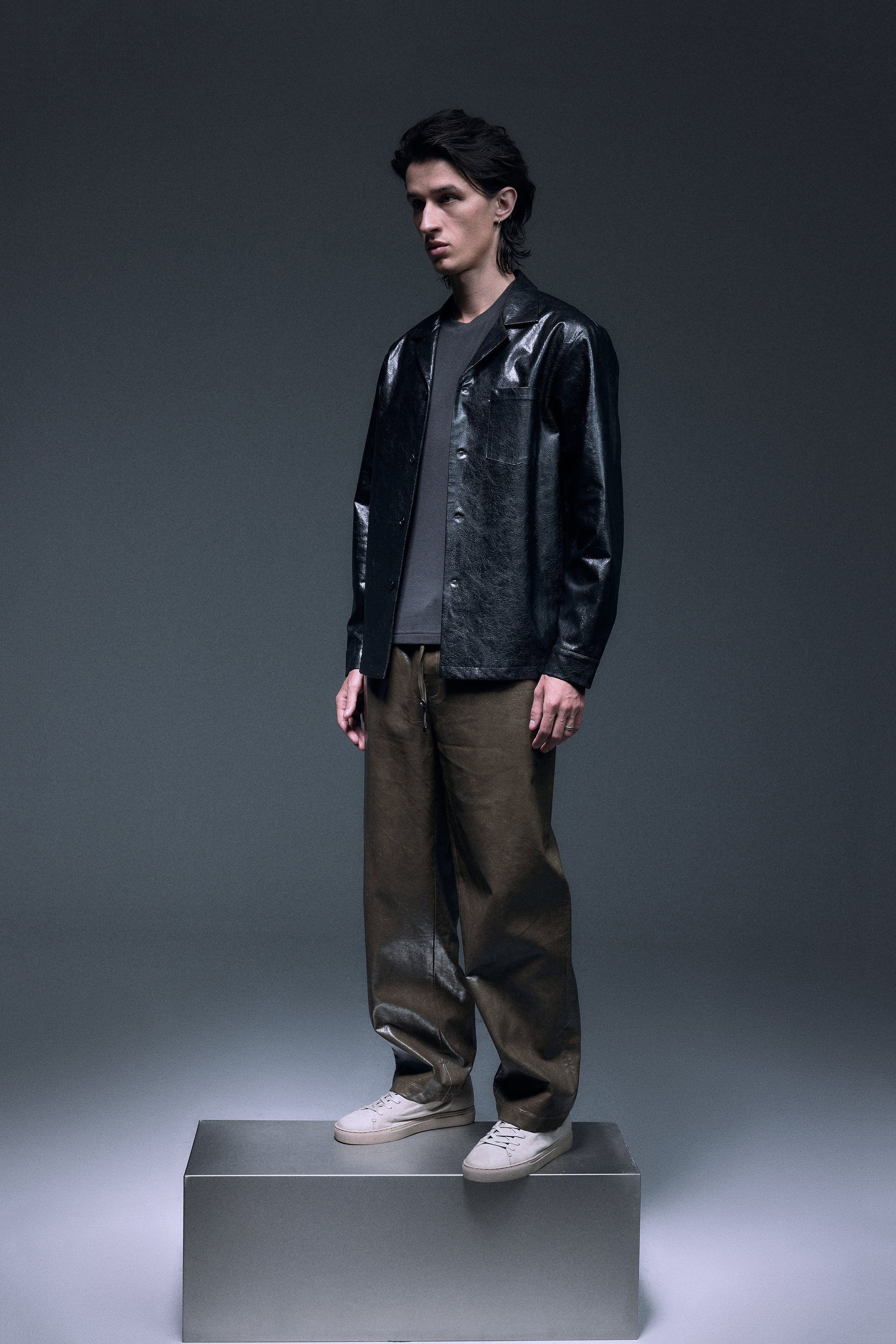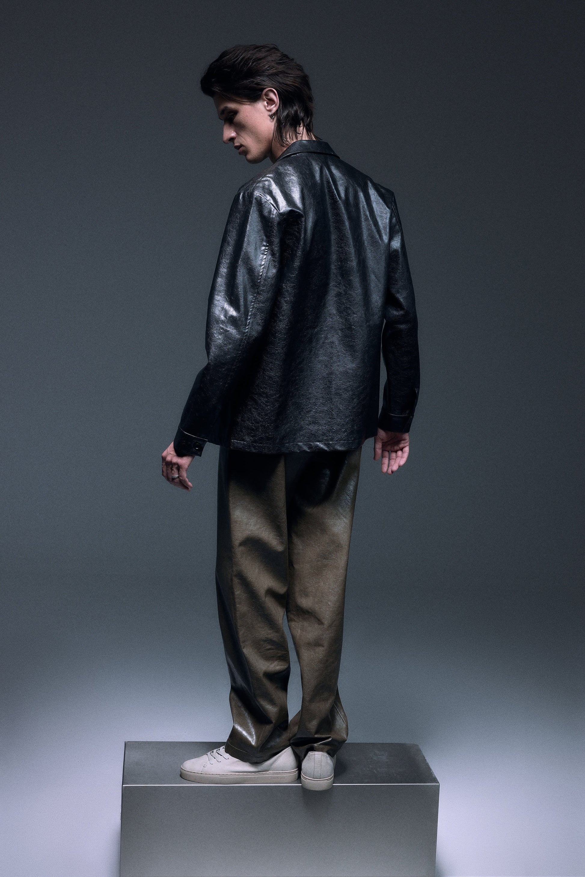 Long straight pants made with shiny textured vegan leather in olive green, designed with a slightly dropped inseam to provide ultimate comfort, finished with same vegan leather drawcords and front slash pockets to provide functionality.