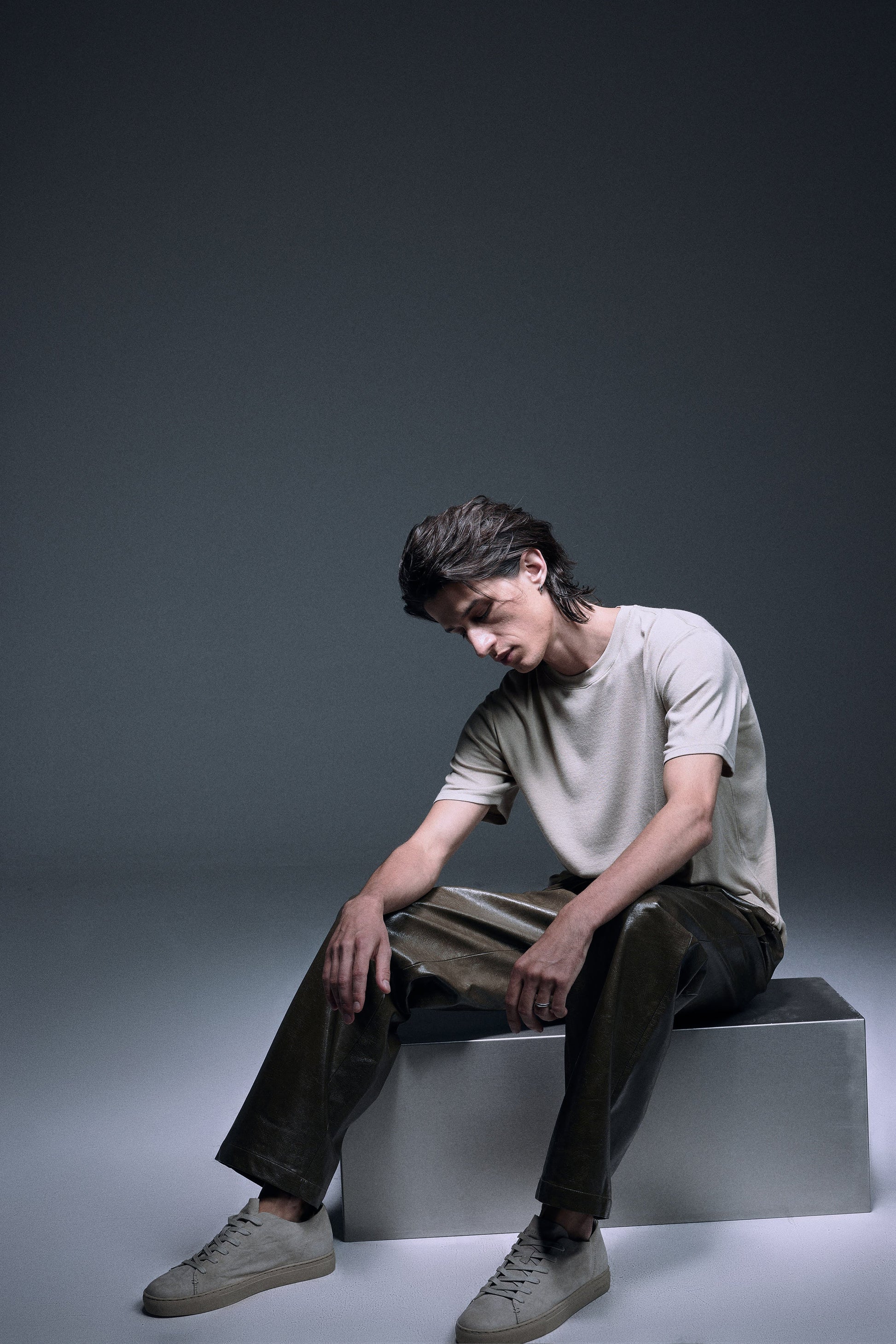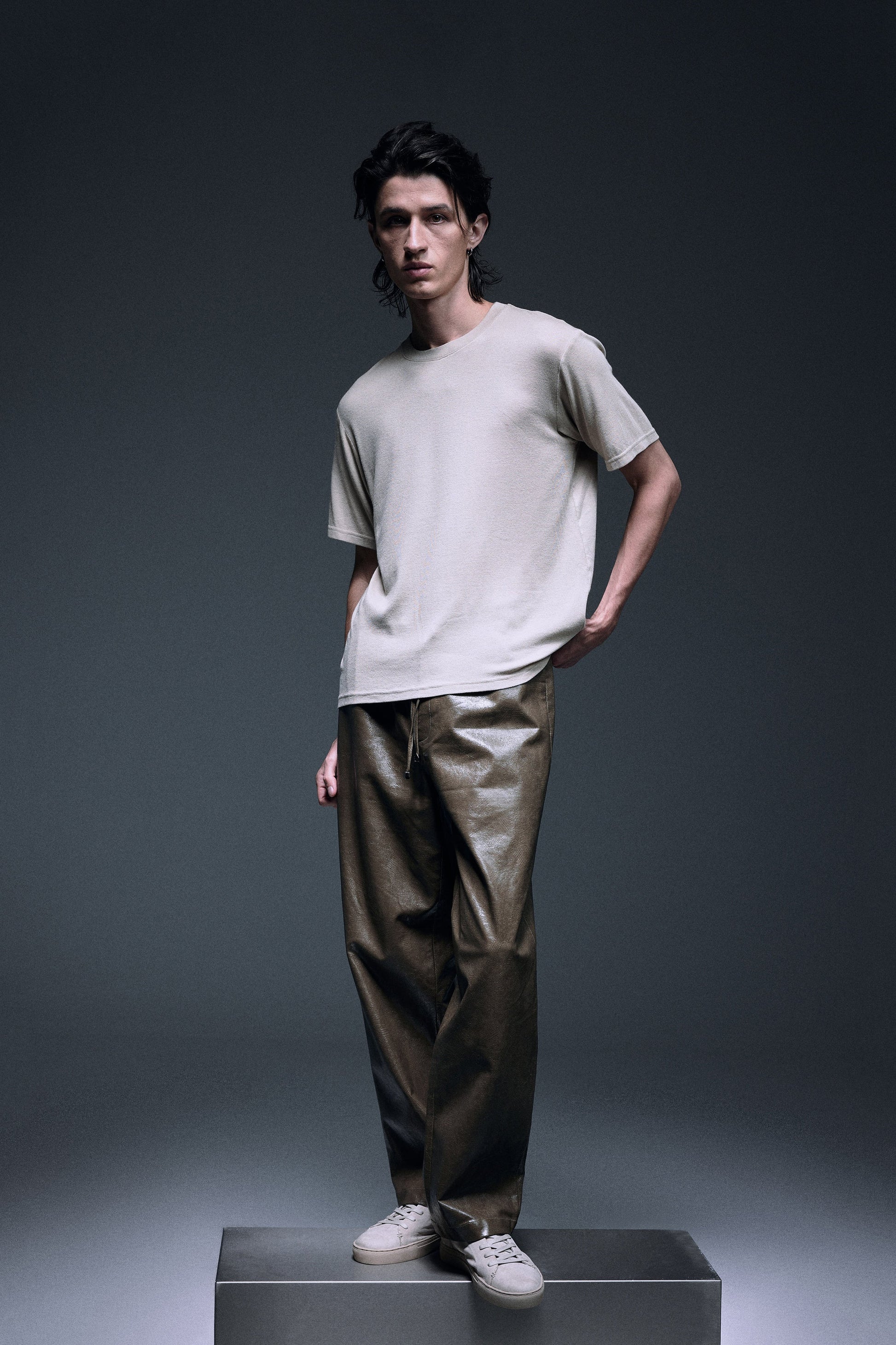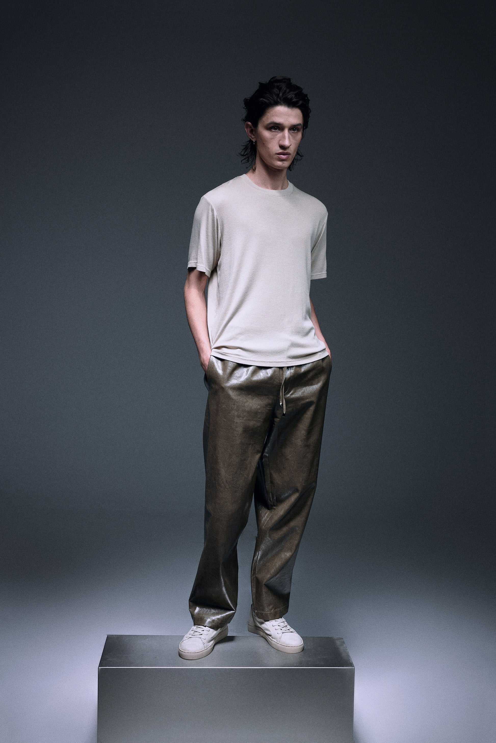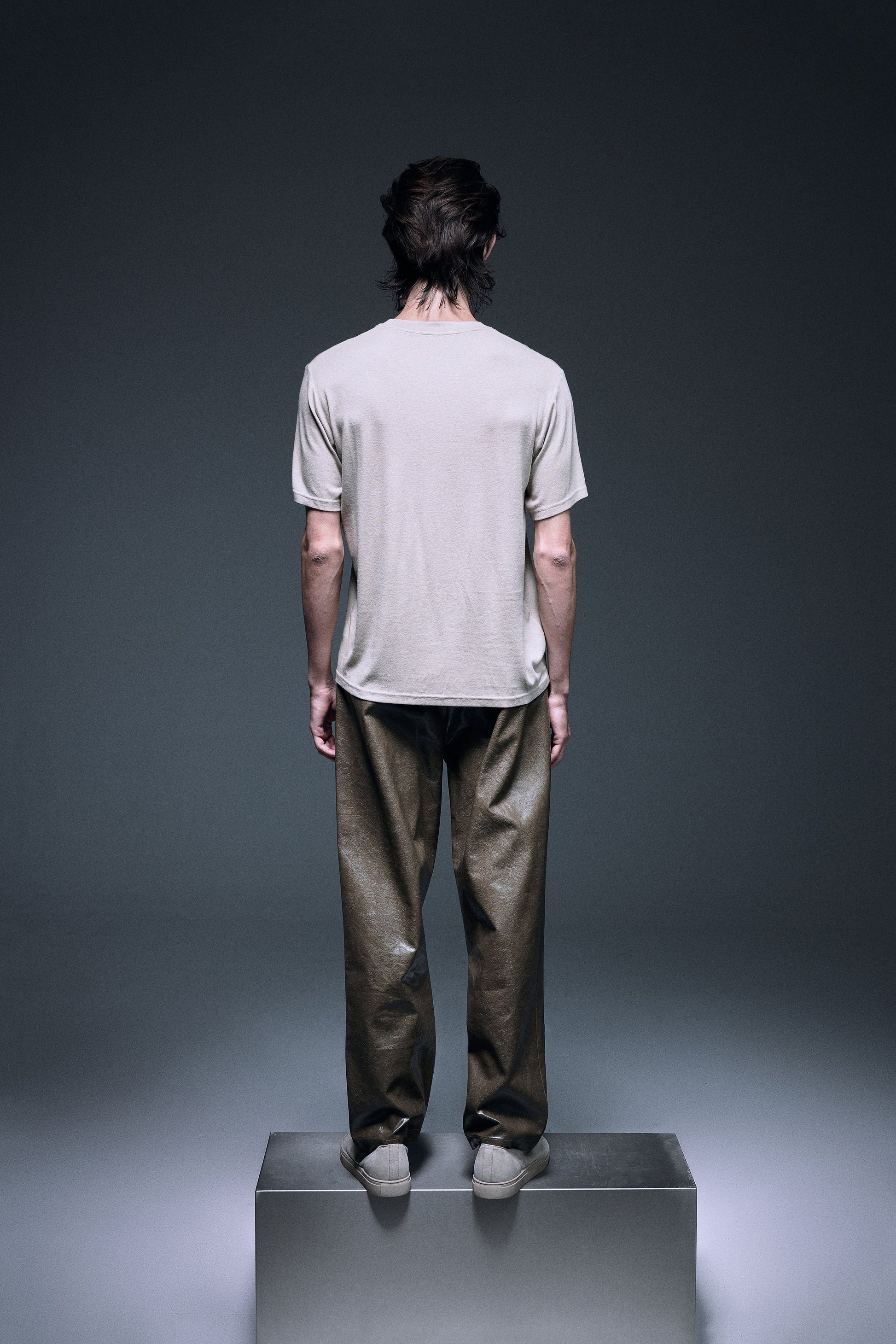 Long straight pants made with shiny textured vegan leather in olive green, designed with a slightly dropped inseam to provide ultimate comfort, finished with same vegan leather drawcords and front slash pockets to provide functionality.