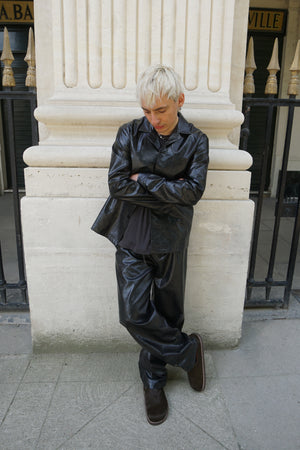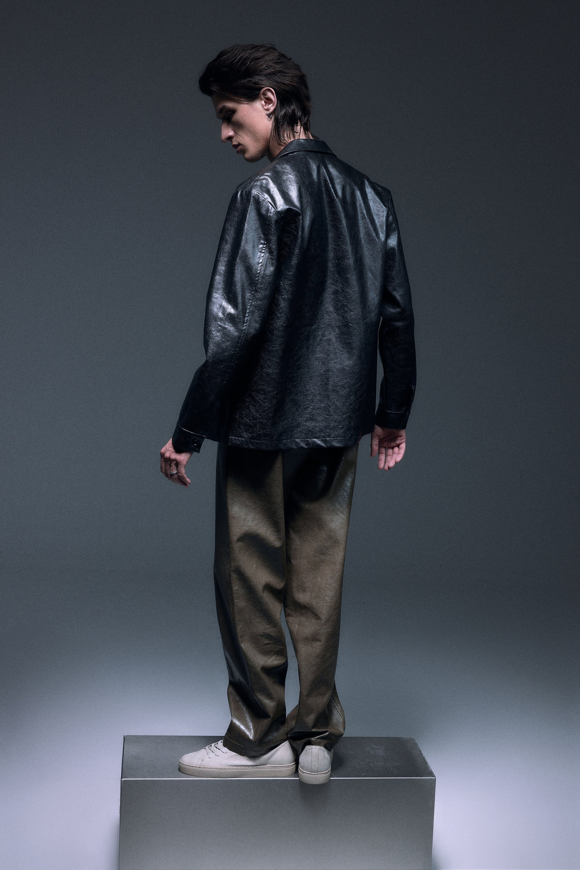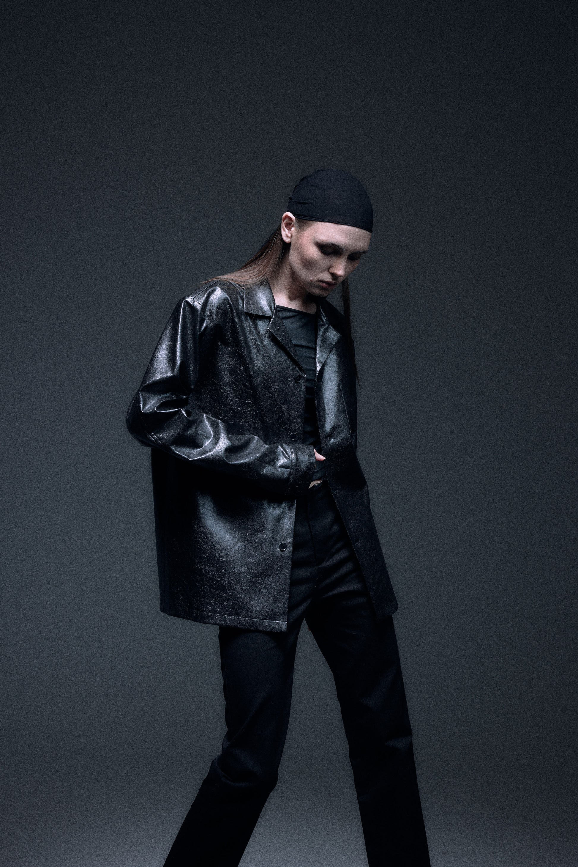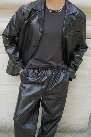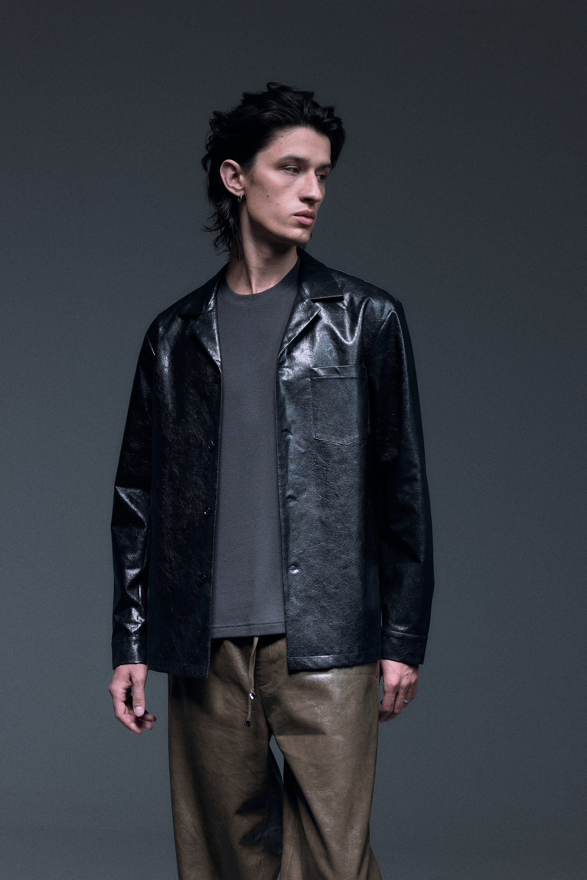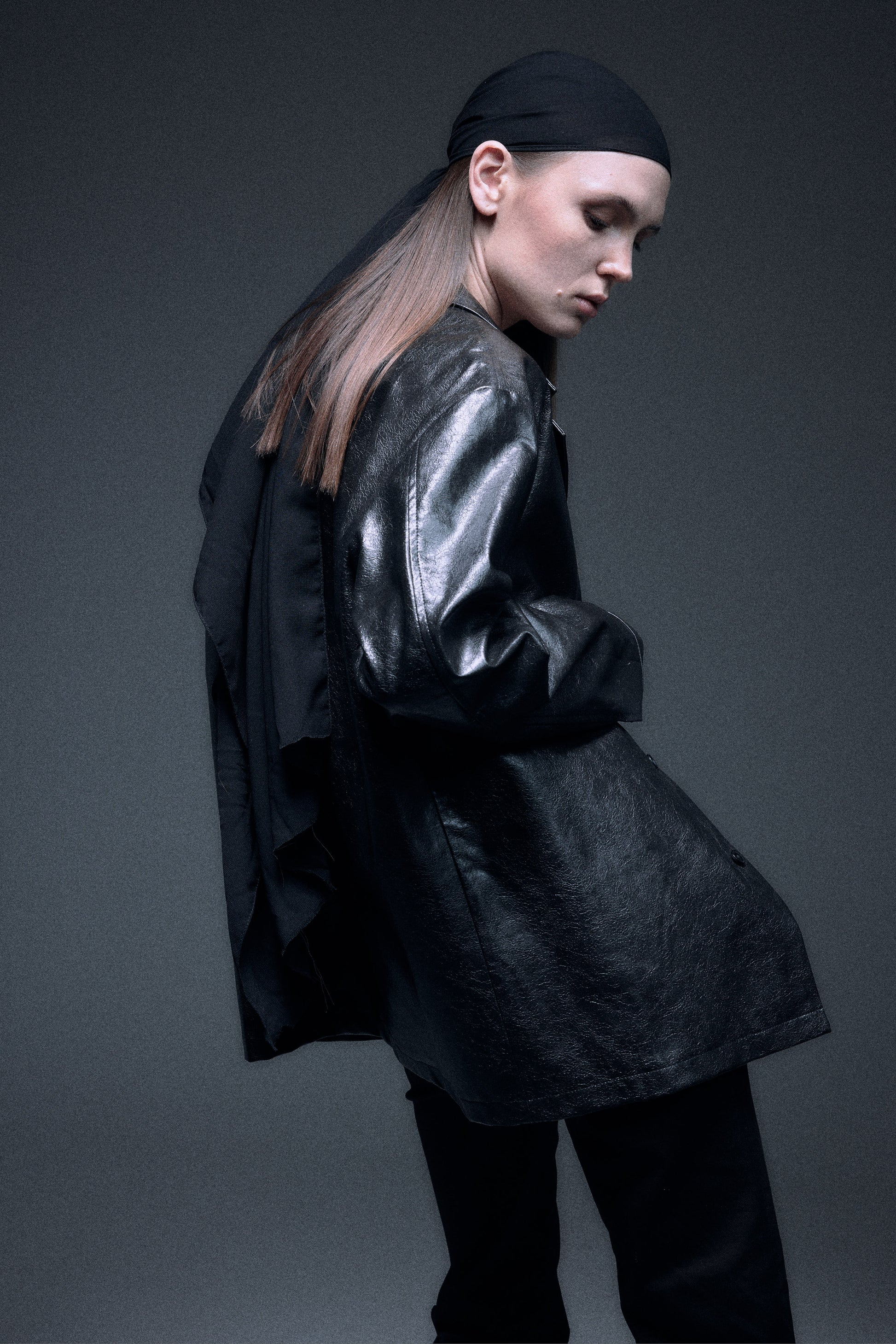 This contemporary unisex vegan leather jacket features a sharp point collar and relaxed fit sleeves, made with special shiny textured vegan leather in black.