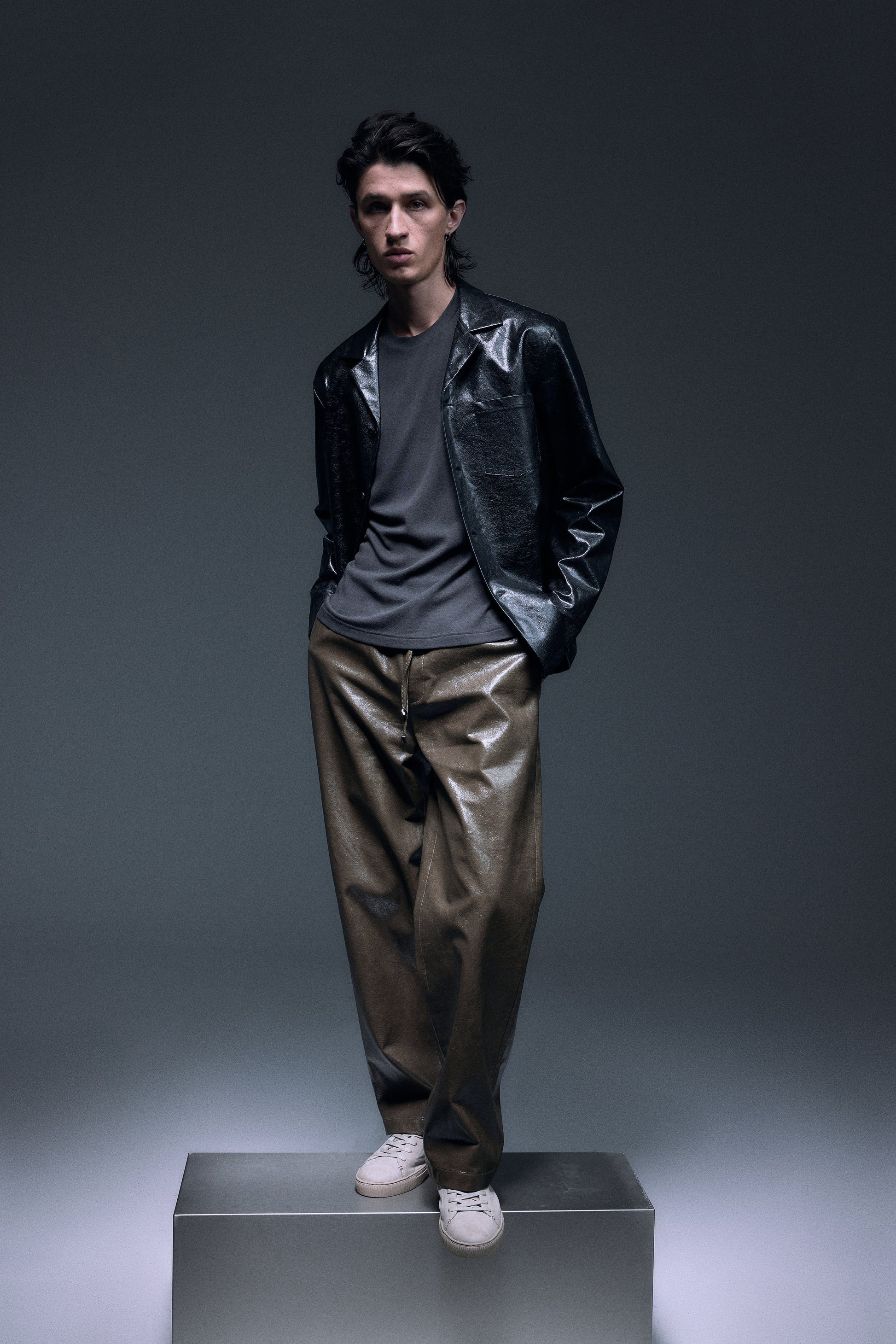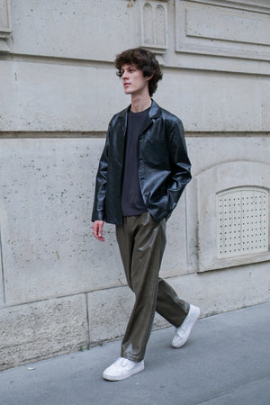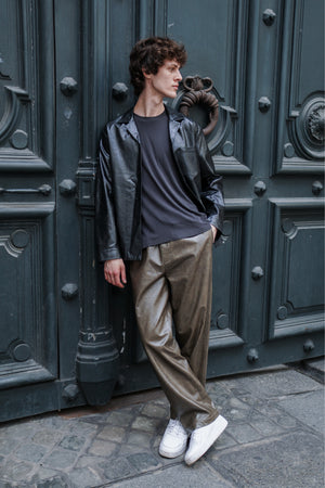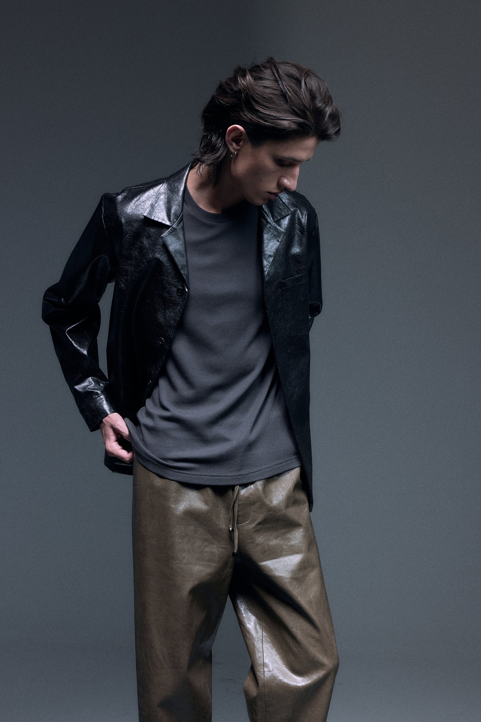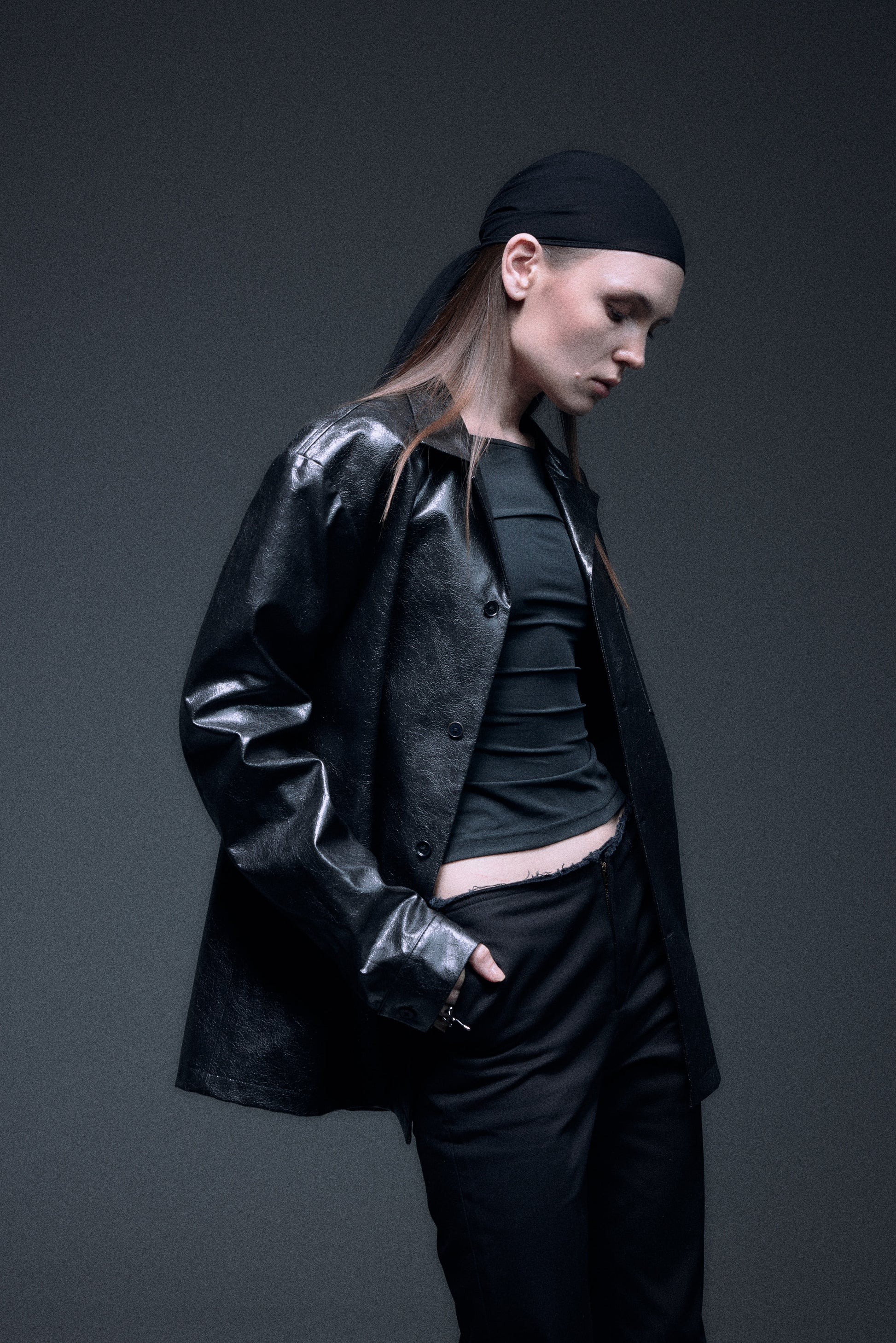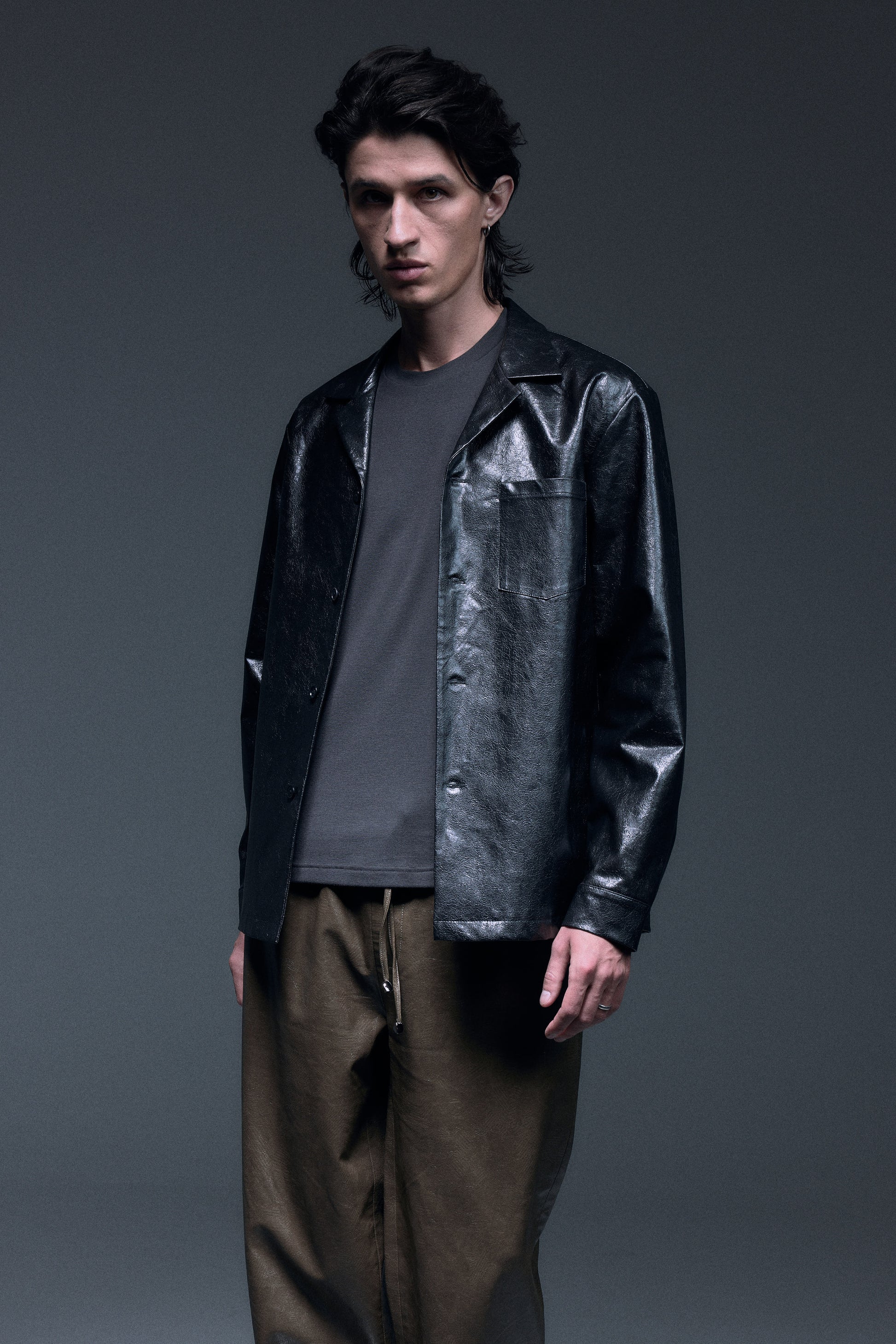 This contemporary unisex vegan leather jacket features a sharp point collar and relaxed fit sleeves, made with special shiny textured vegan leather in black.