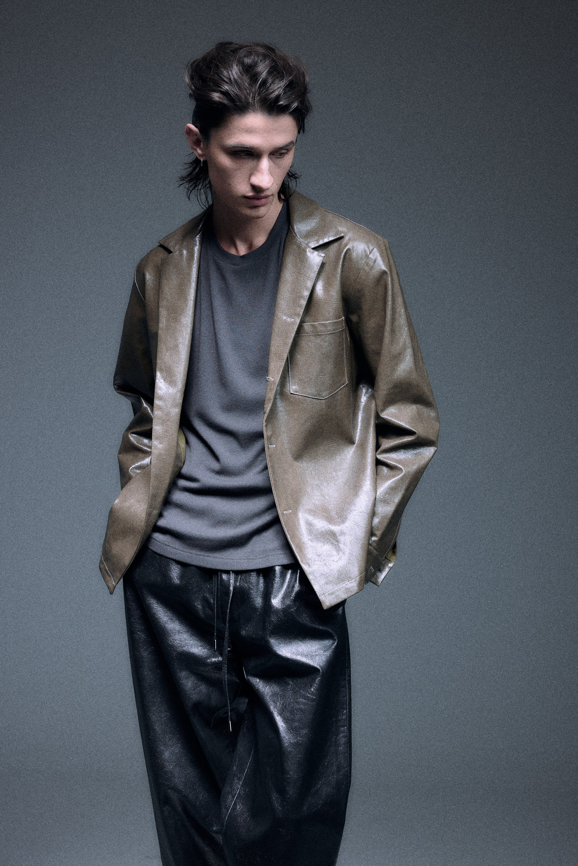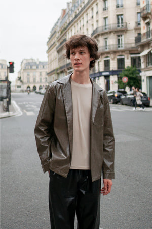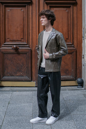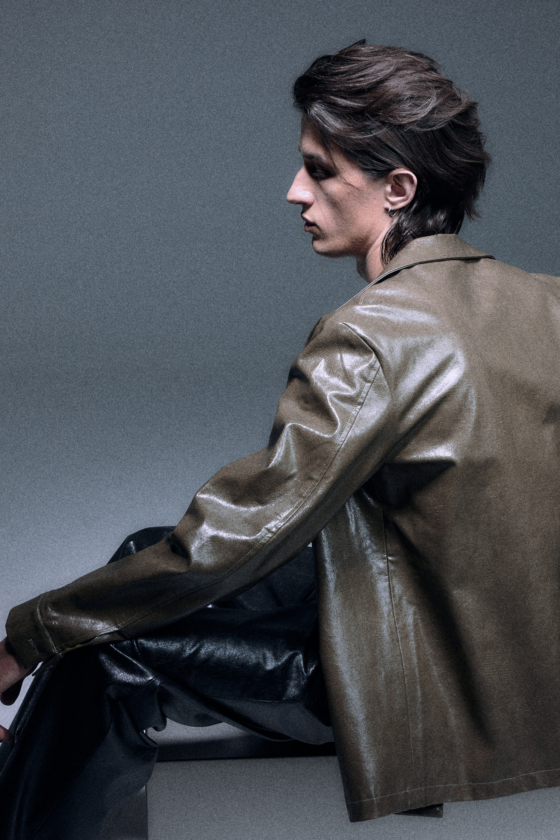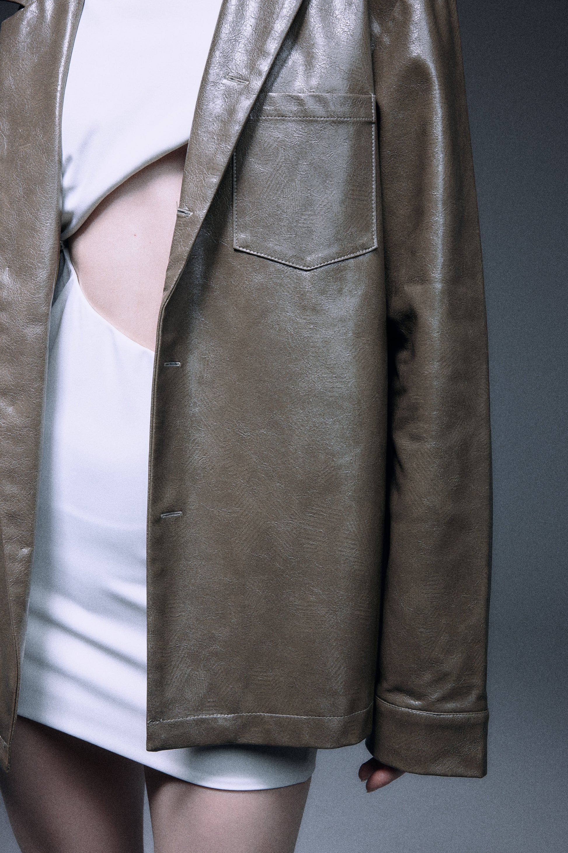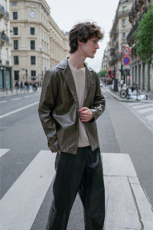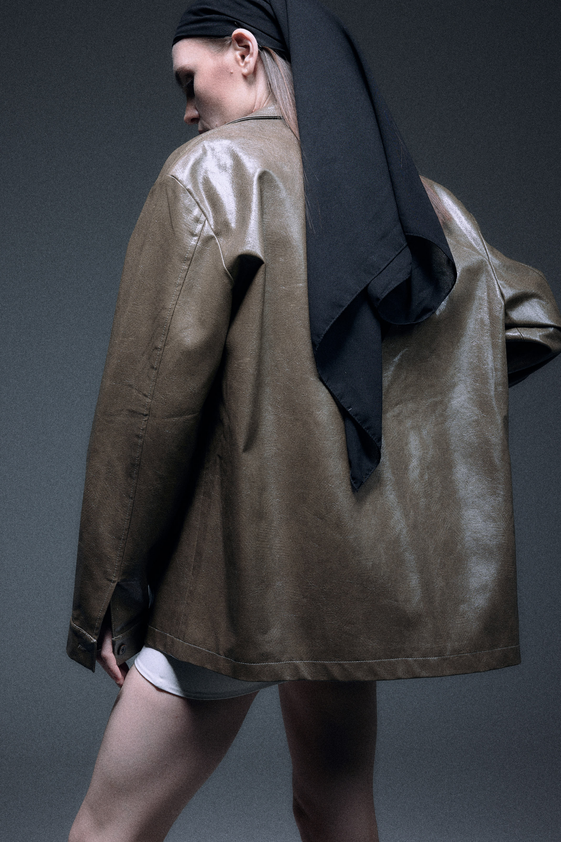 This contemporary unisex vegan leather jacket features a sharp point collar and relaxed fit sleeves, made with special shiny textured vegan leather in subtle olive green.
