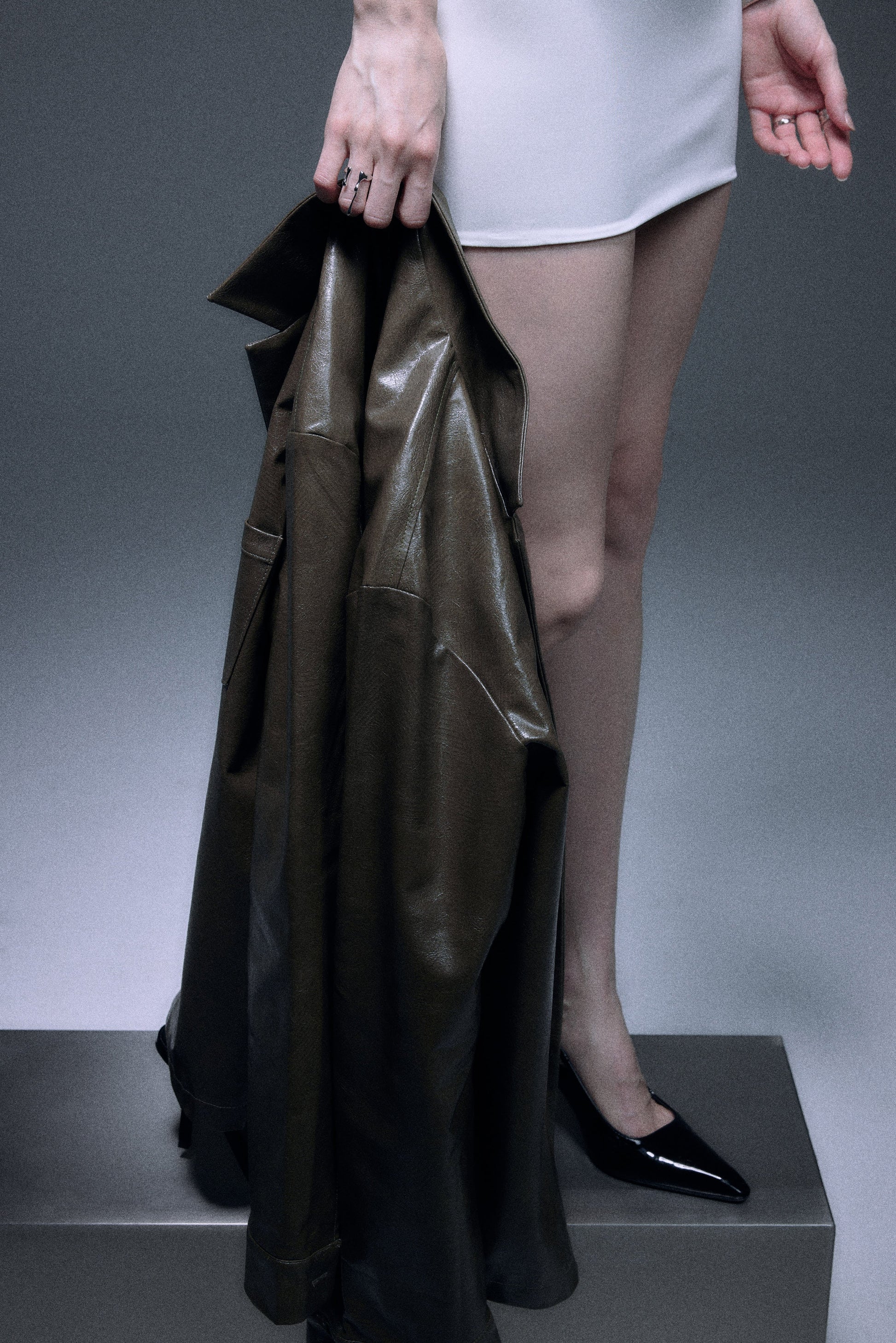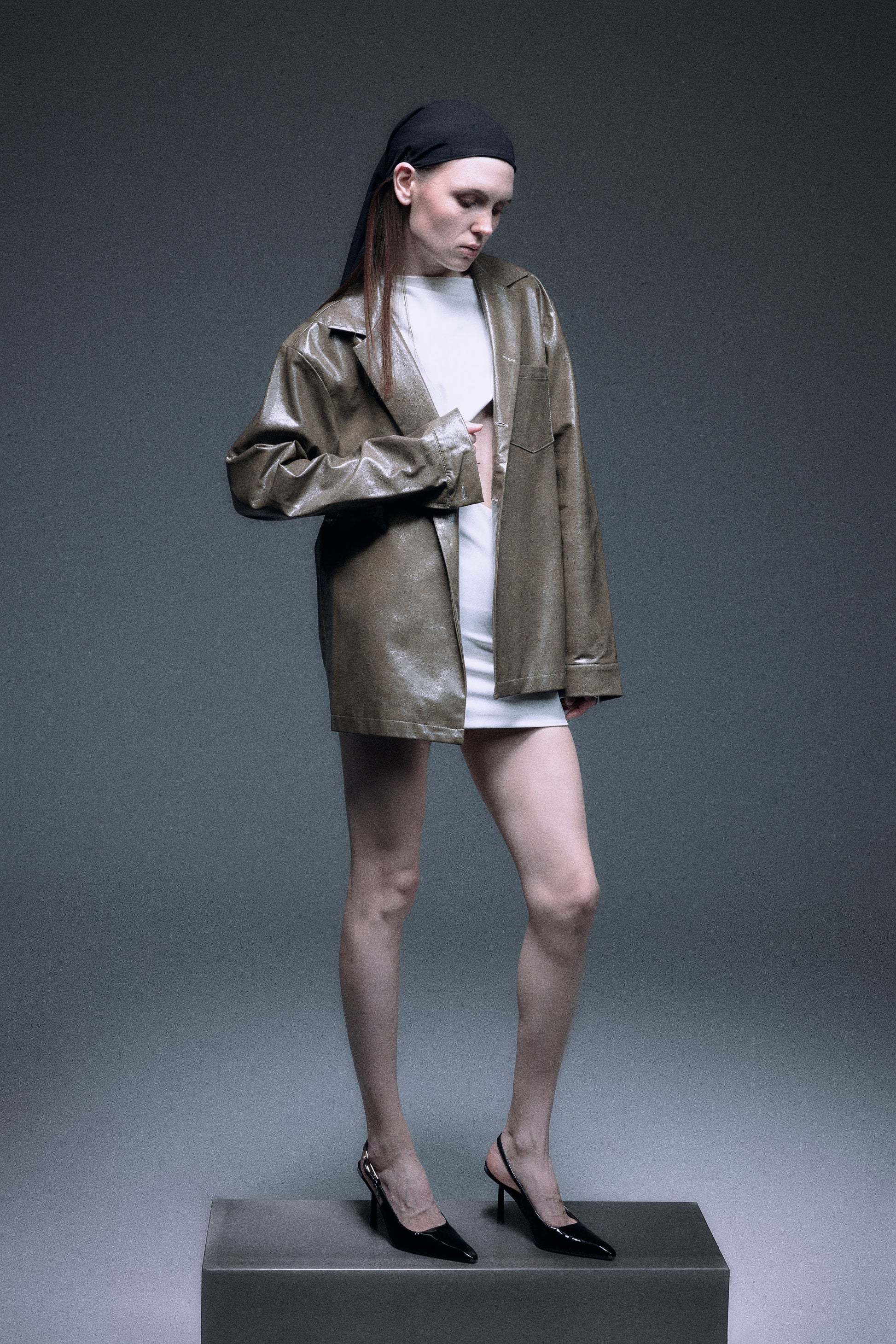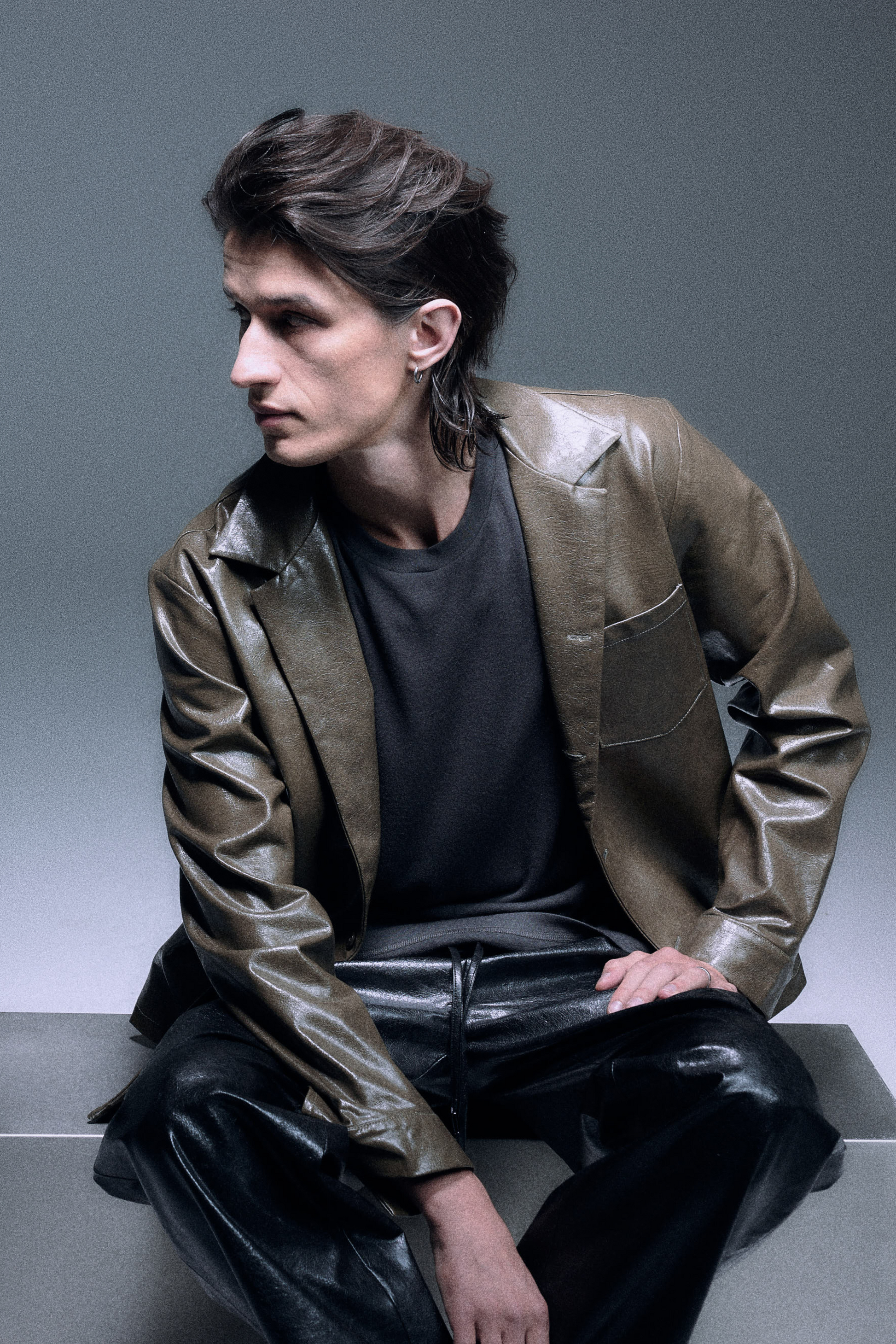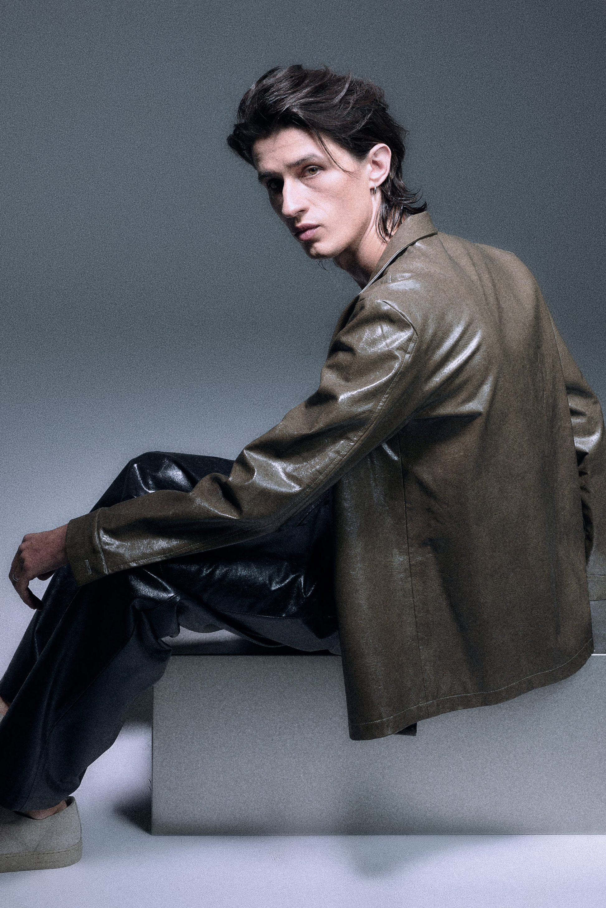 This contemporary unisex vegan leather jacket features a sharp point collar and relaxed fit sleeves, made with special shiny textured vegan leather in subtle olive green.
