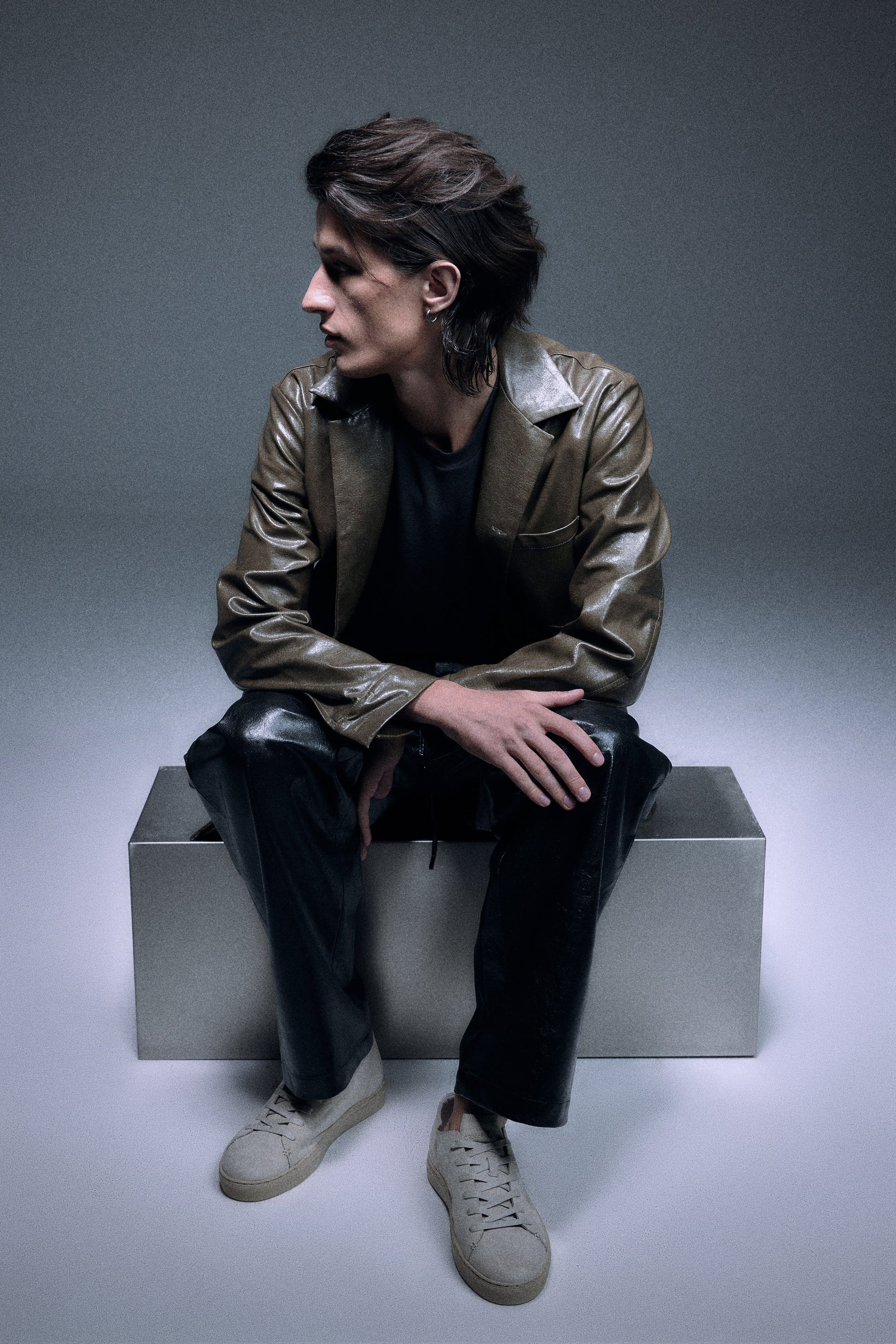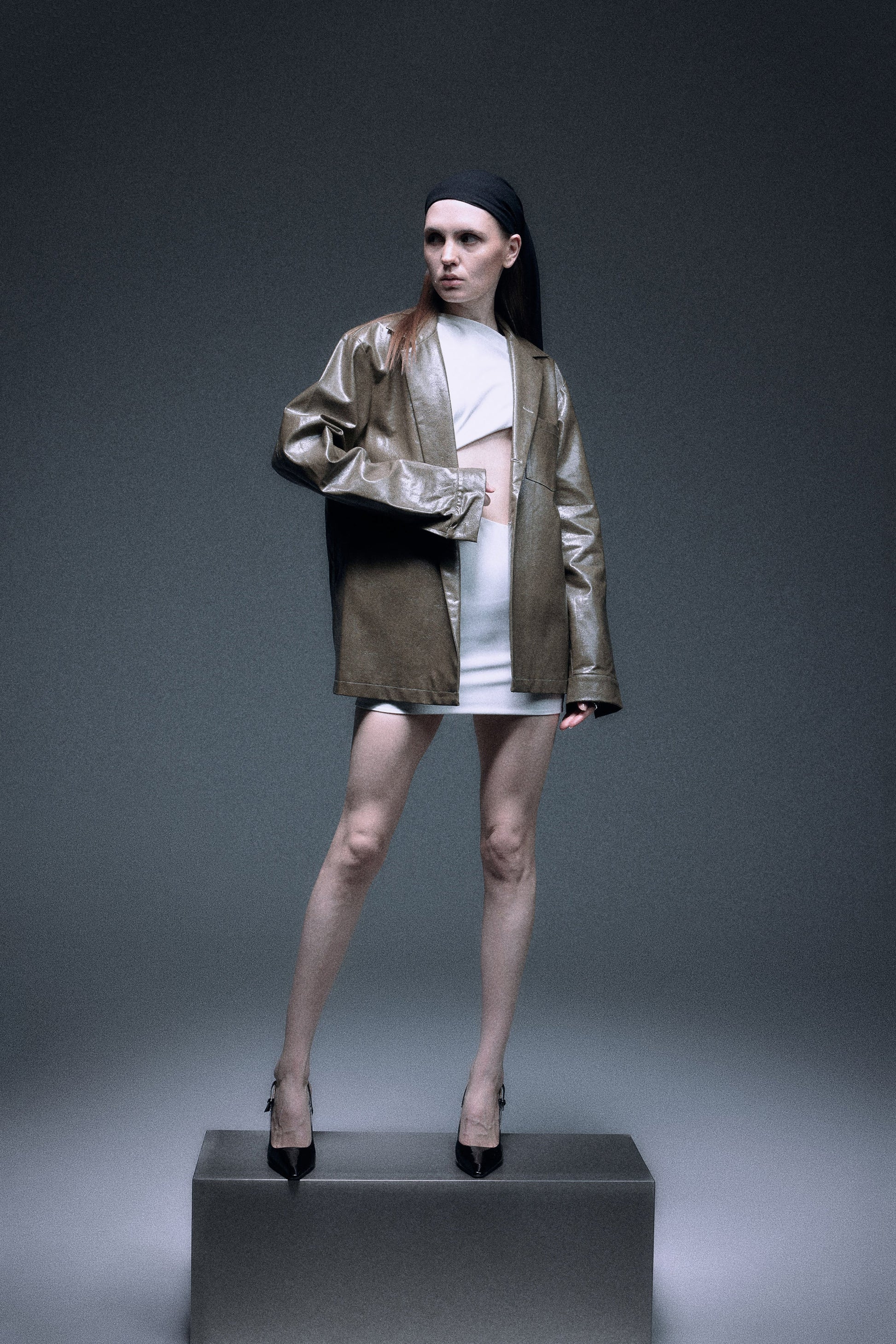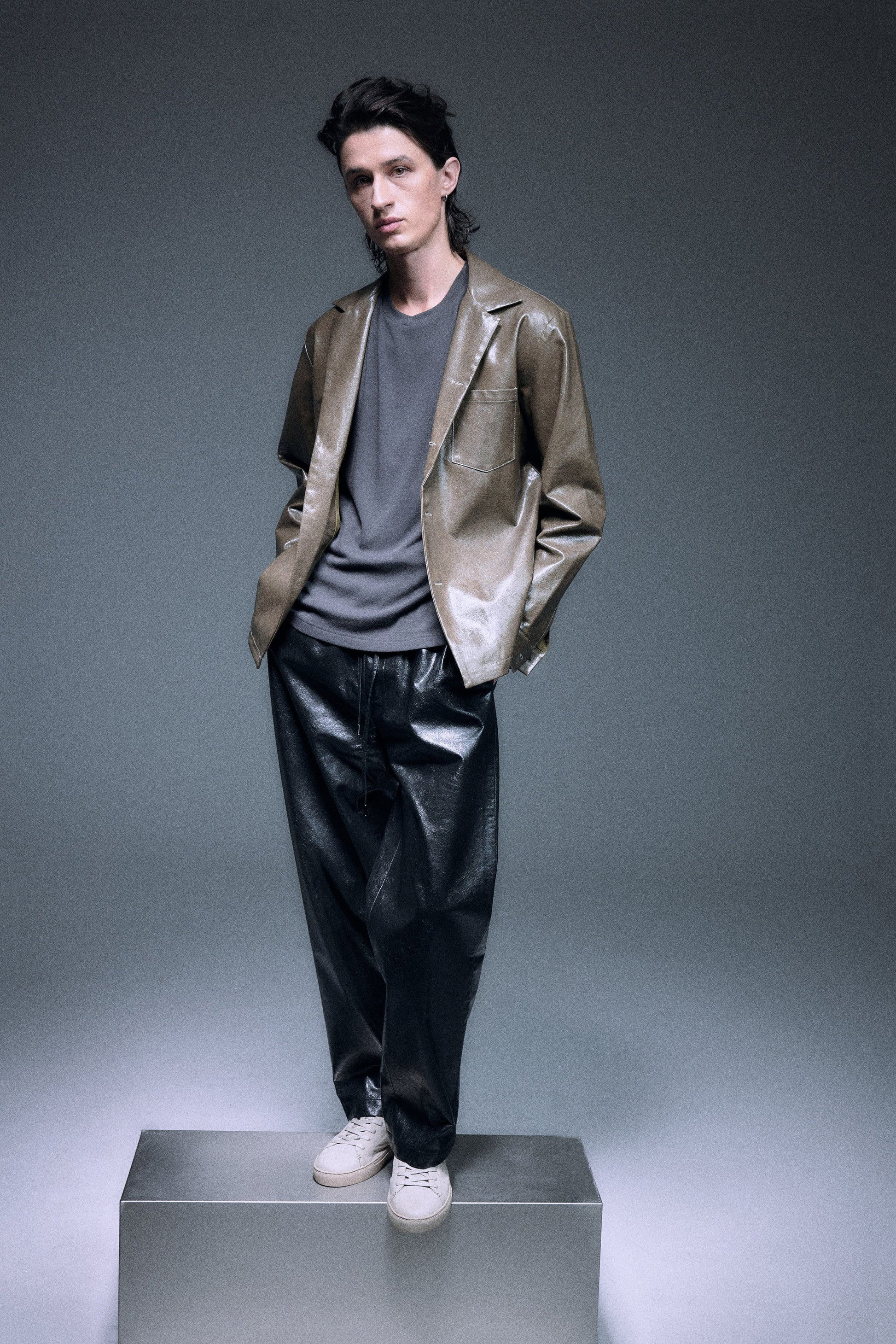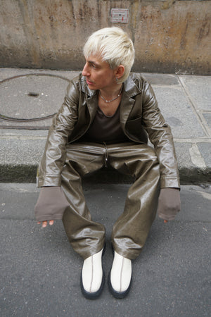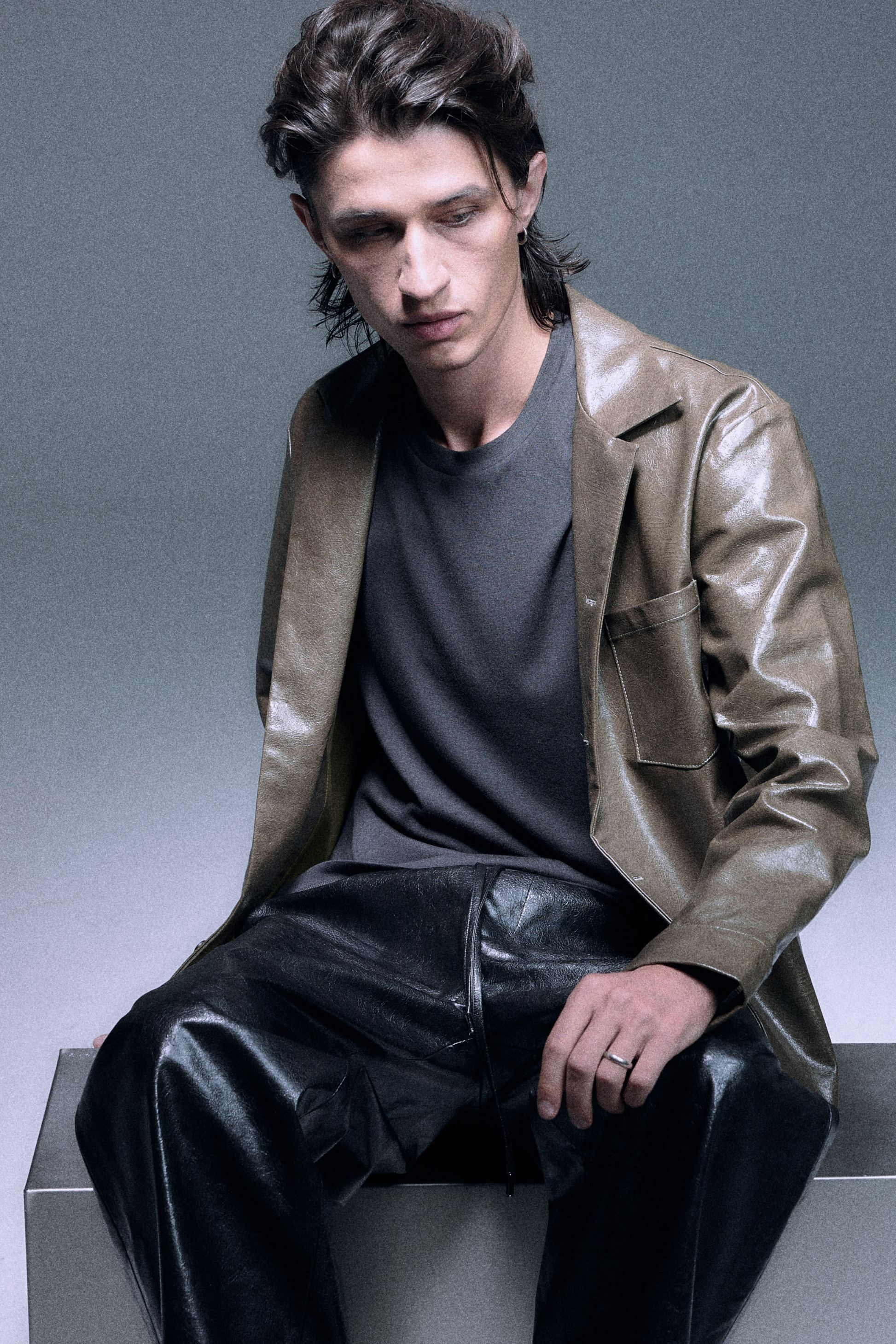 This contemporary unisex vegan leather jacket features a sharp point collar and relaxed fit sleeves, made with special shiny textured vegan leather in subtle olive green.