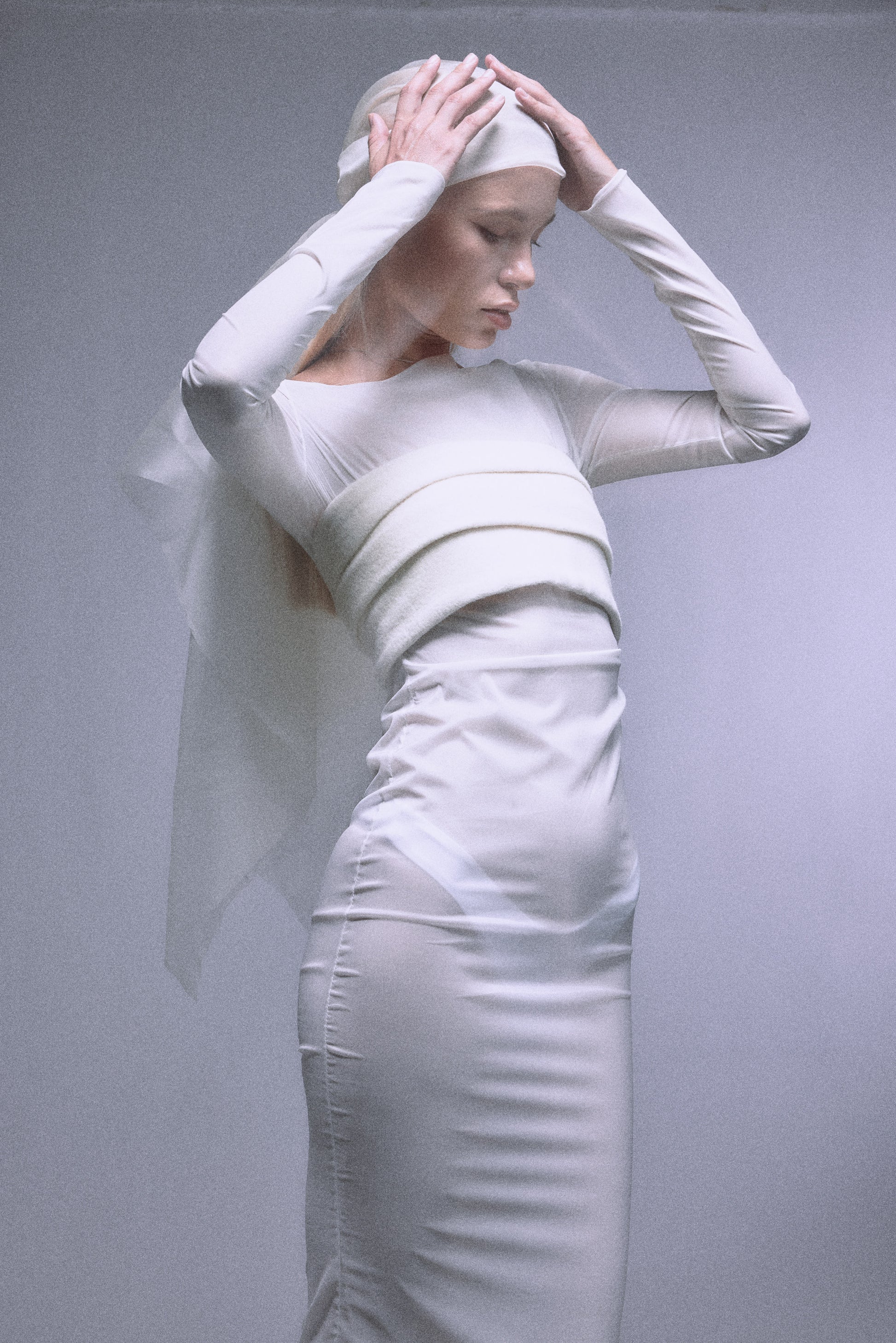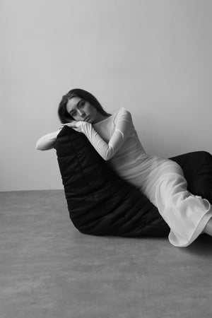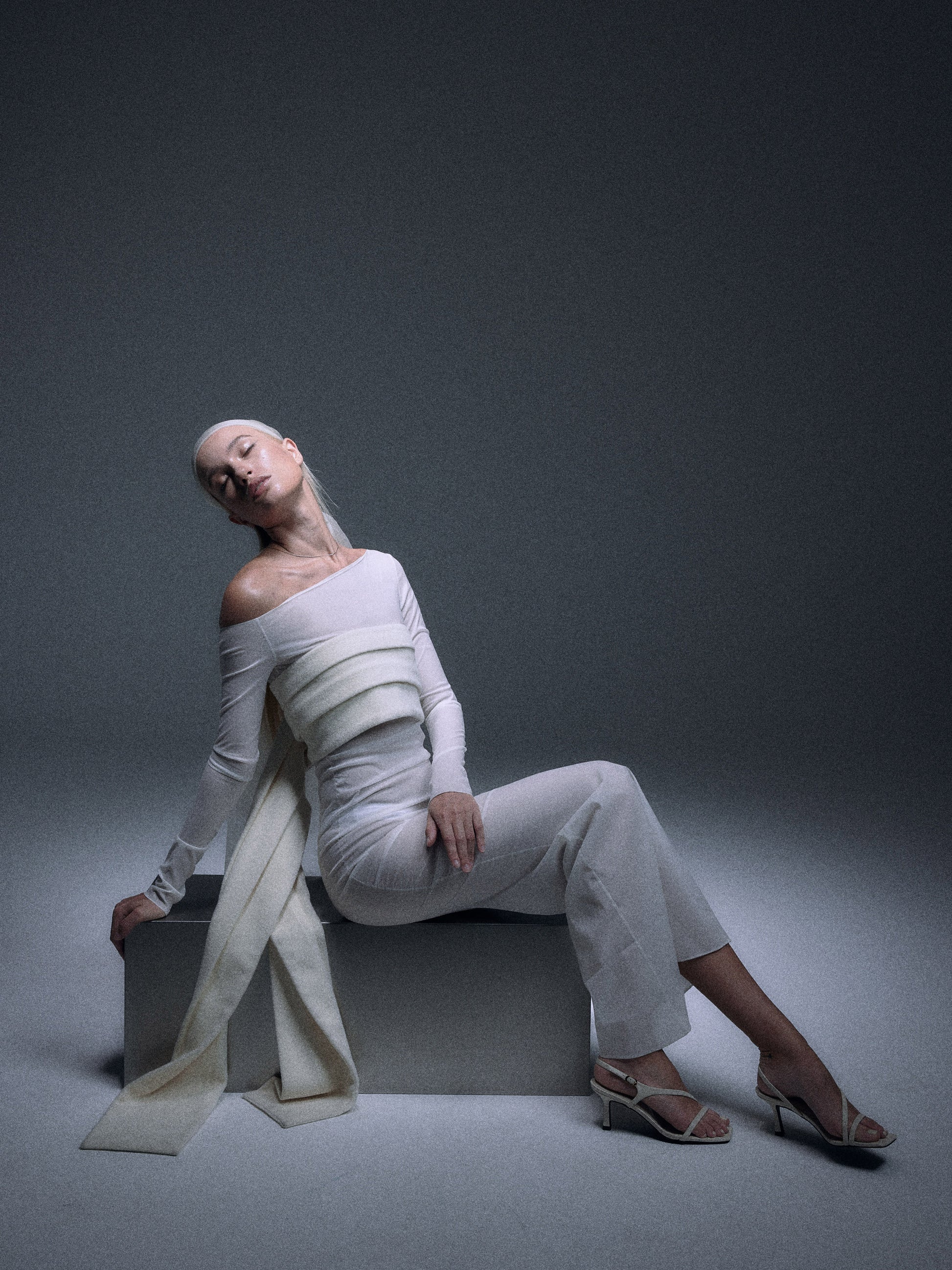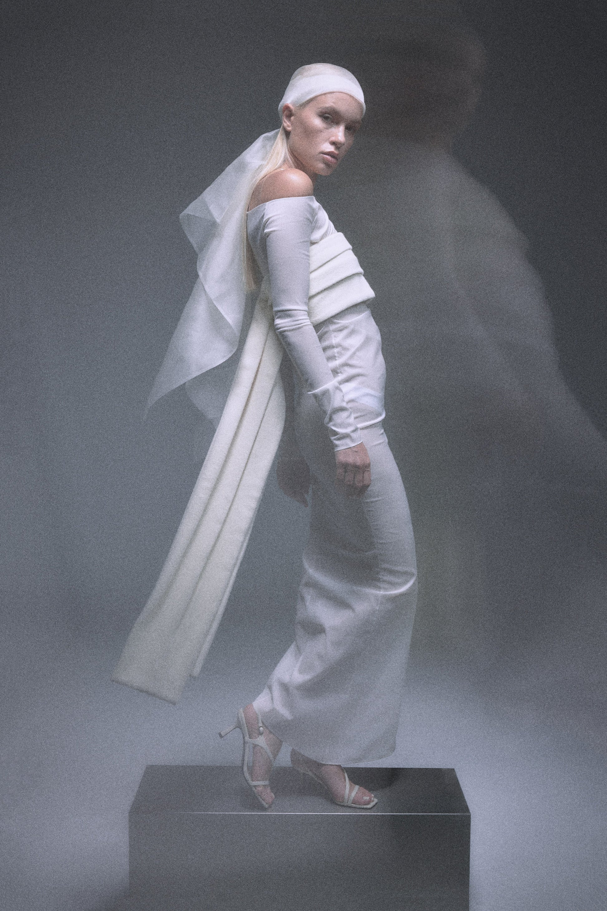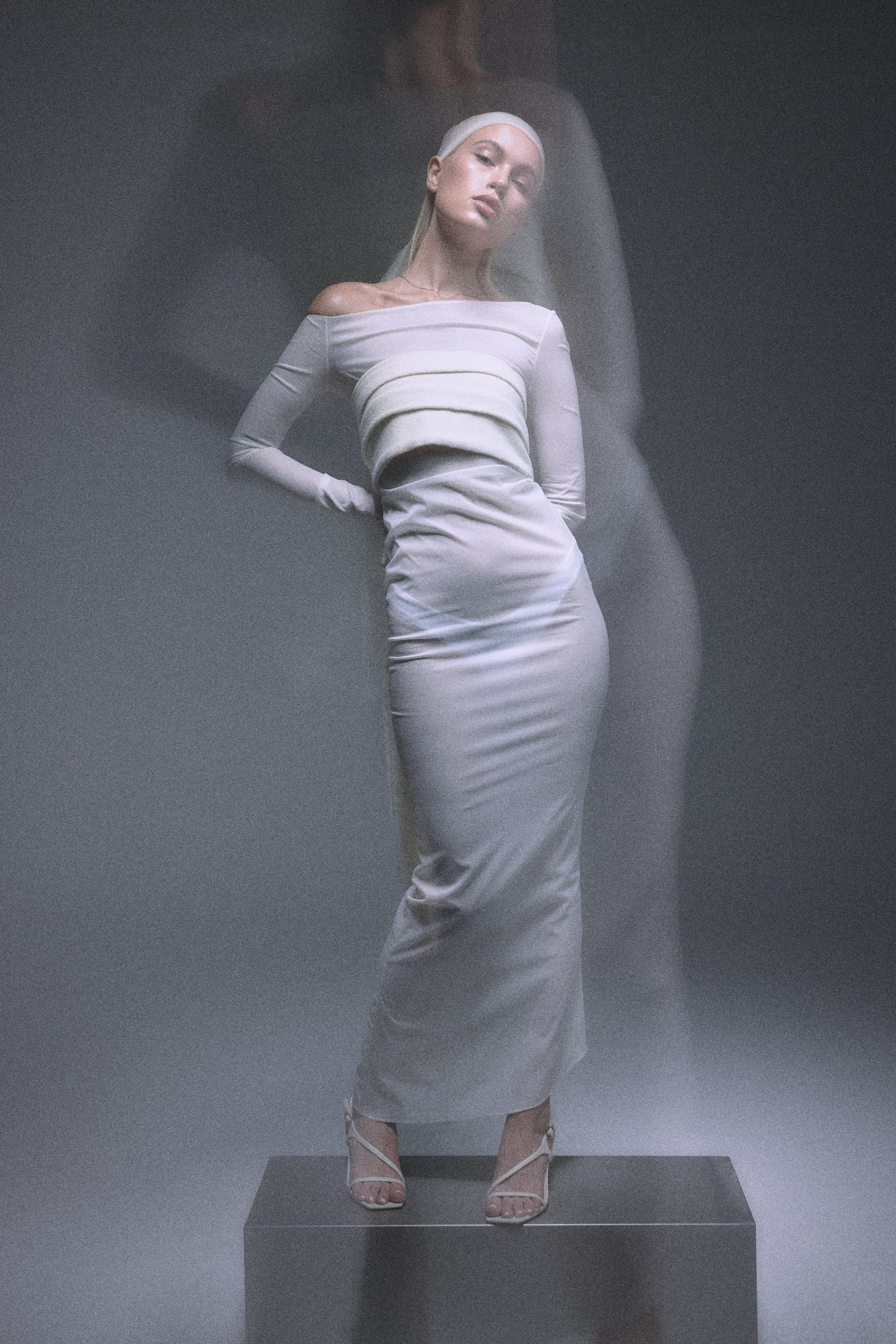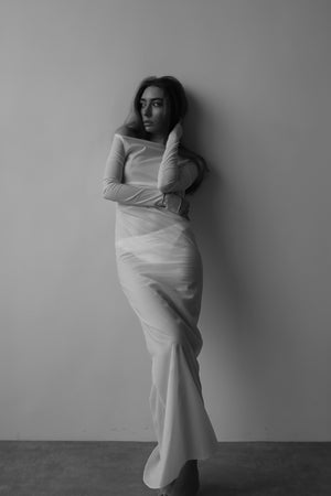 The DÉSIR one-shoulder long dress is made in subtle sheer material in creamy white, designed with pleats on one side of the waist line and one-side sliding mermaid dress bottom to create the silhouette.