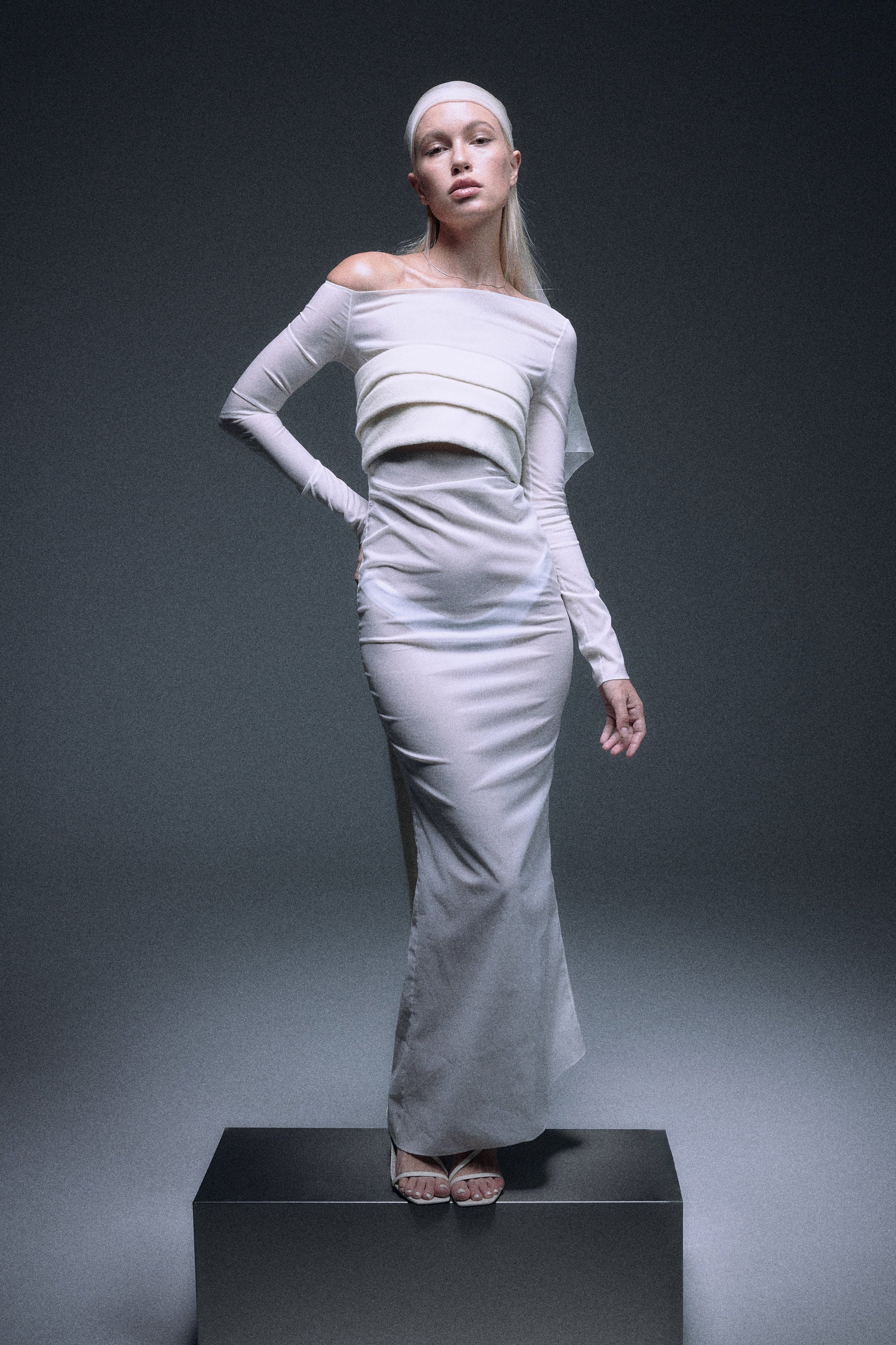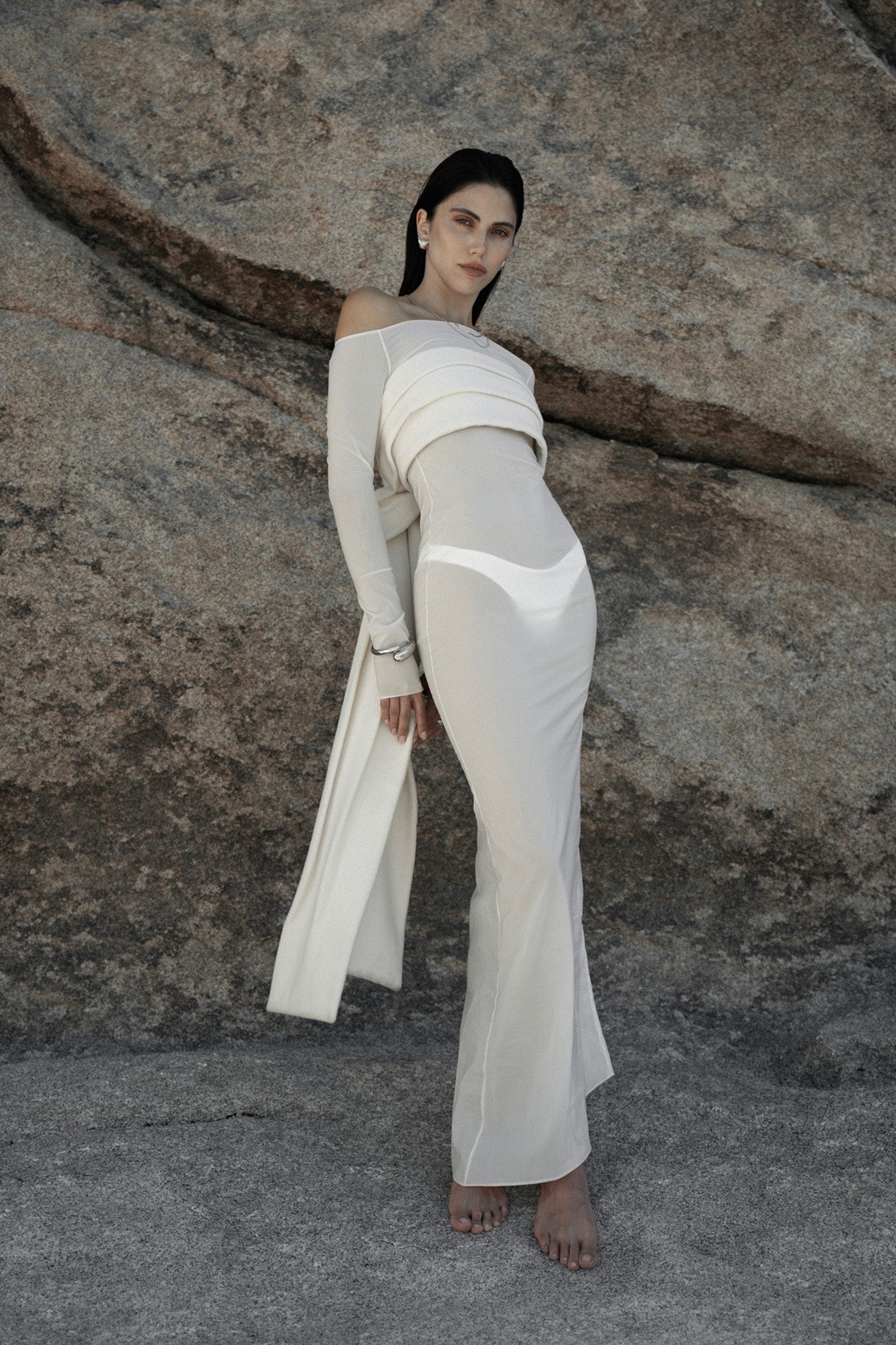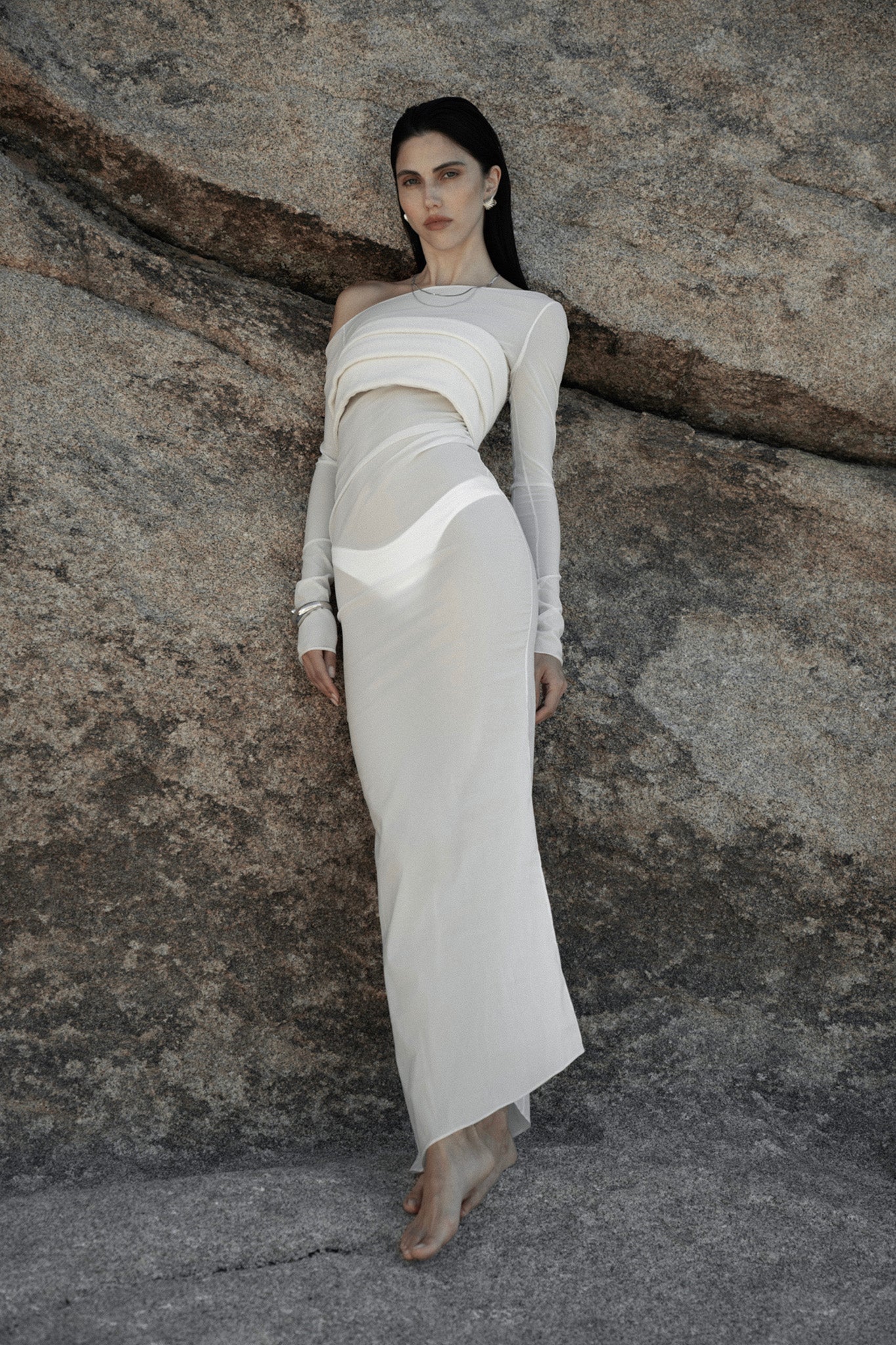 sheer one shoulder long dress in cream
