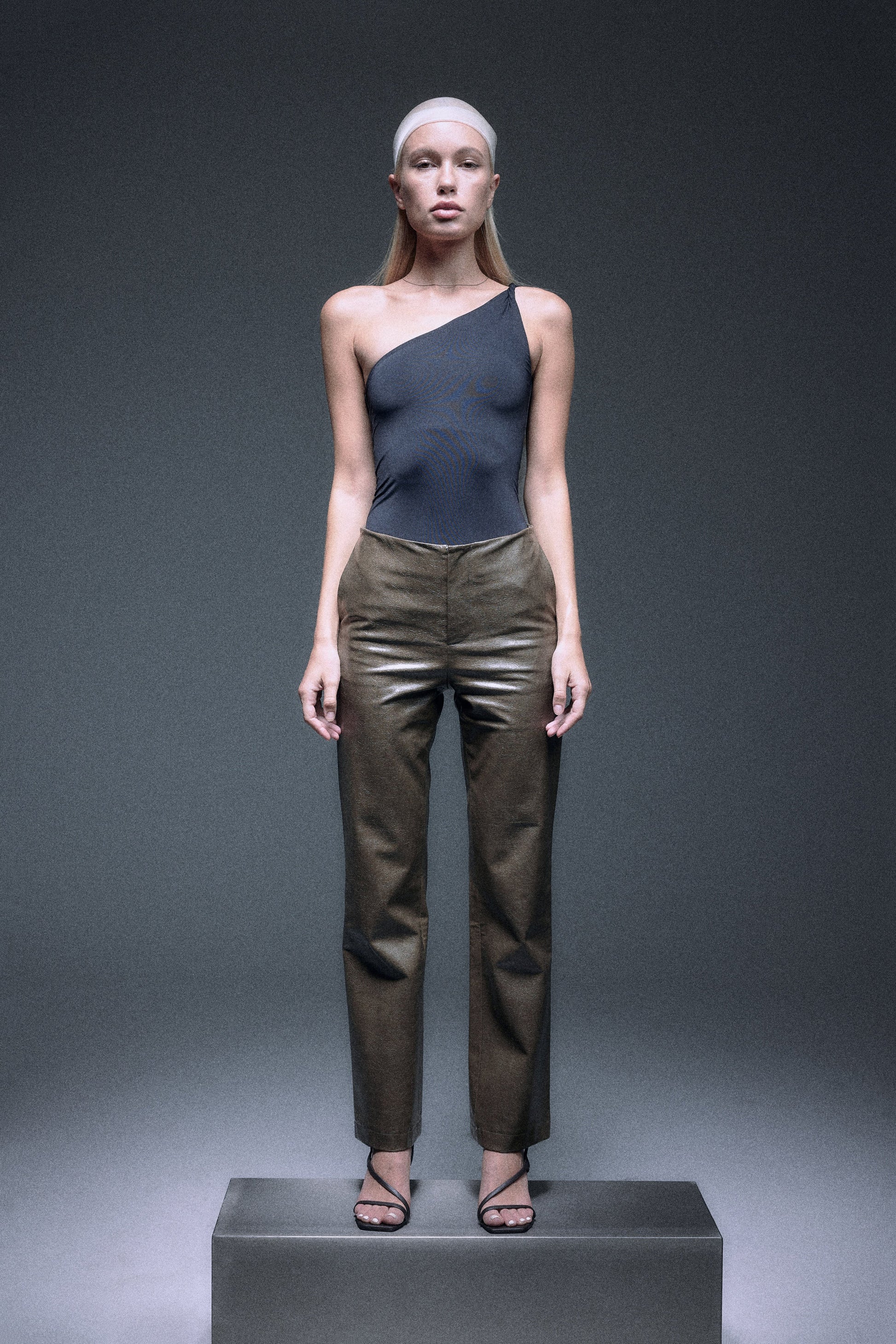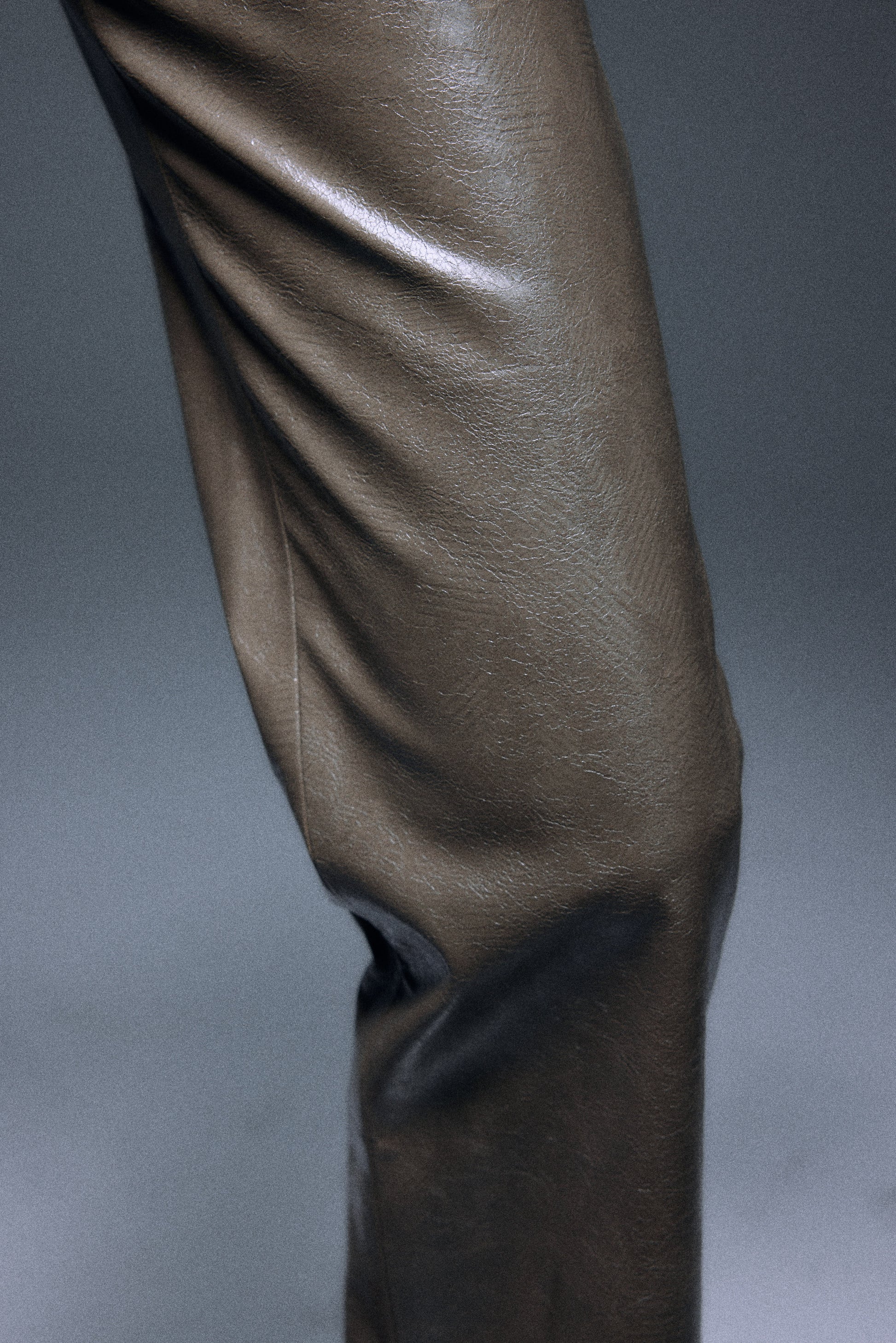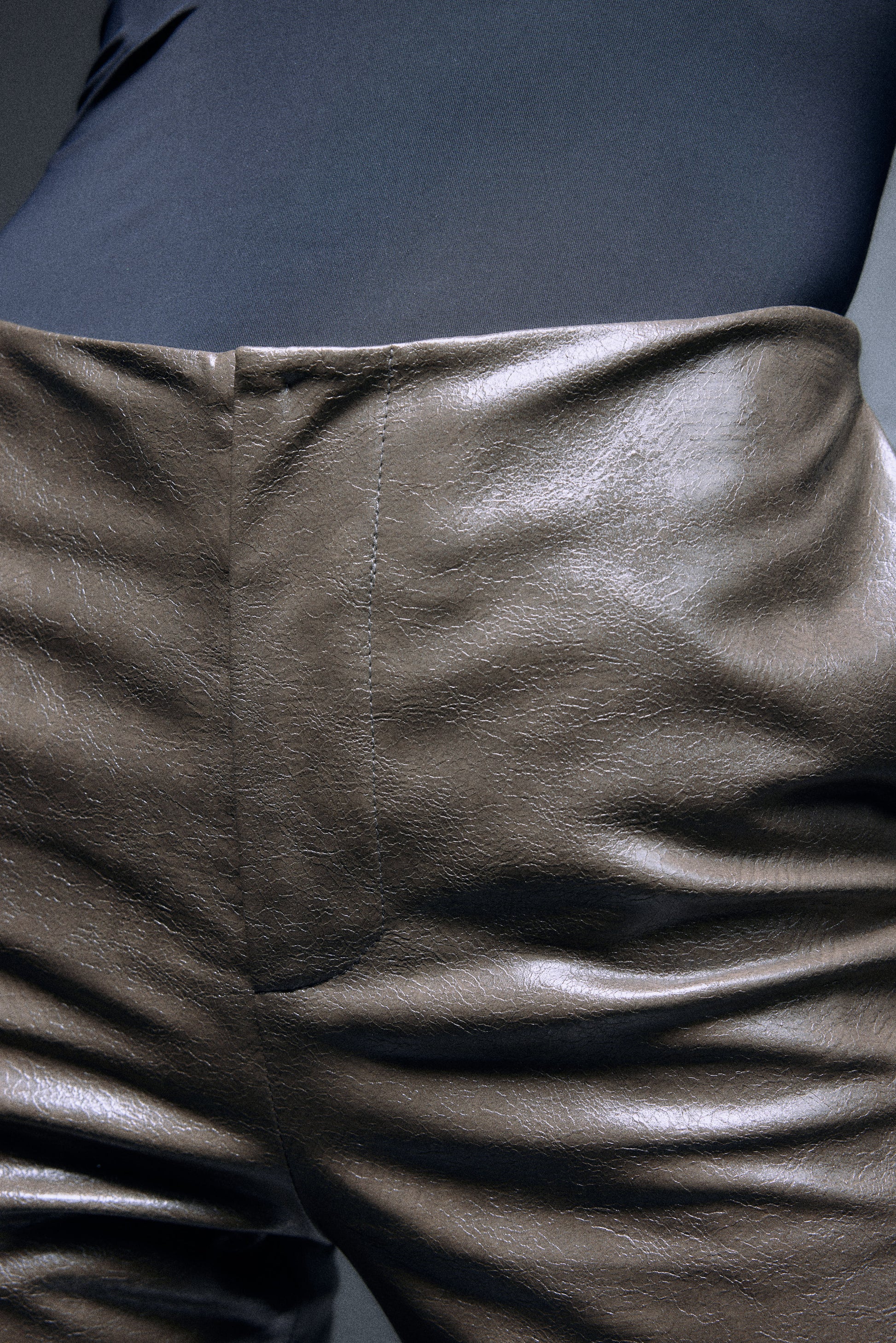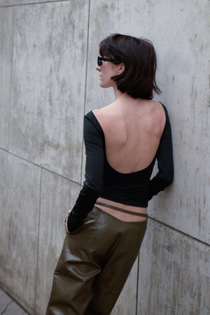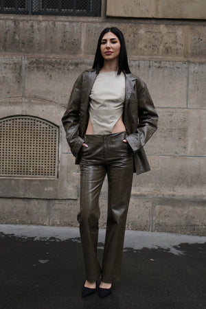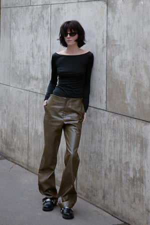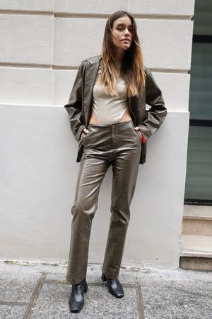 The PLAISIR slim fit straight pants is made with special textured vegan leather in subtle olive green, mid-waisted and designed with triangle cutout in back to illustrate sensual silhouette.