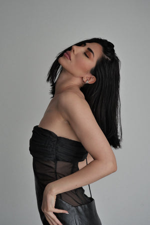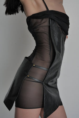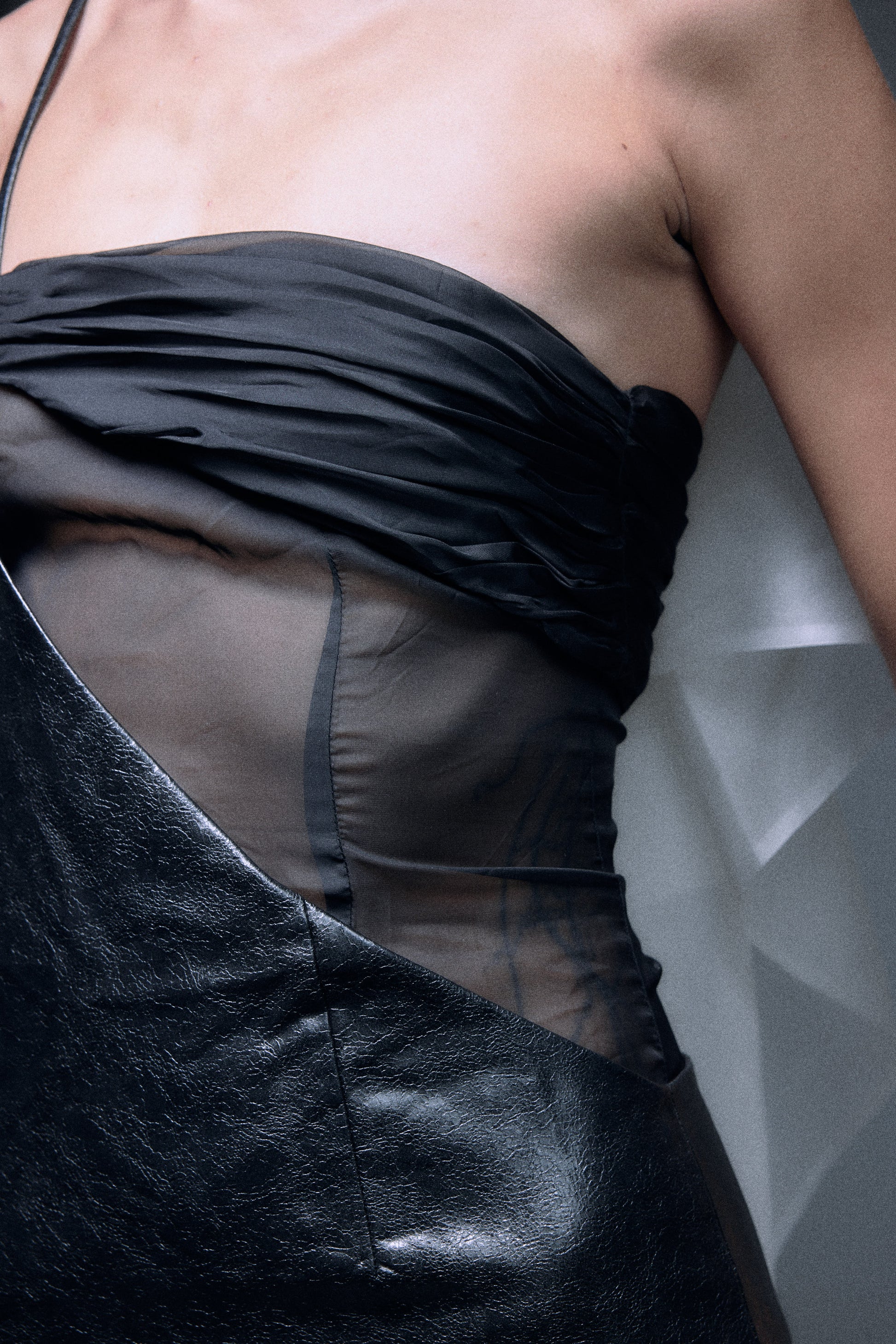 The SENSATION mini dress is designed in collage of sheer chiffon and special textured shiny vegan leather.