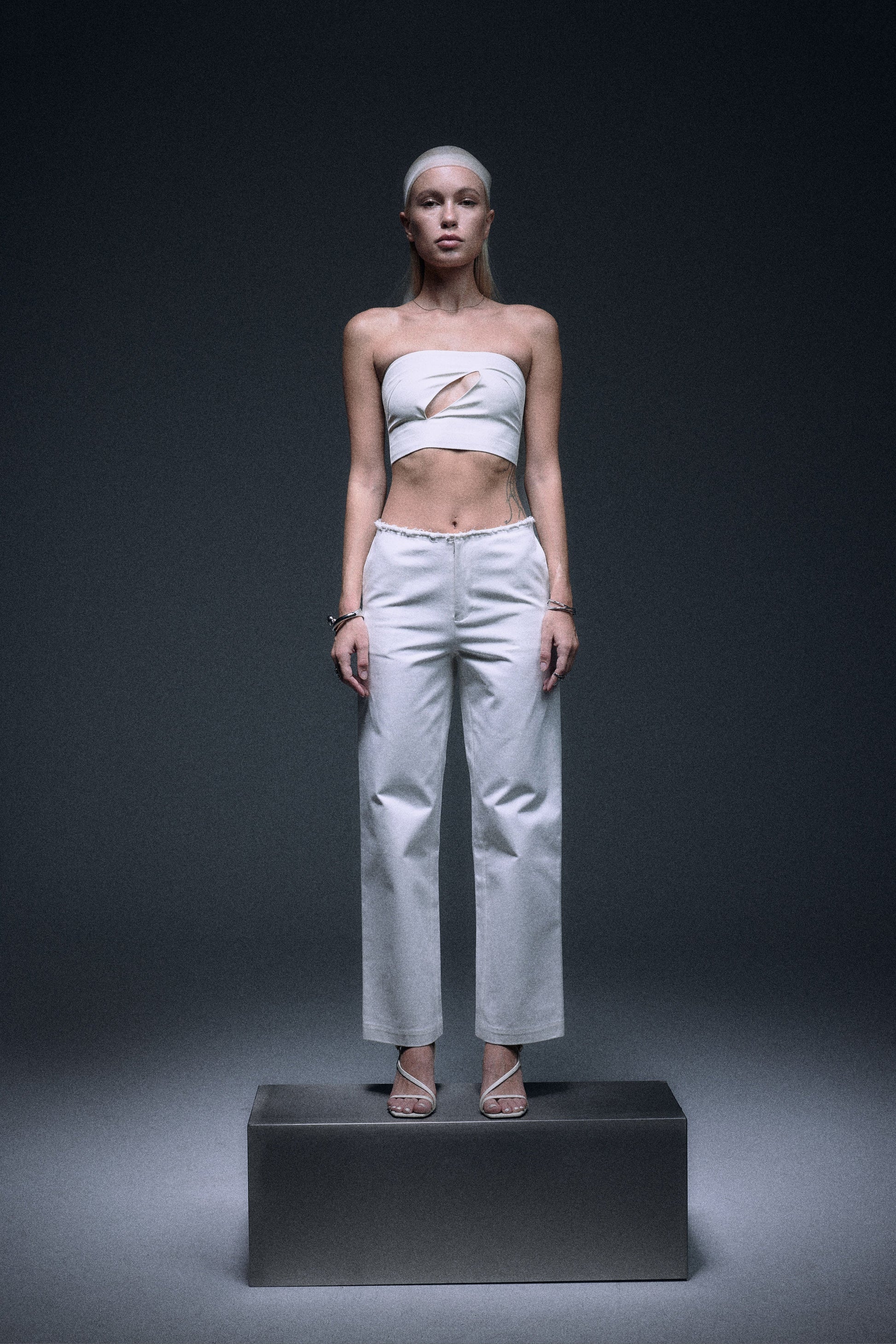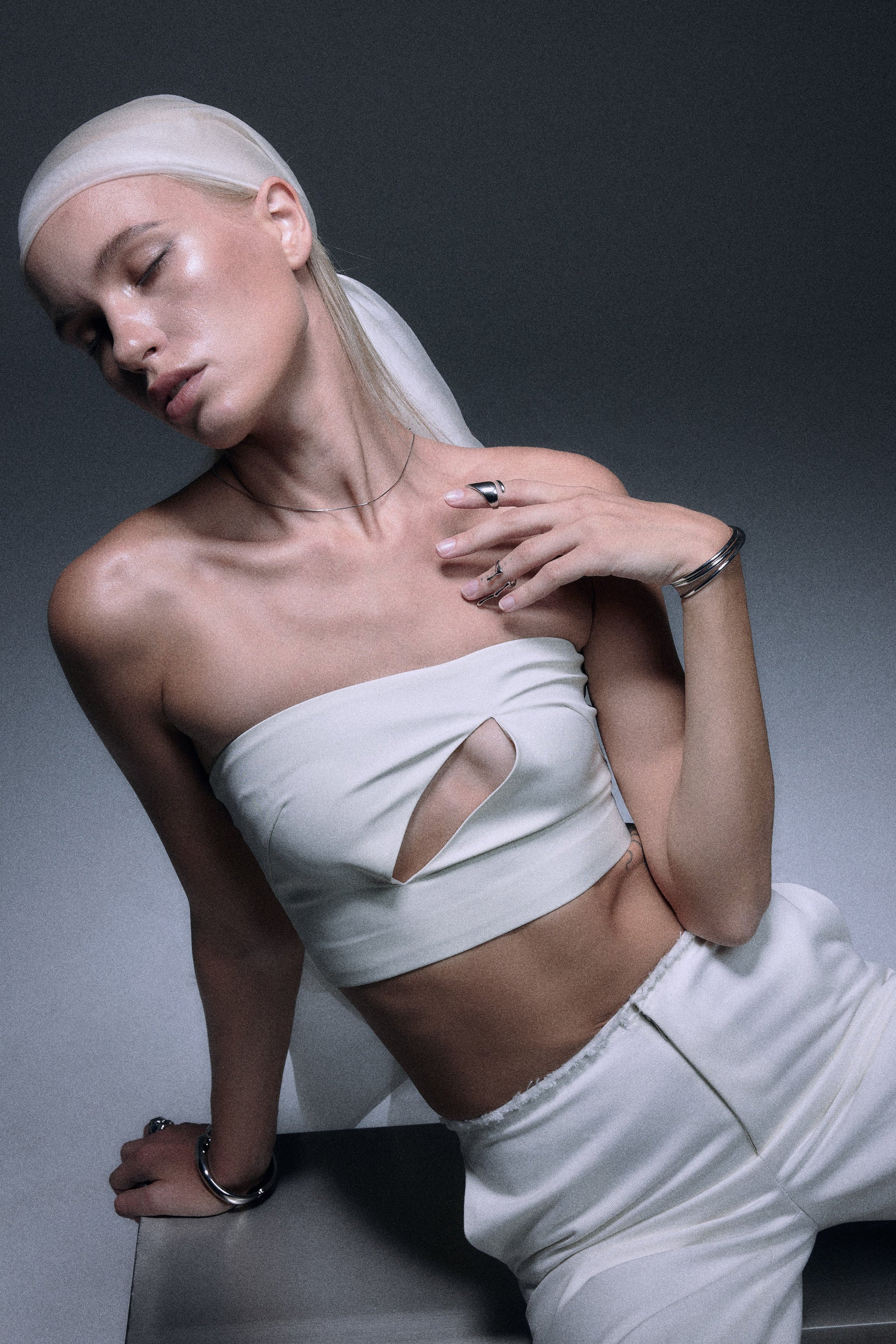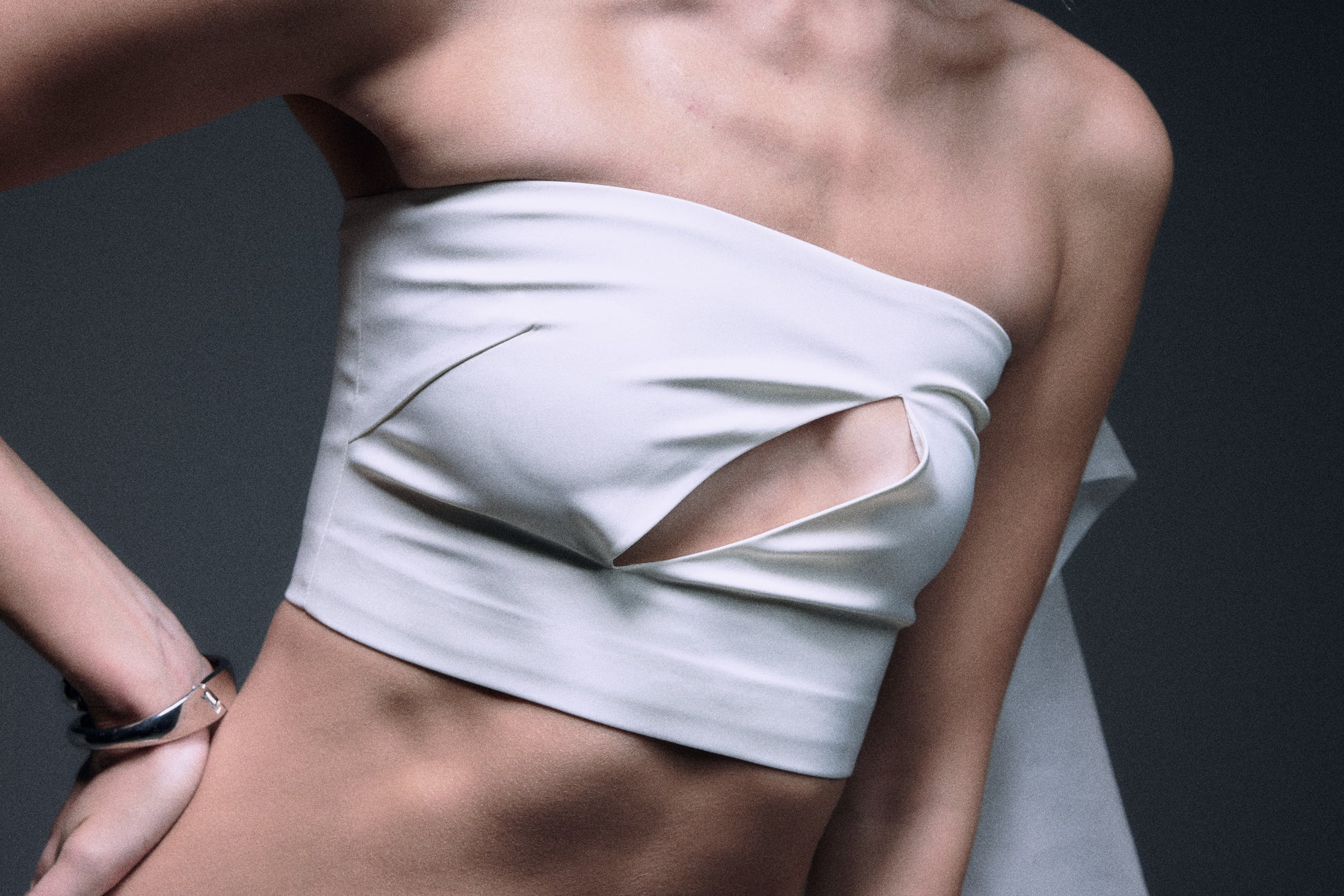 The TENSION bust cutout bra top is inspired by Fontana's masterpiece, perfectly fits to the body shape to illustrate sexy silhouette . Recommended to pair with the TENSION cutout skirt from the same collection.